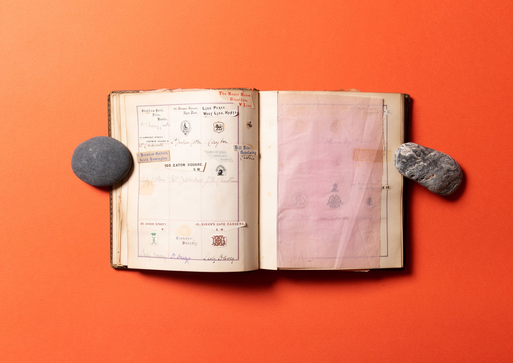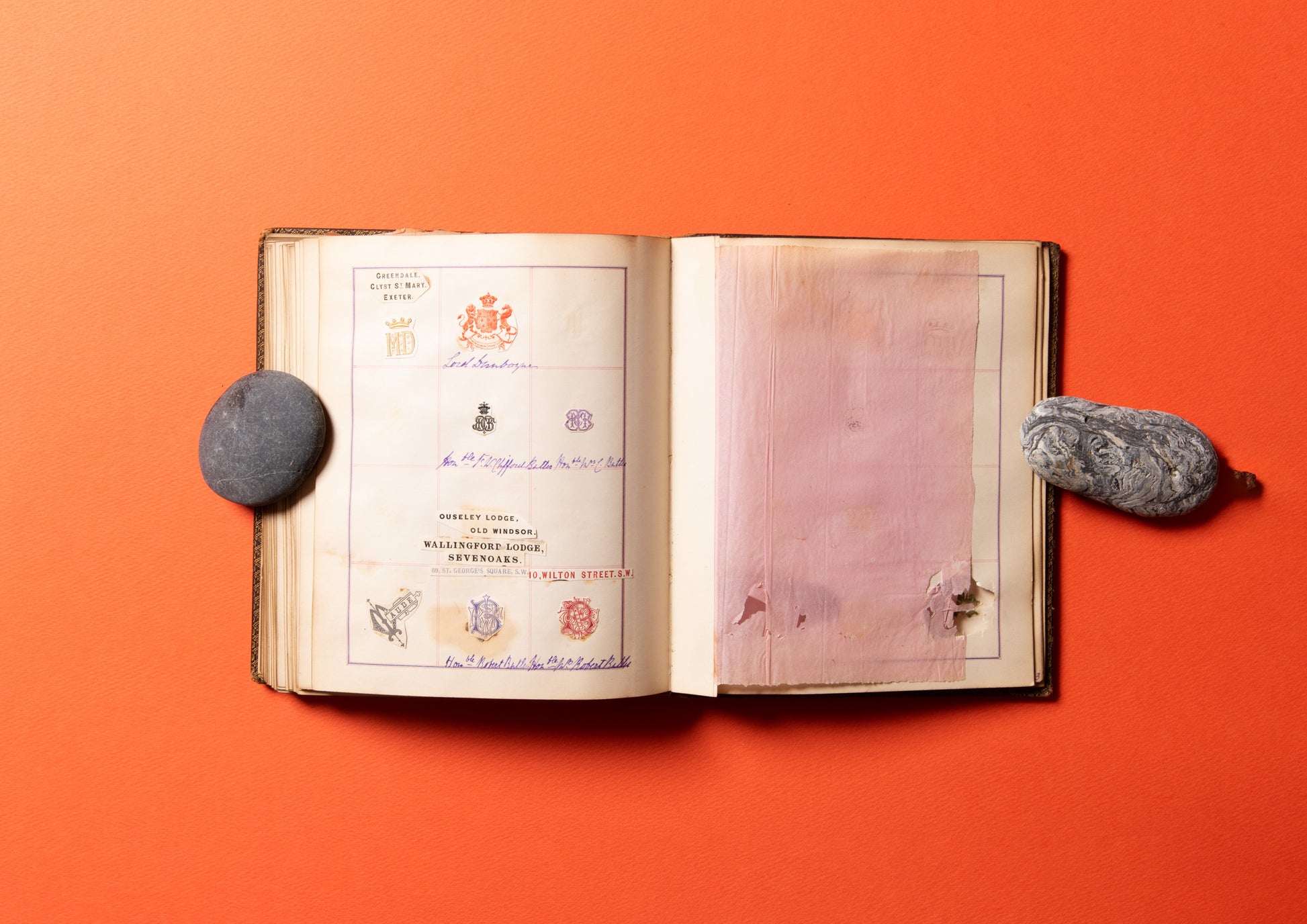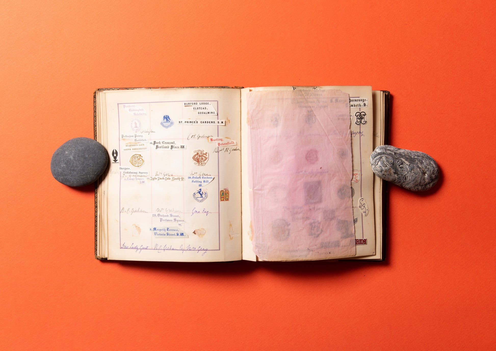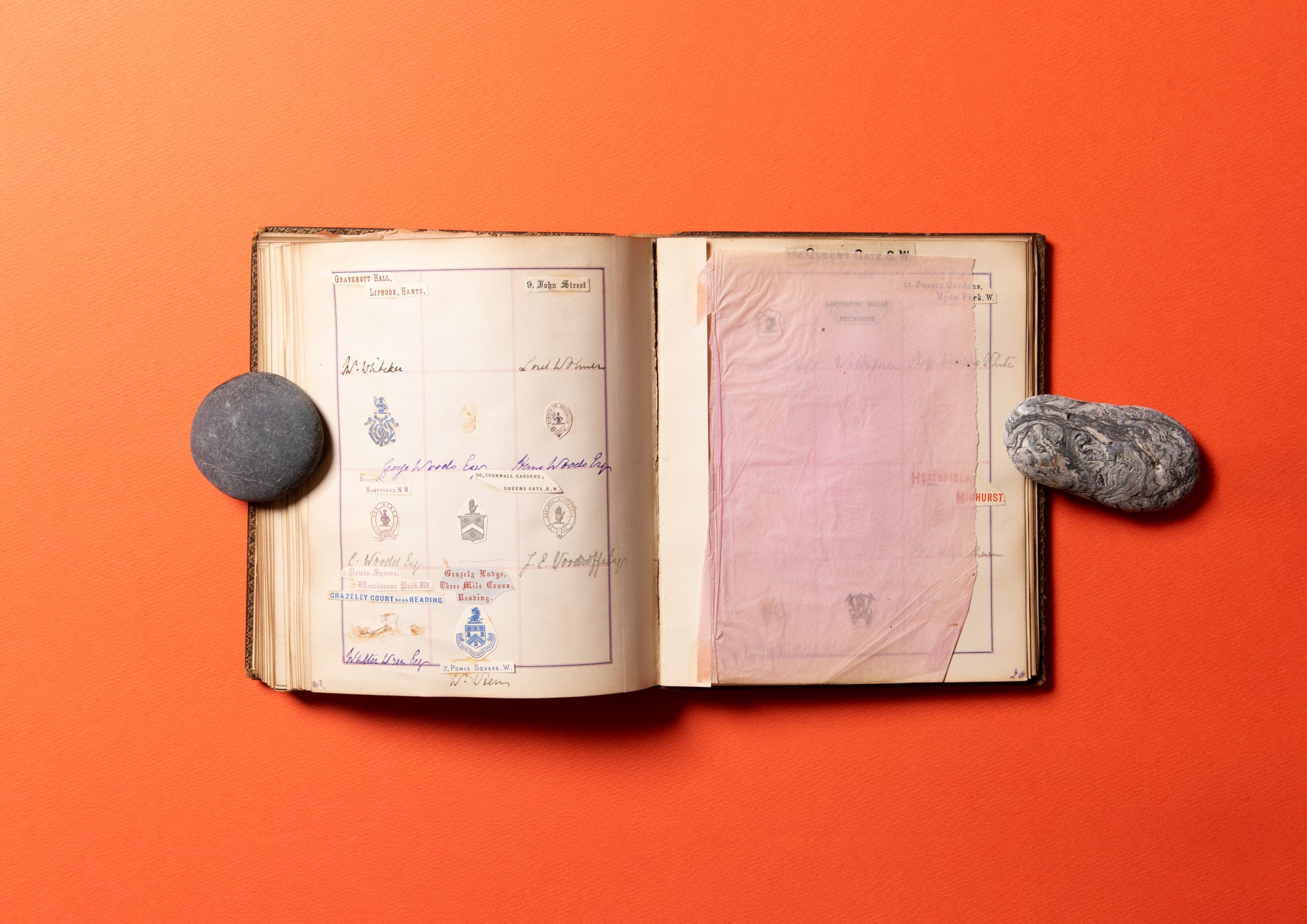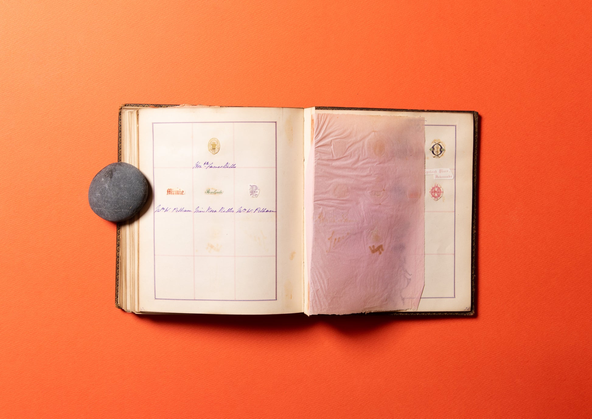 Unique private book with 1,000 monograms and crests based on personal names pasted on it, along with a piece of paper with the address. / 個人名に基づくモノグラムや紋章を住所の紙片とともに貼り込んだ私家本