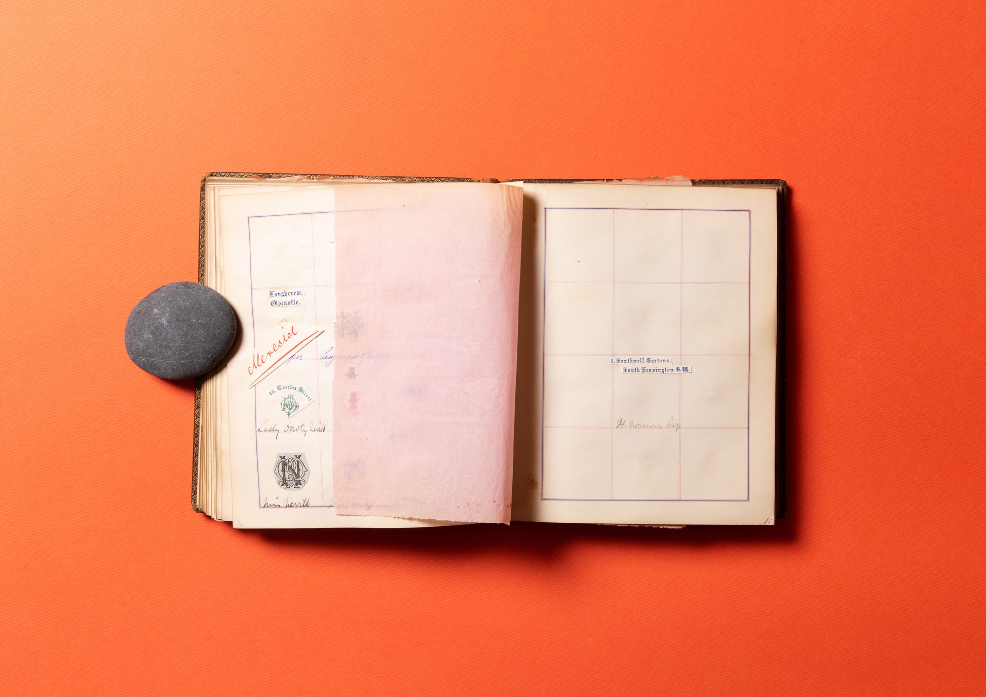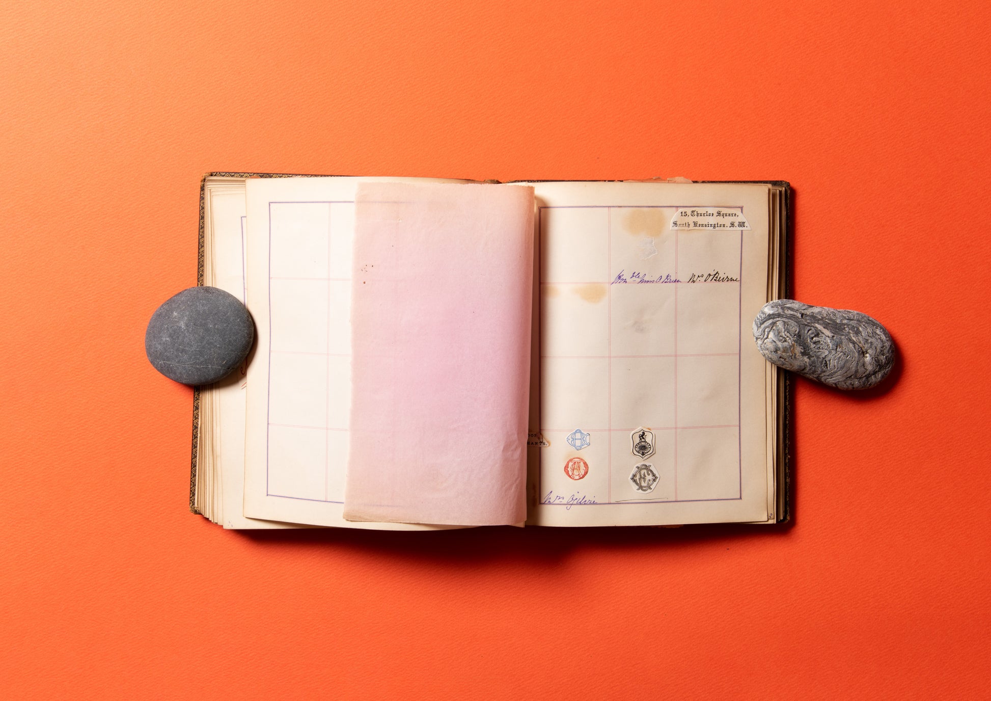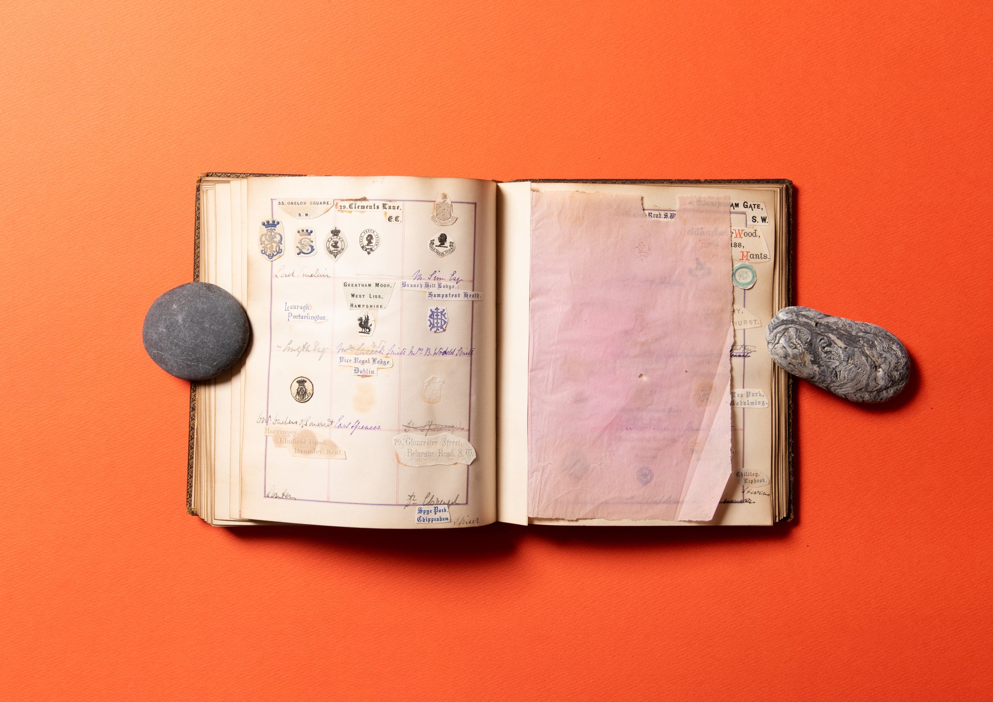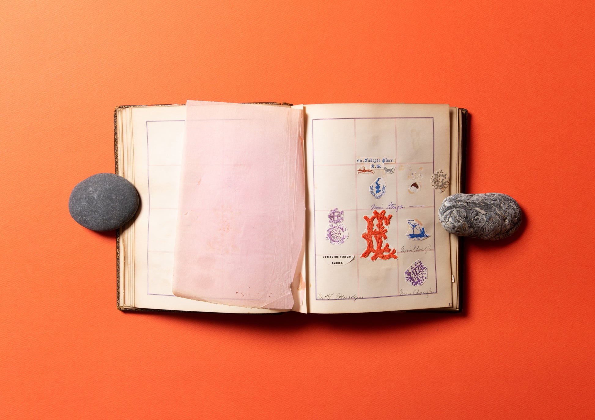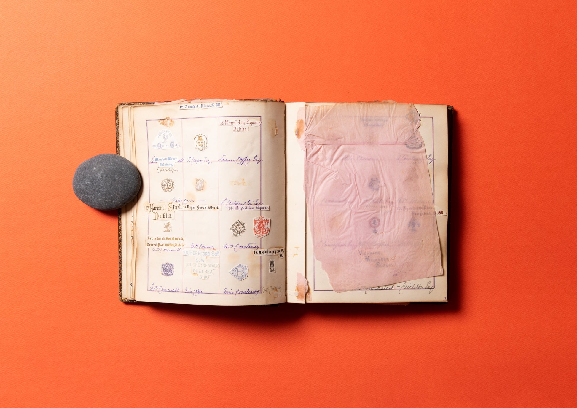 Unique private book with 1,000 monograms and crests based on personal names pasted on it, along with a piece of paper with the address. / 個人名に基づくモノグラムや紋章を住所の紙片とともに貼り込んだ私家本