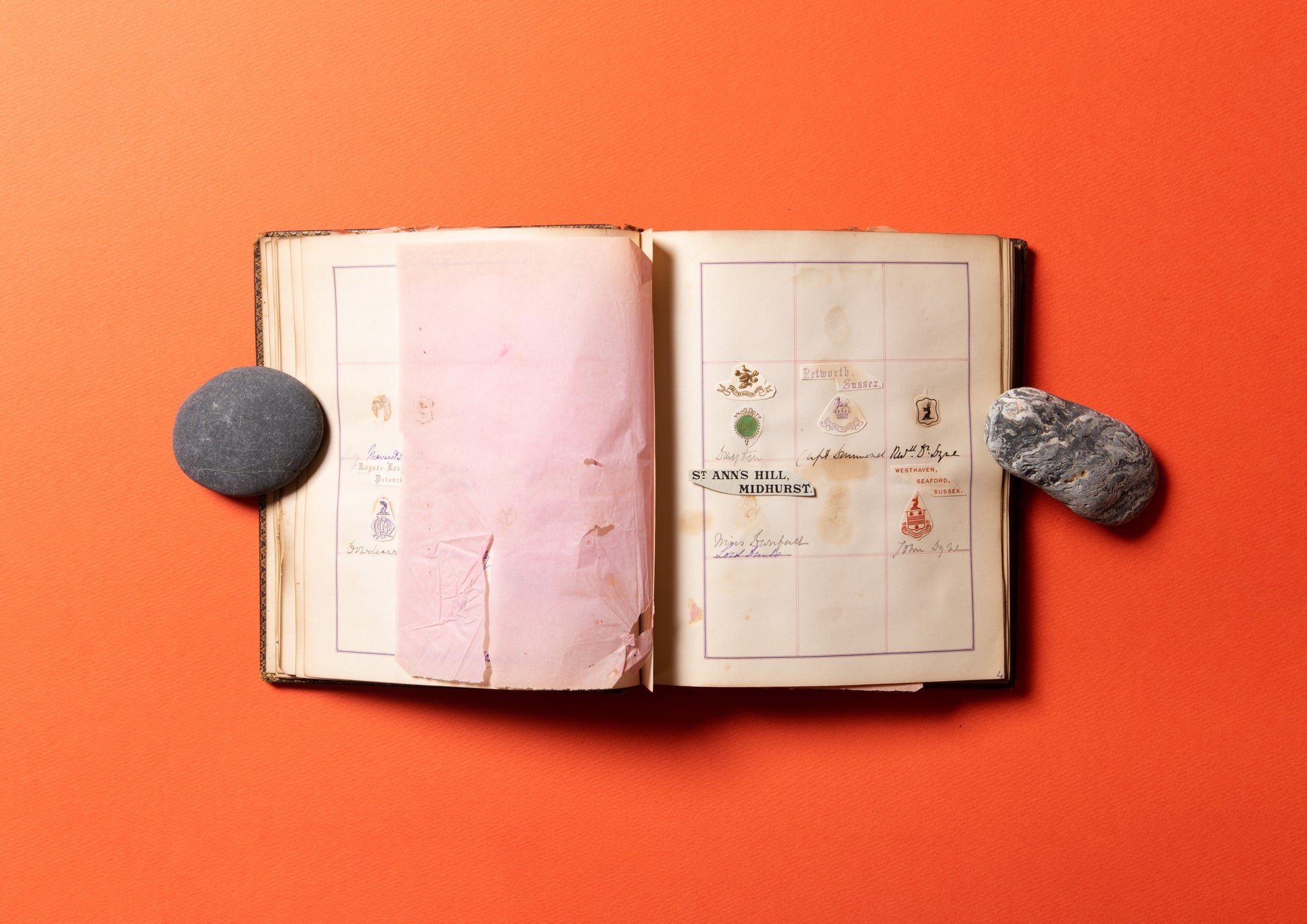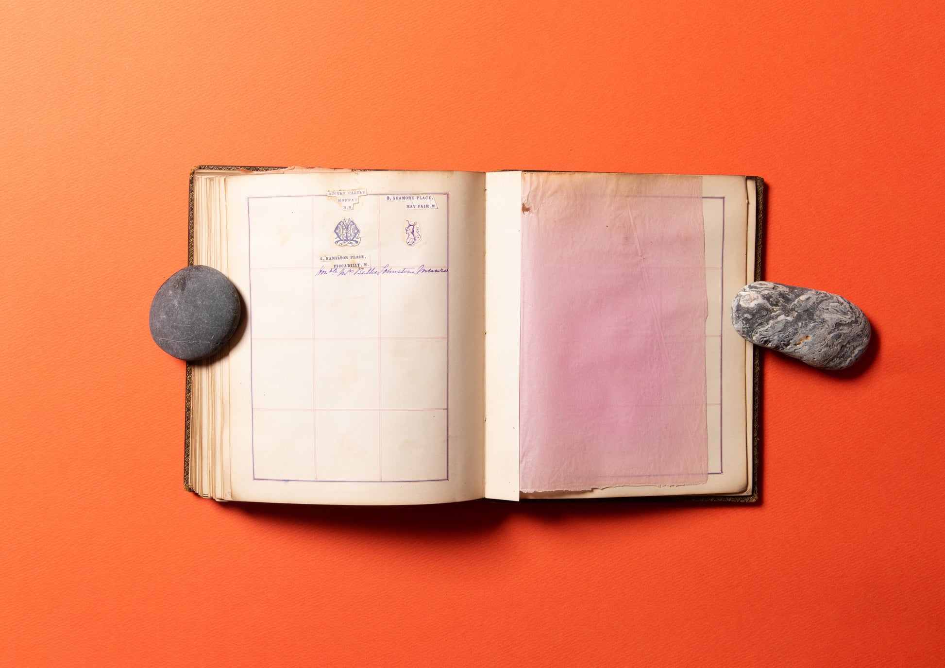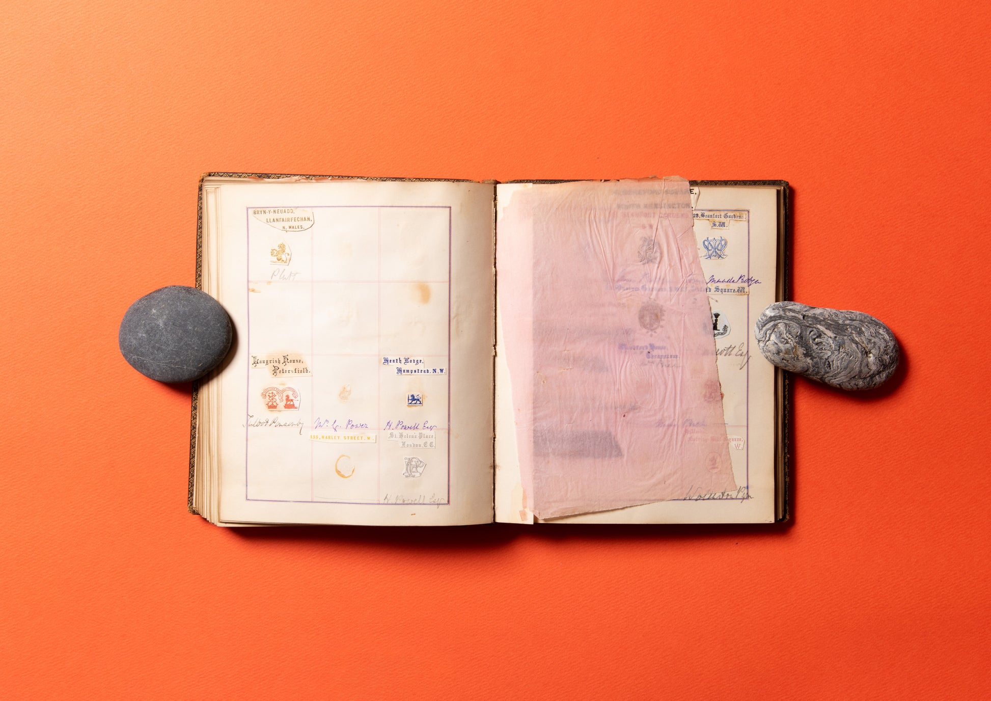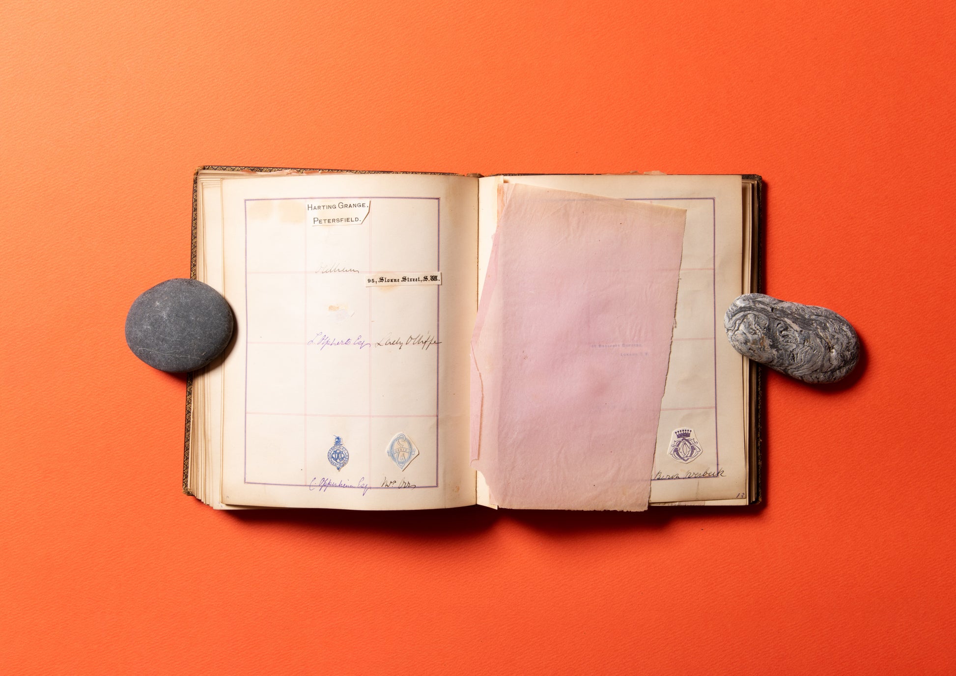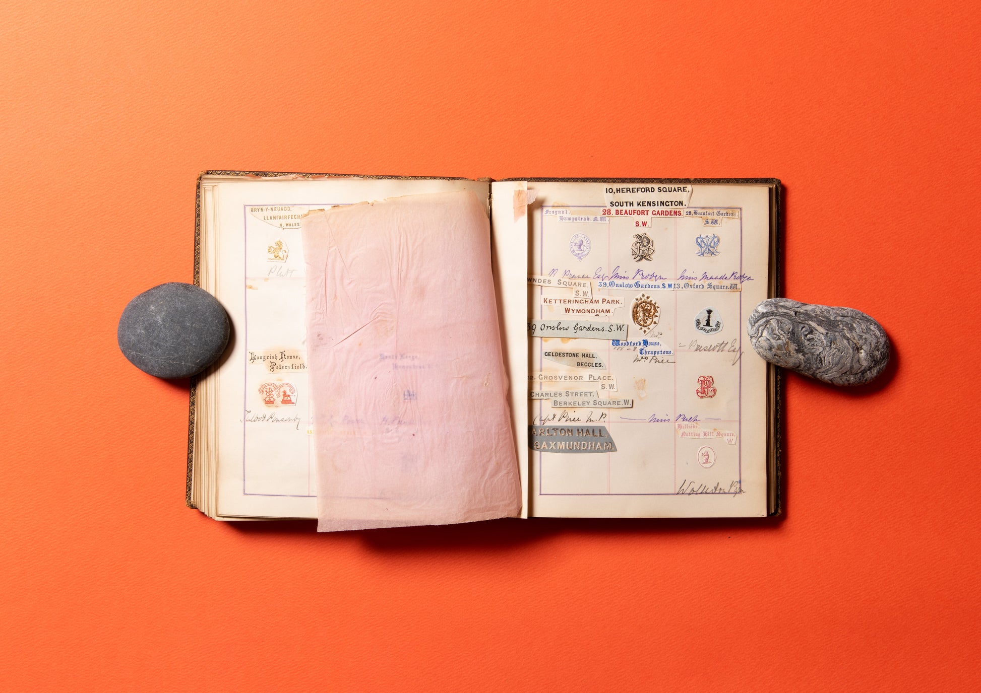 Unique private book with 1,000 monograms and crests based on personal names pasted on it, along with a piece of paper with the address. / 個人名に基づくモノグラムや紋章を住所の紙片とともに貼り込んだ私家本