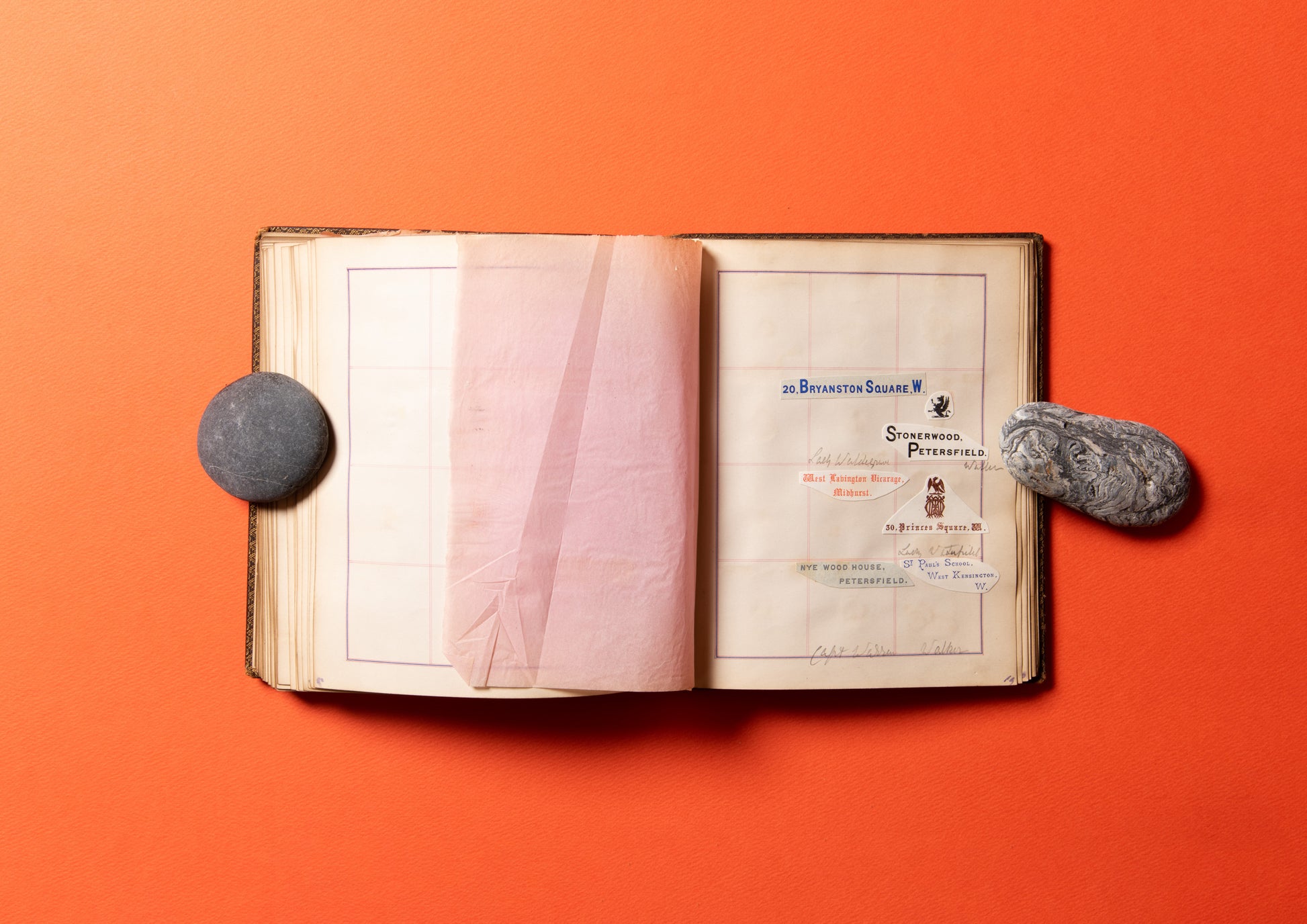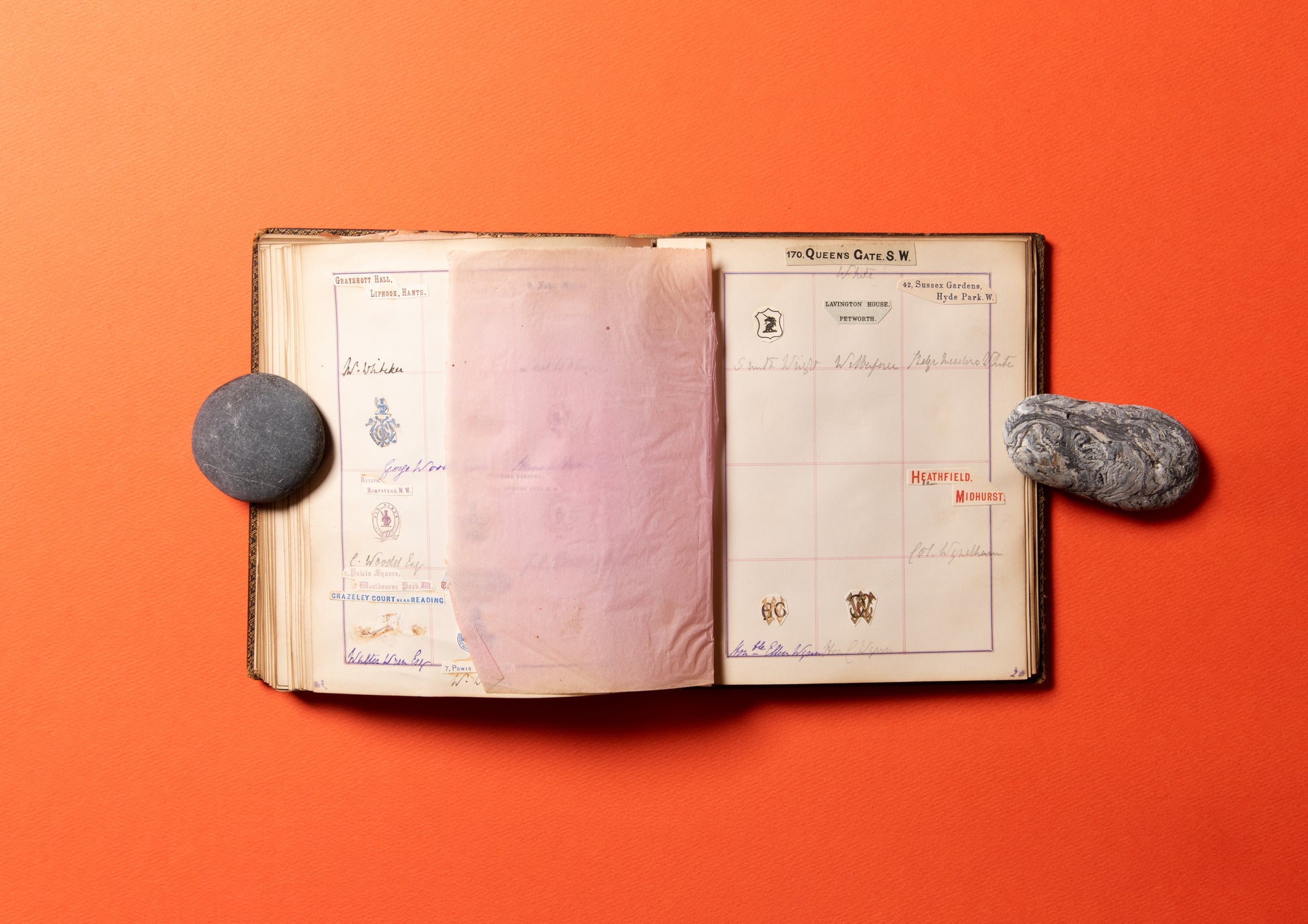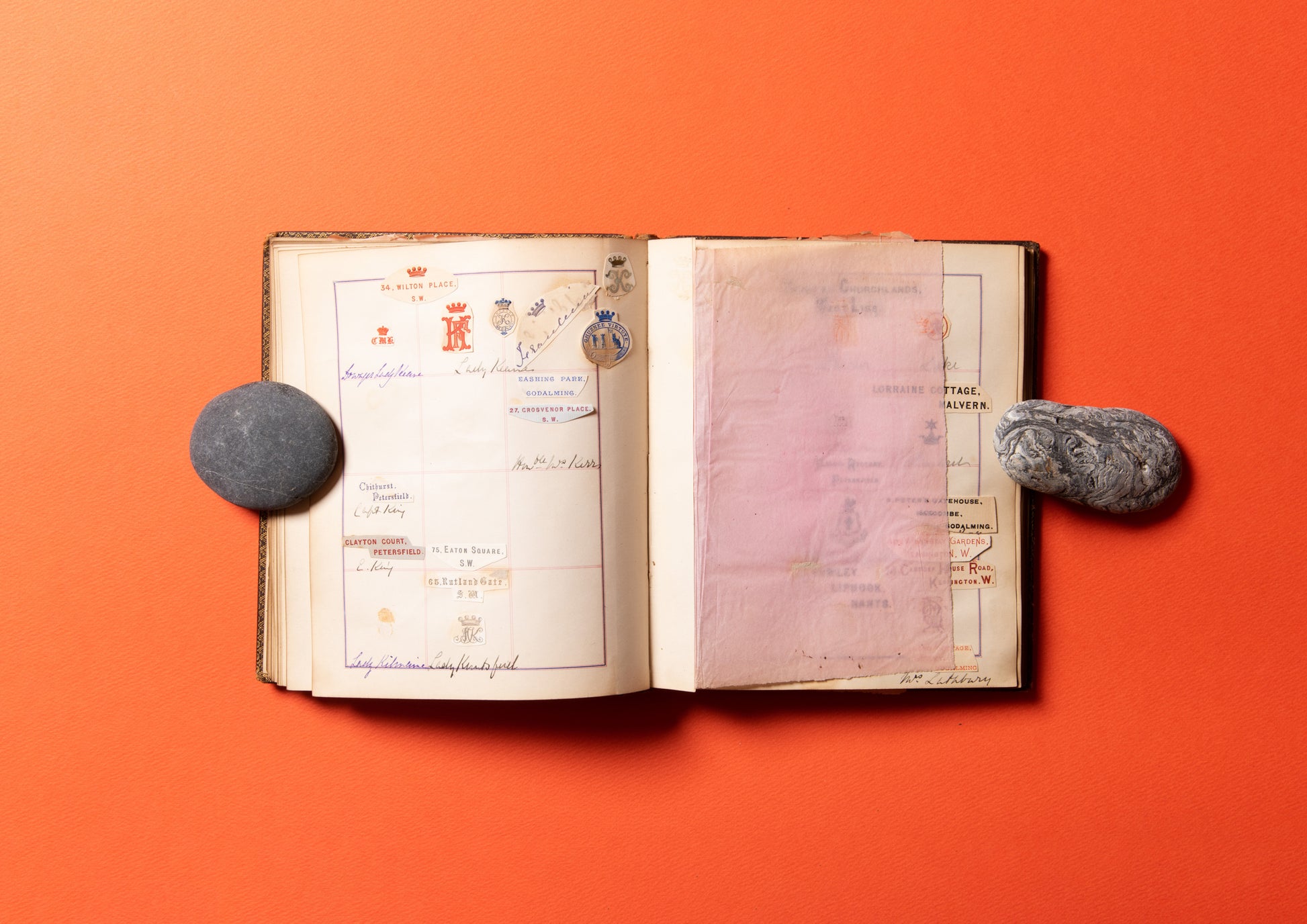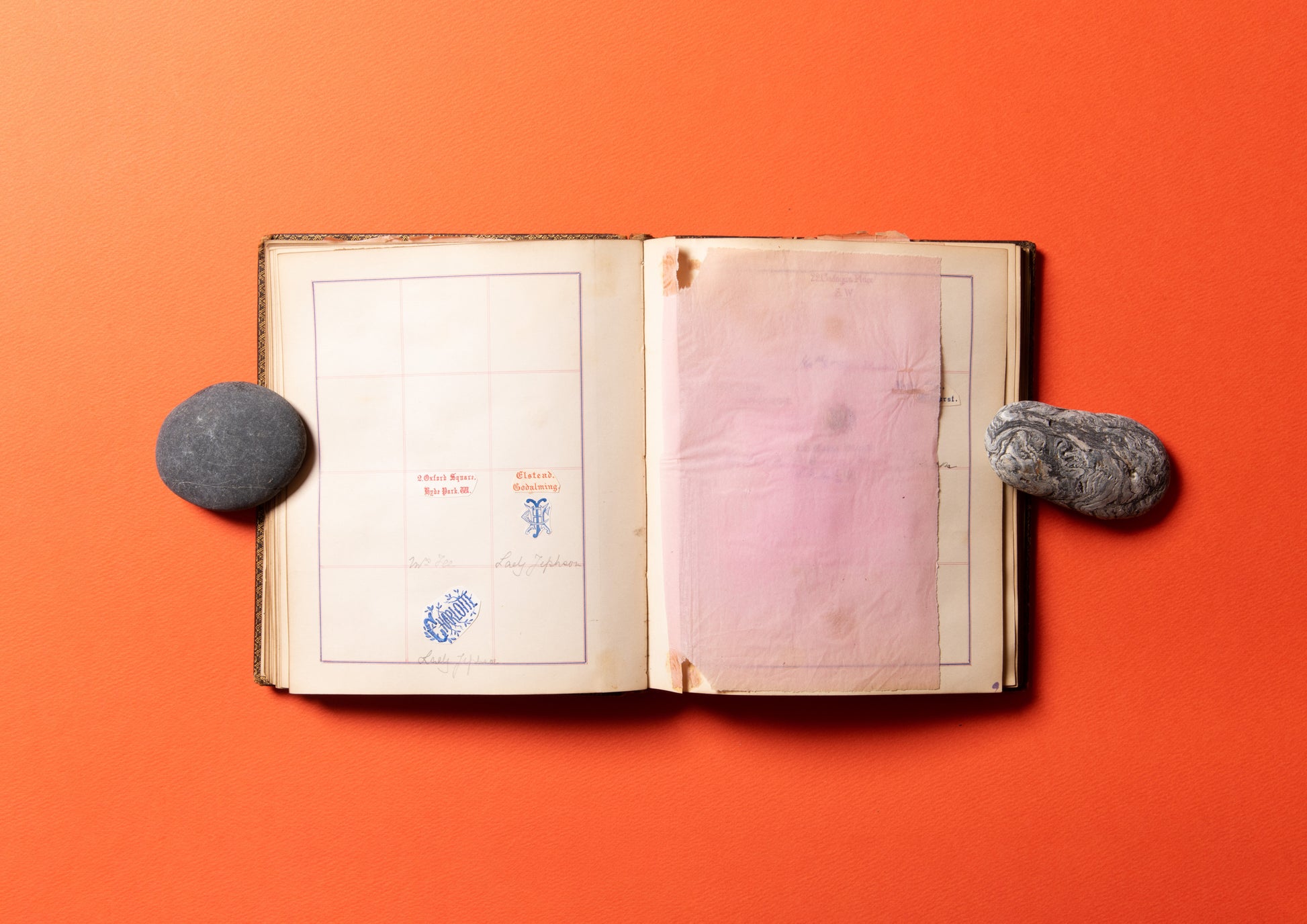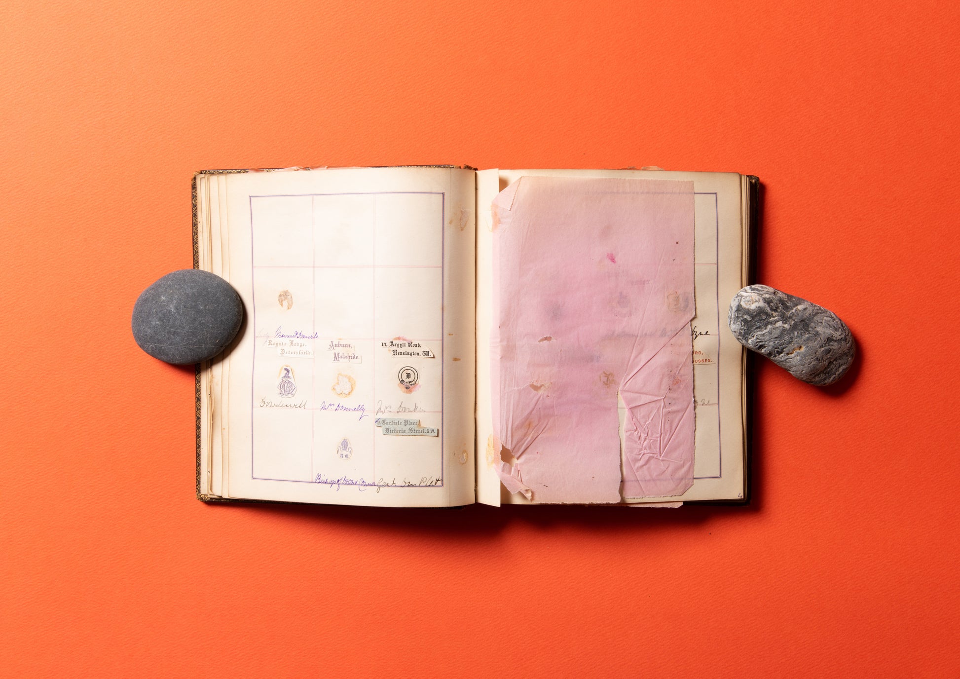 Unique private book with 1,000 monograms and crests based on personal names pasted on it, along with a piece of paper with the address. / 個人名に基づくモノグラムや紋章を住所の紙片とともに貼り込んだ私家本
