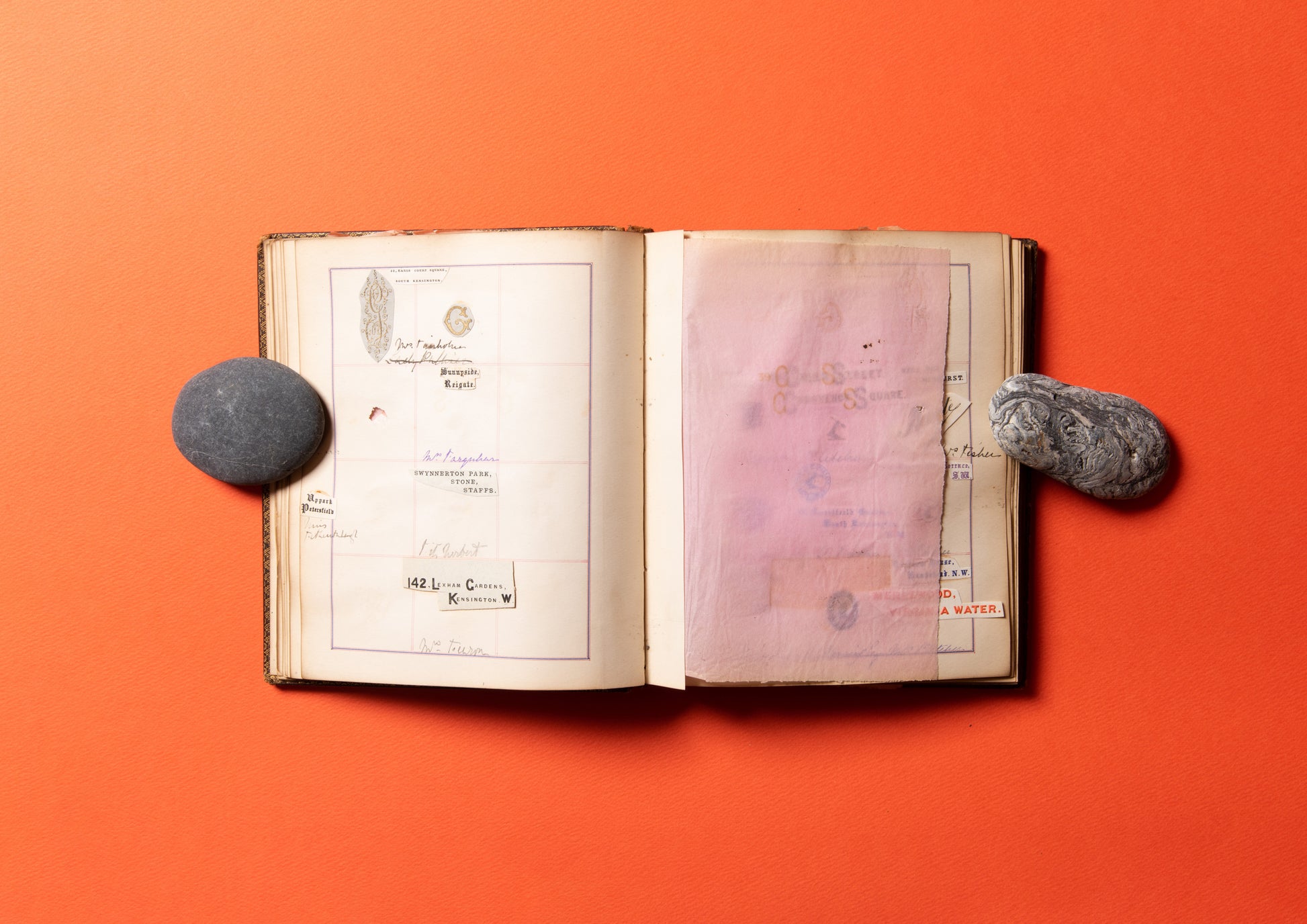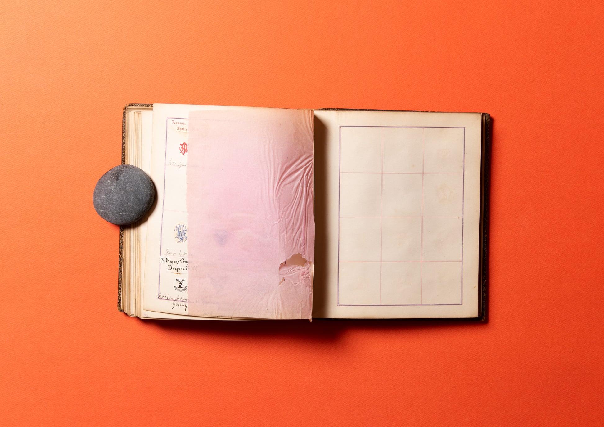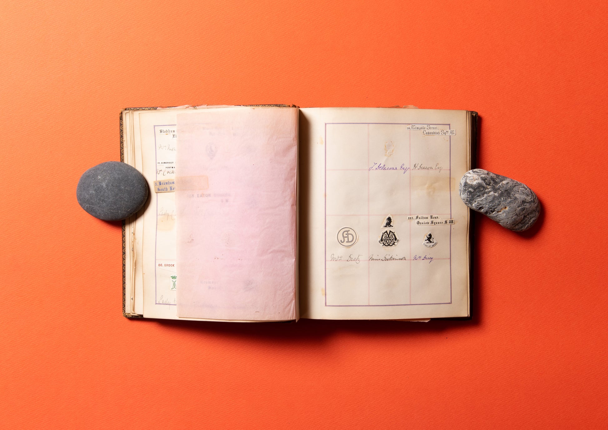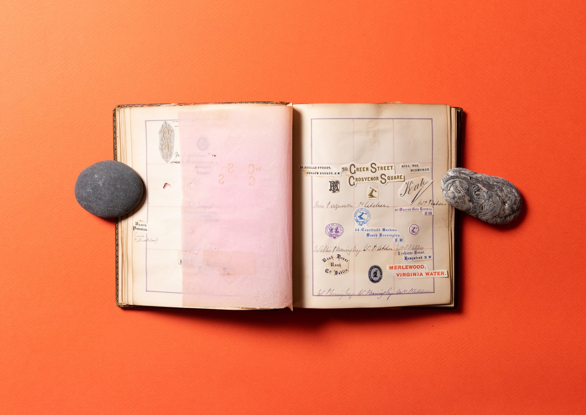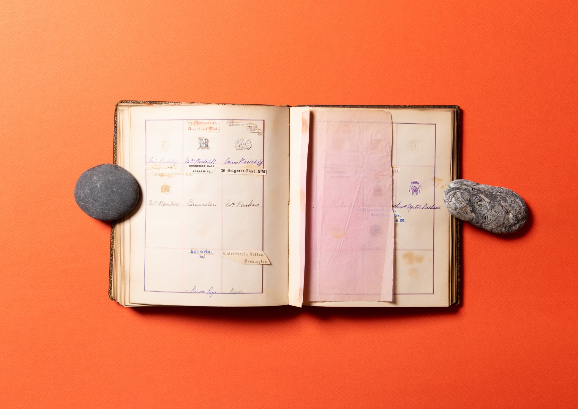 Unique private book with 1,000 monograms and crests based on personal names pasted on it, along with a piece of paper with the address. / 個人名に基づくモノグラムや紋章を住所の紙片とともに貼り込んだ私家本