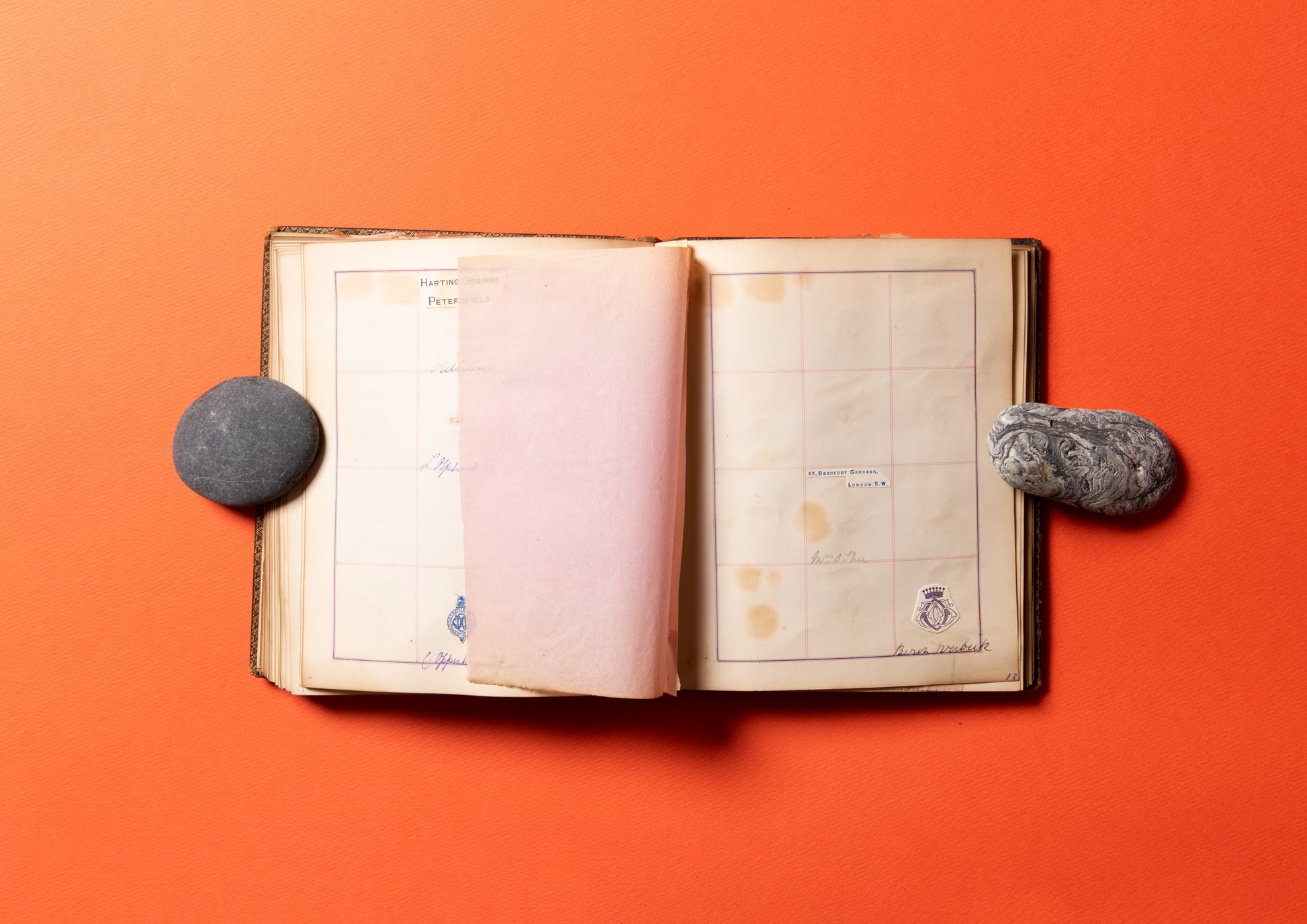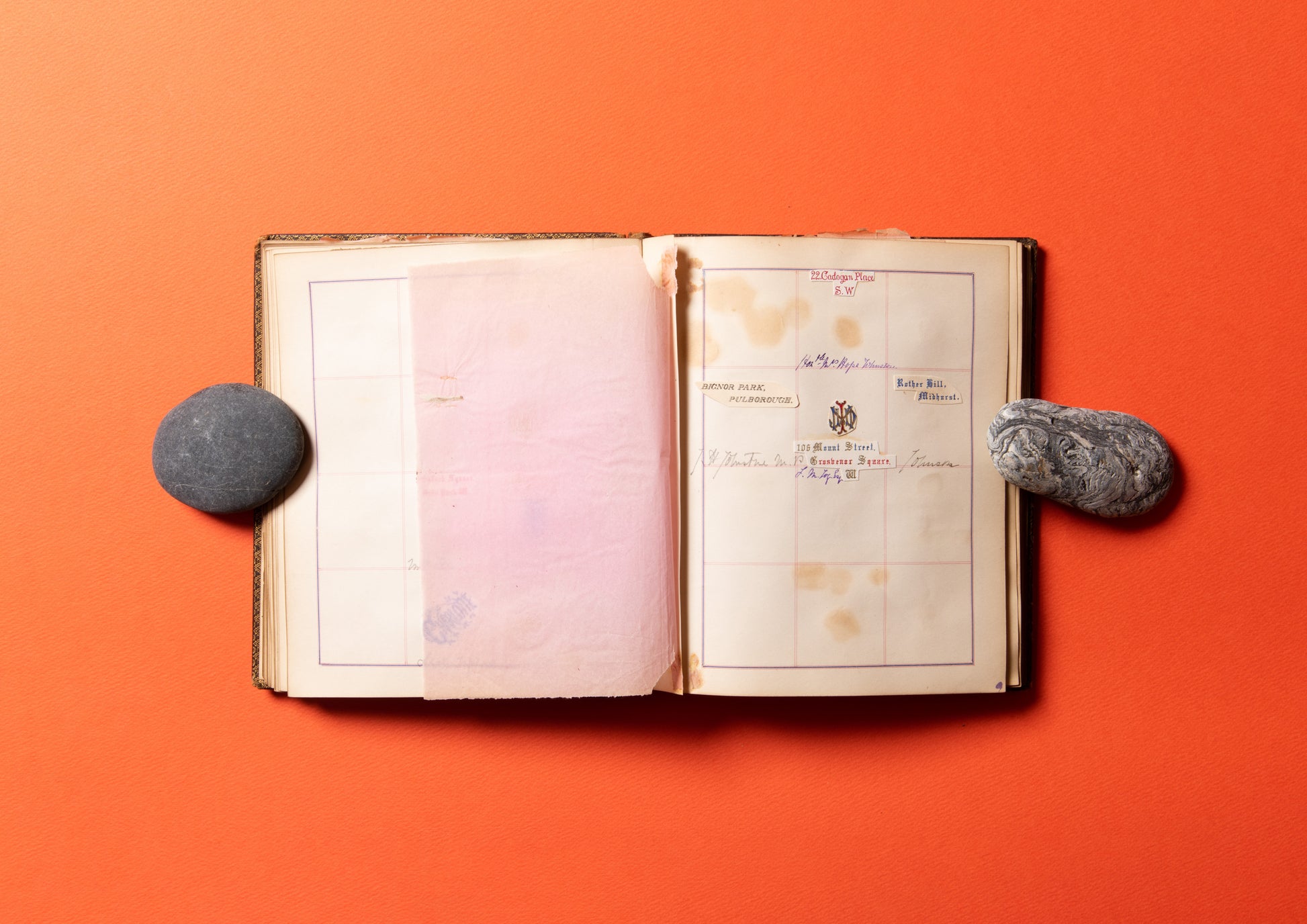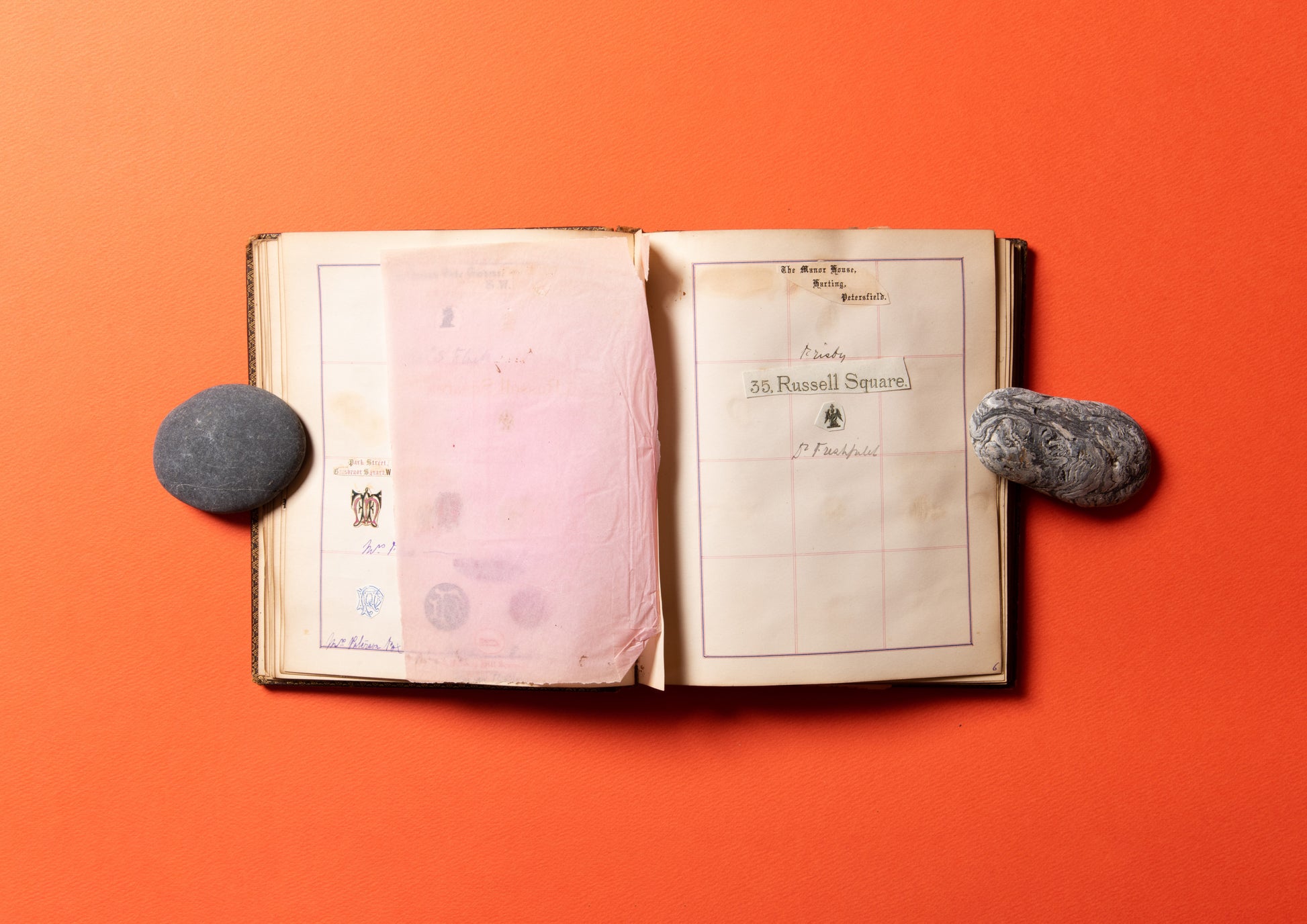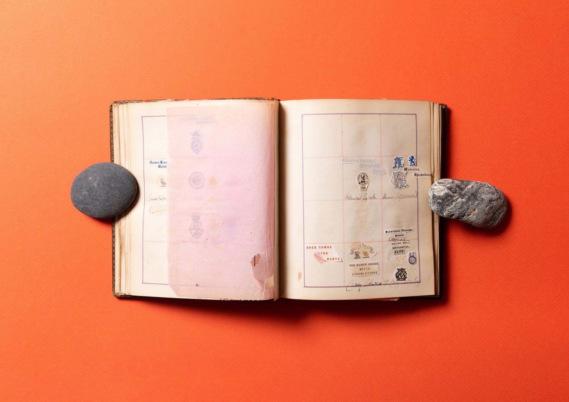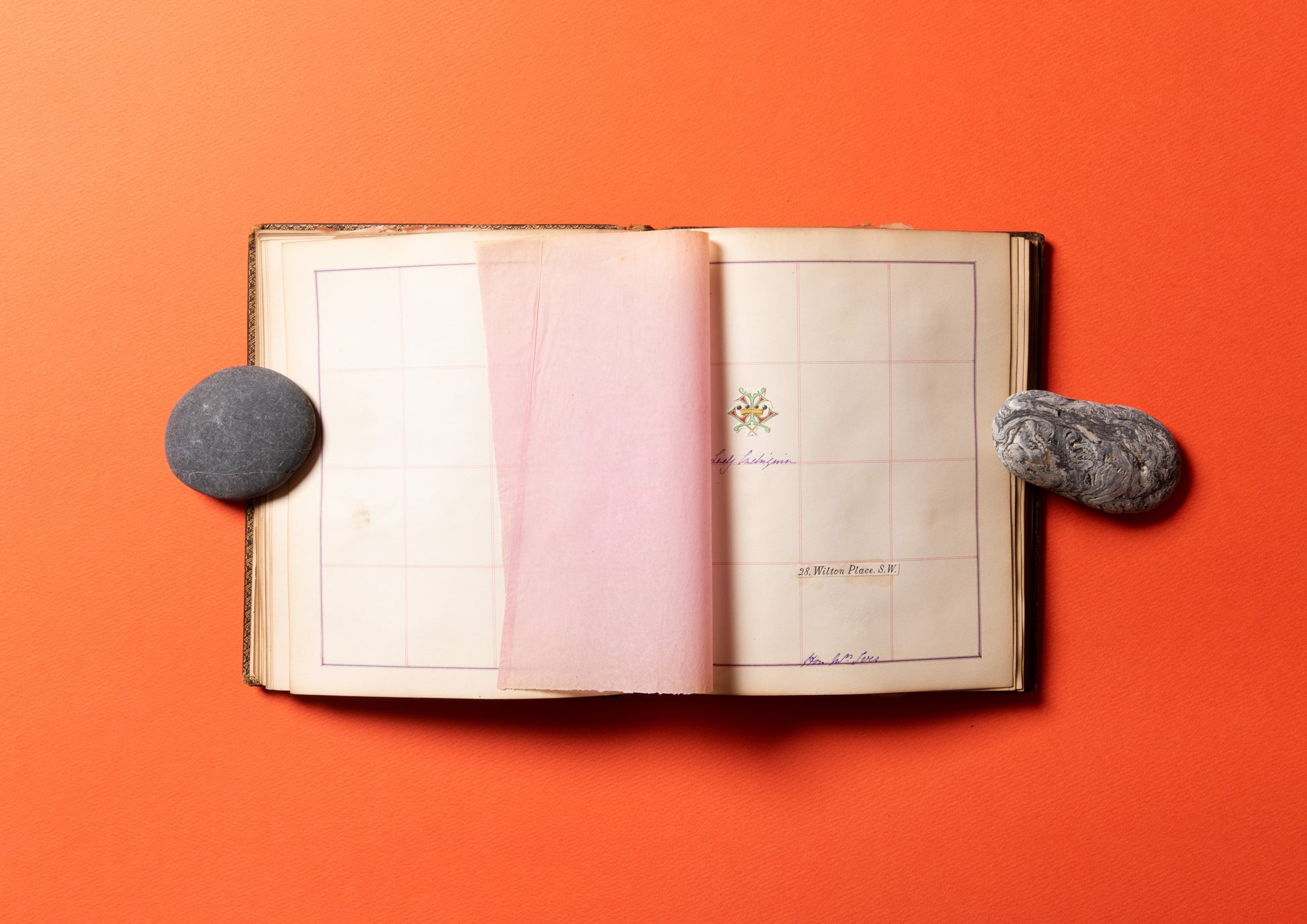 Unique private book with 1,000 monograms and crests based on personal names pasted on it, along with a piece of paper with the address. / 個人名に基づくモノグラムや紋章を住所の紙片とともに貼り込んだ私家本