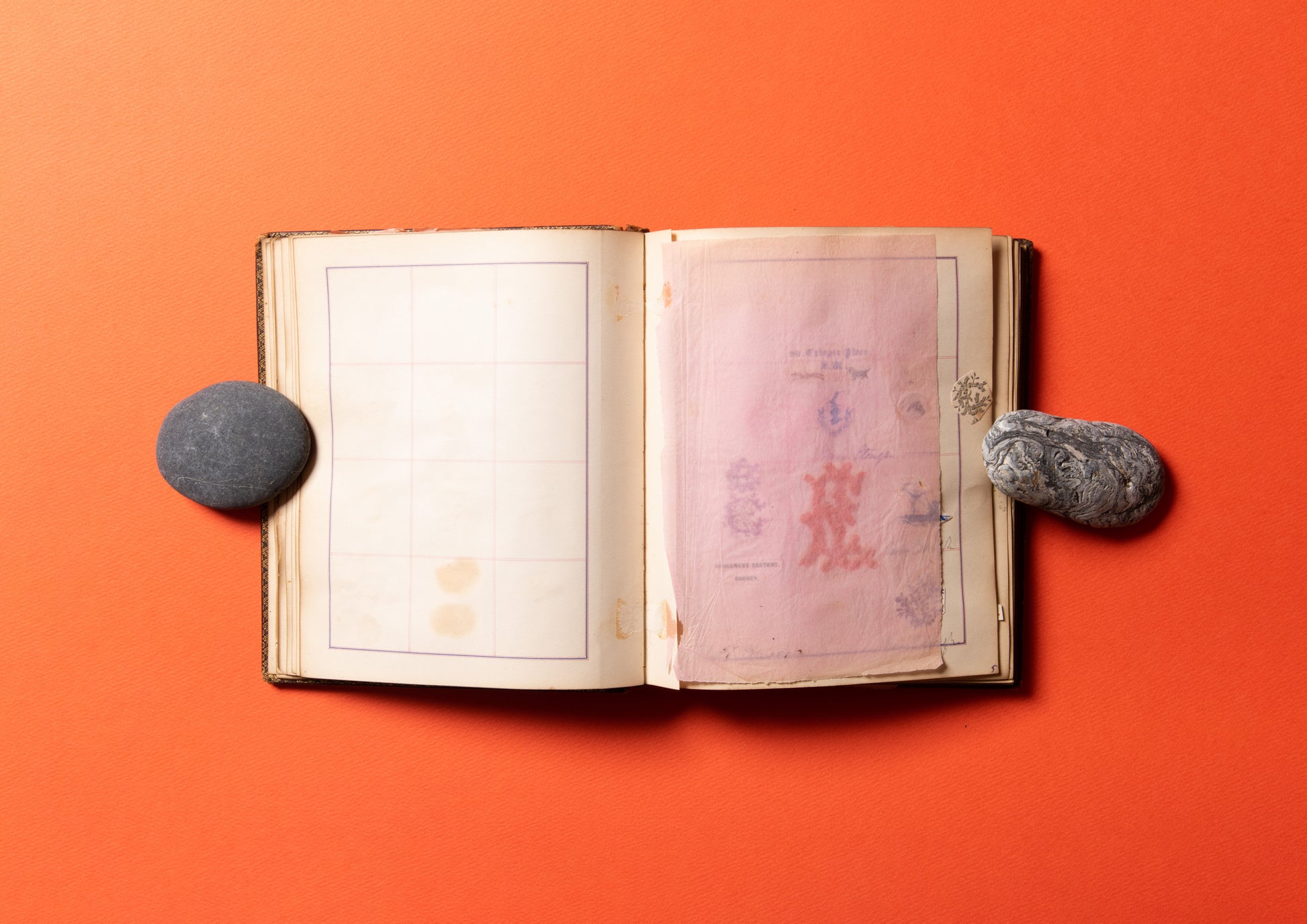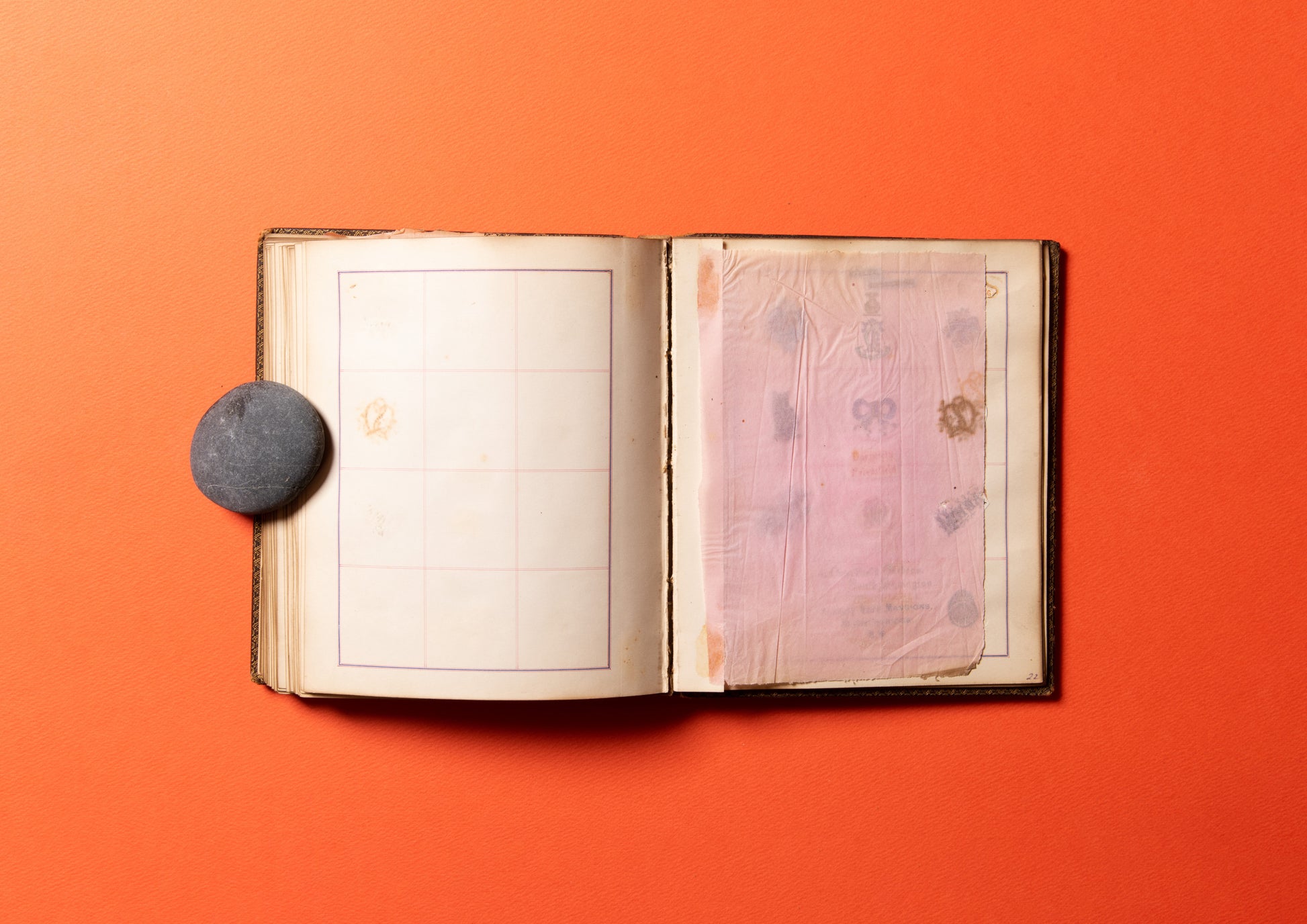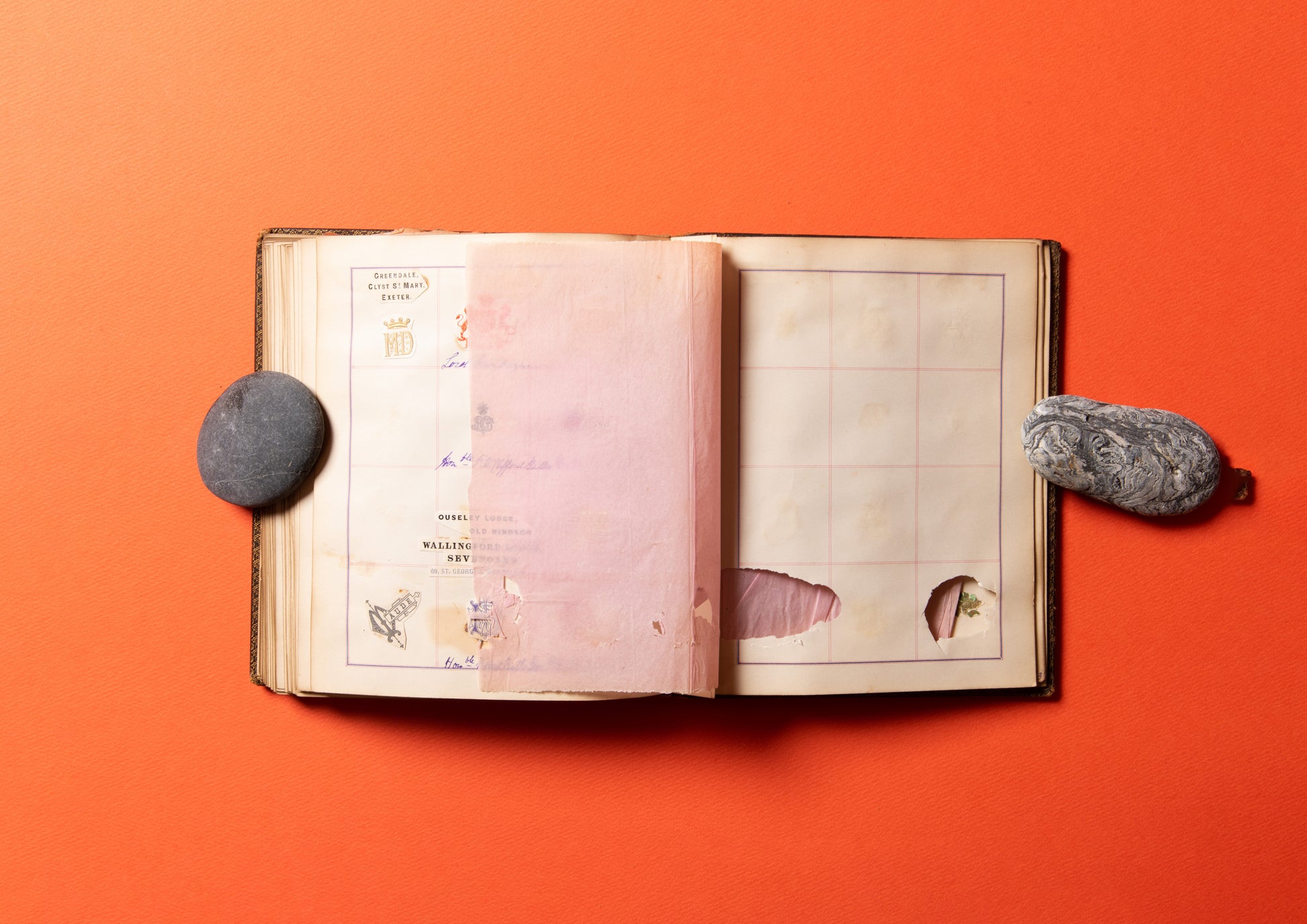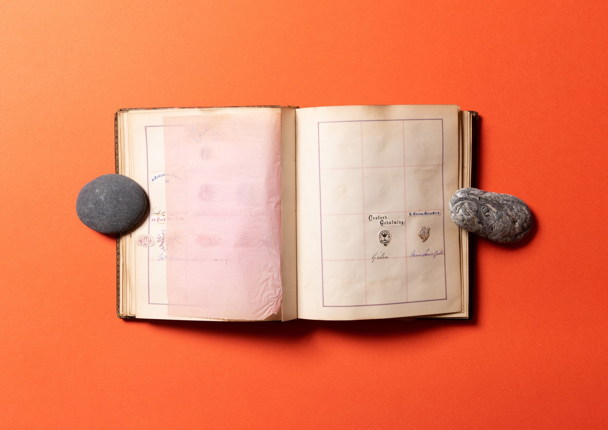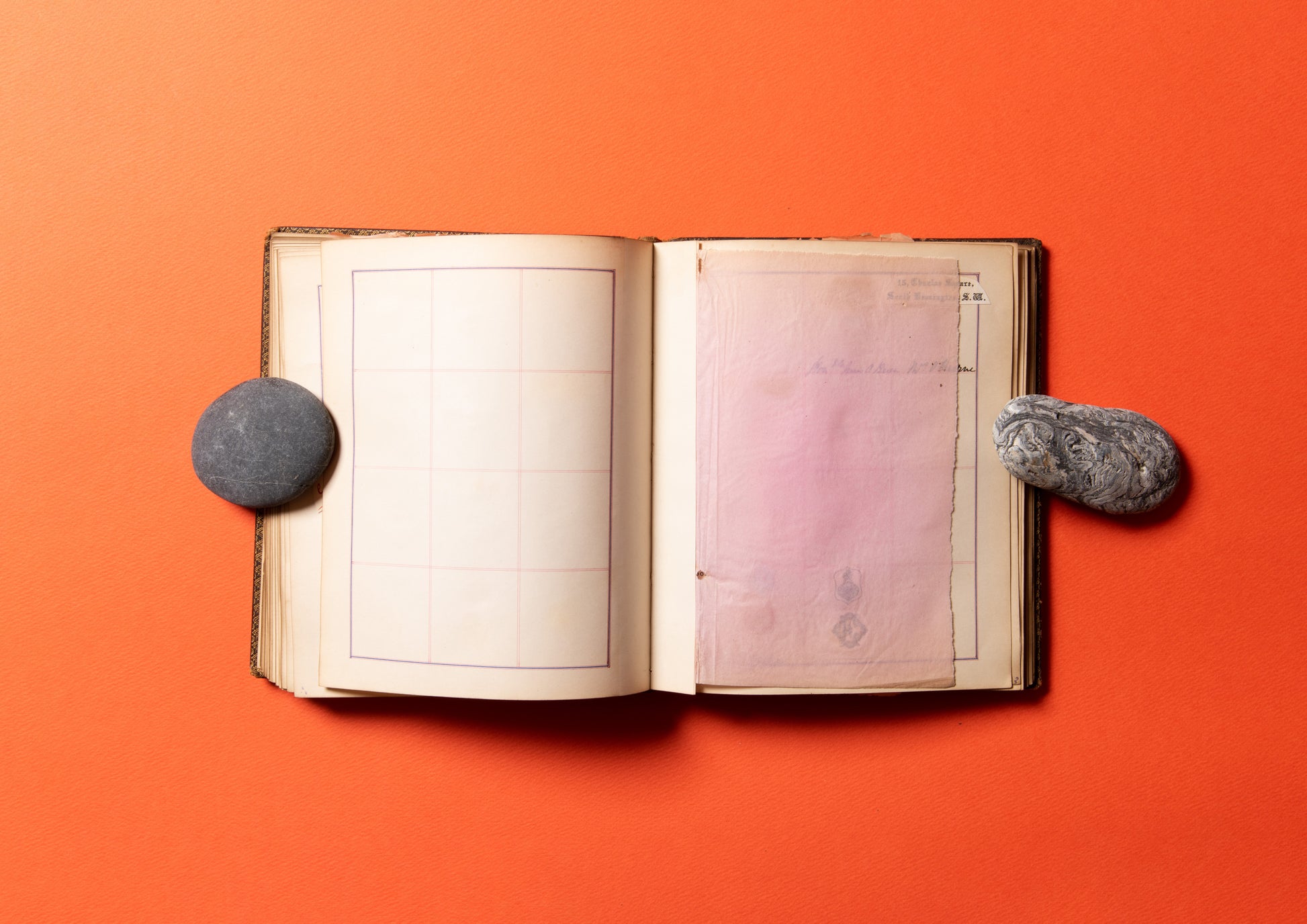 Unique private book with 1,000 monograms and crests based on personal names pasted on it, along with a piece of paper with the address. / 個人名に基づくモノグラムや紋章を住所の紙片とともに貼り込んだ私家本