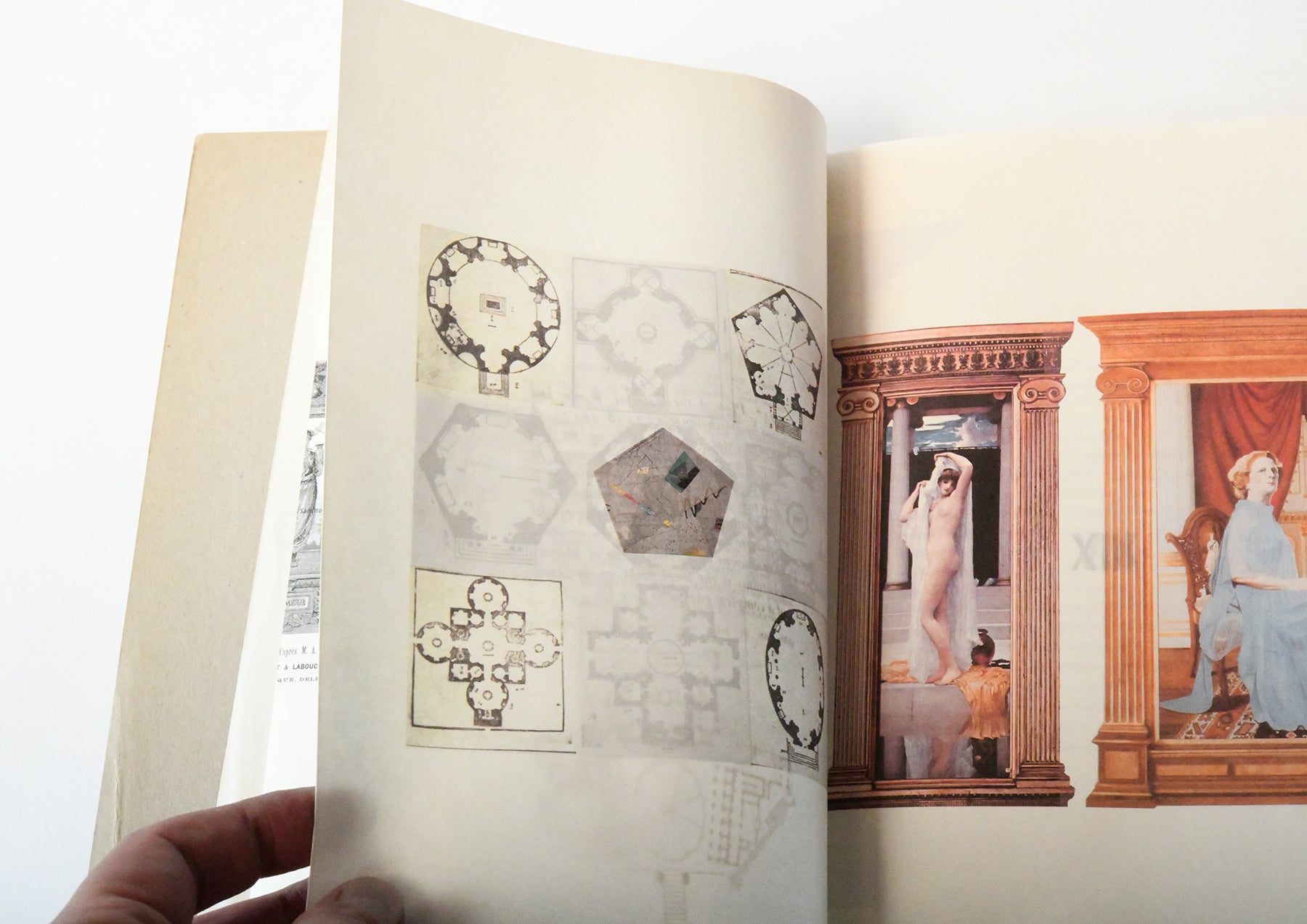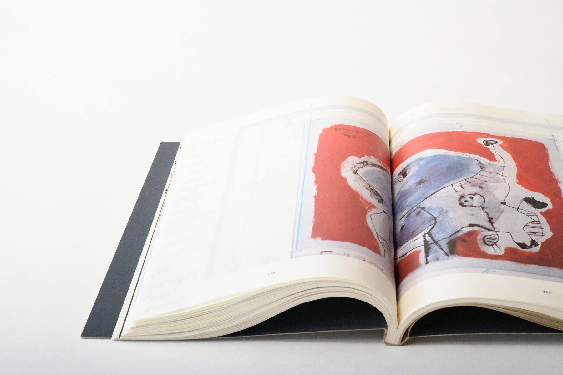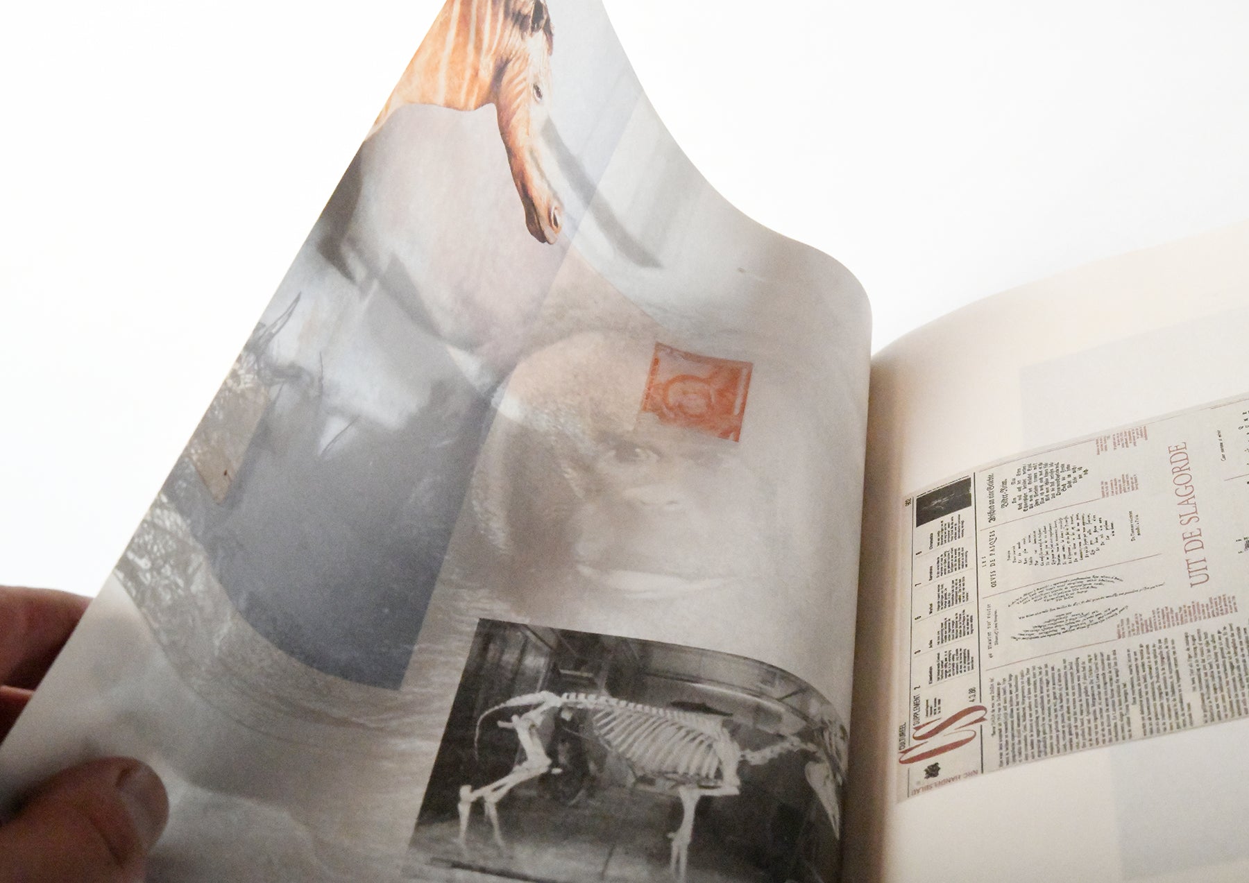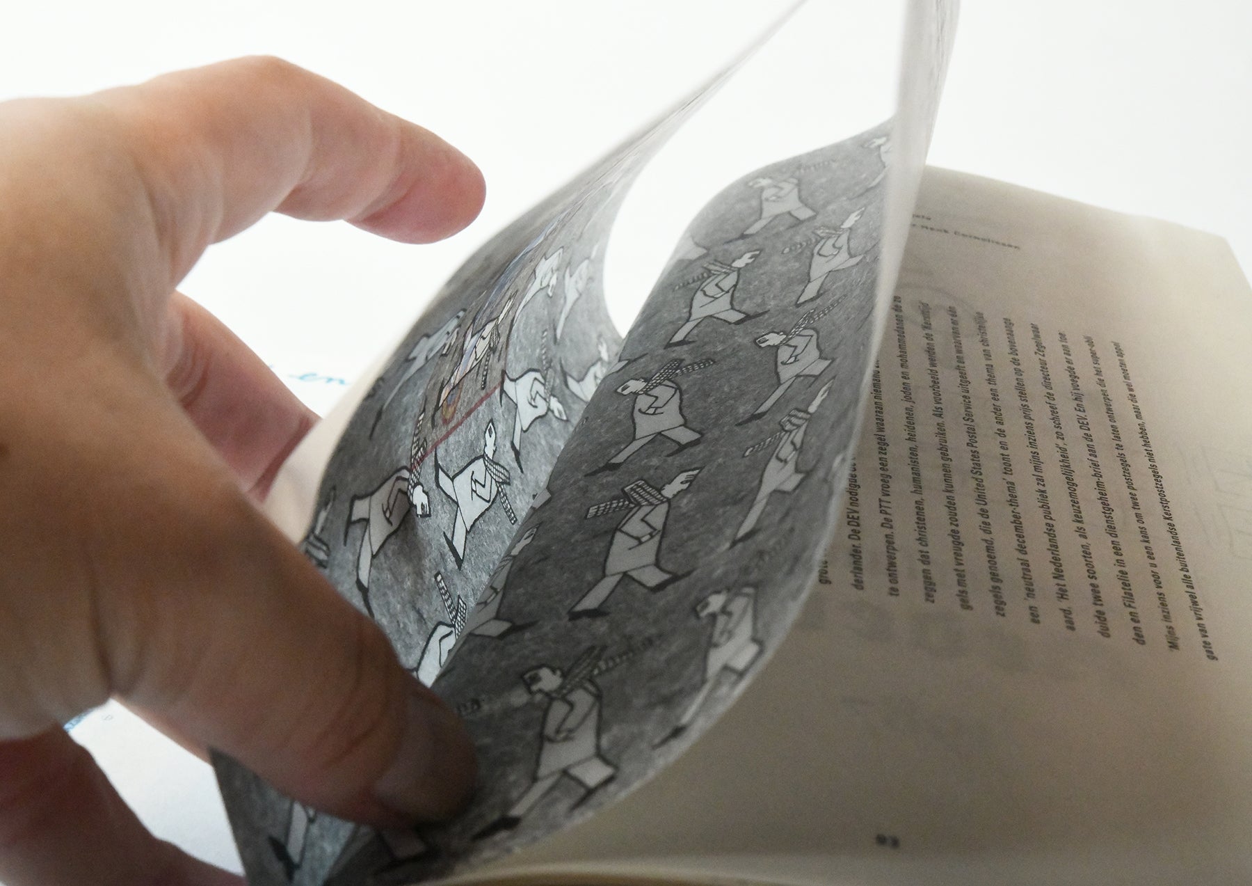 Irma printed a different image on the inside of the sewn-in booklet, which is never opened, than on the front. The pages visible on the front are printed in four colors using offset lithography, while the inside of the booklet is printed in one color black. When you look through the colored pages, it creates the effect of making ghosts of the past appear. This was before the collapse of the Showa bubble in Japan. This was before computer design, so Irma cut and pasted together the vast amount of image material he had collected, and used a Xerox printer.