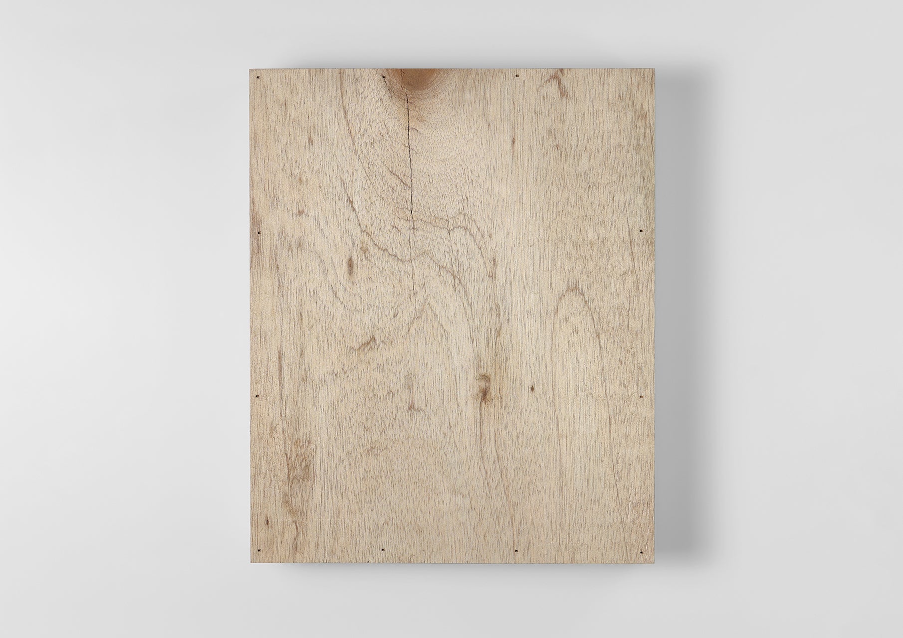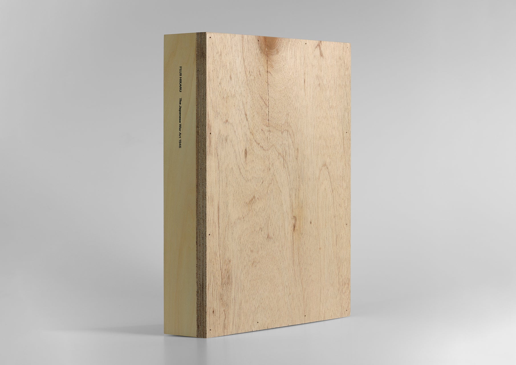 This multiple work (Japanese War Art 1946) is based on Hikaru Fujii's installation of Japanese war paintings at the Museum of Contemporary Art Tokyo in 2022, and includes two documentation books, video data, and artwork tags in a wooden box reassembled from scrap veneer after the exhibition was dismantled. The subject matter of the veneer books is a work of art.