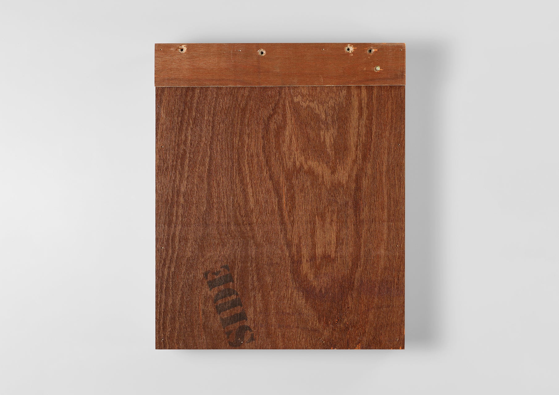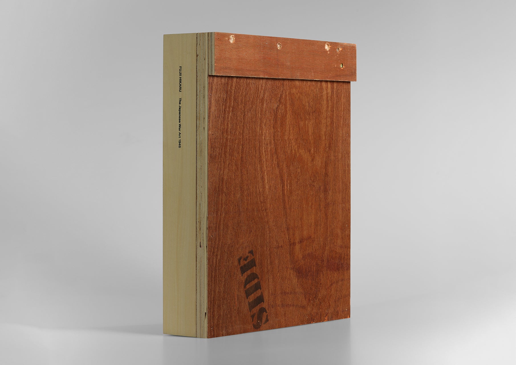 This multiple work (Japanese War Art 1946) is based on Hikaru Fujii's installation of Japanese war paintings at the Museum of Contemporary Art Tokyo in 2022, and includes two documentation books, video data, and artwork tags in a wooden box reassembled from scrap veneer after the exhibition was dismantled. The subject matter of the veneer books is a work of art.