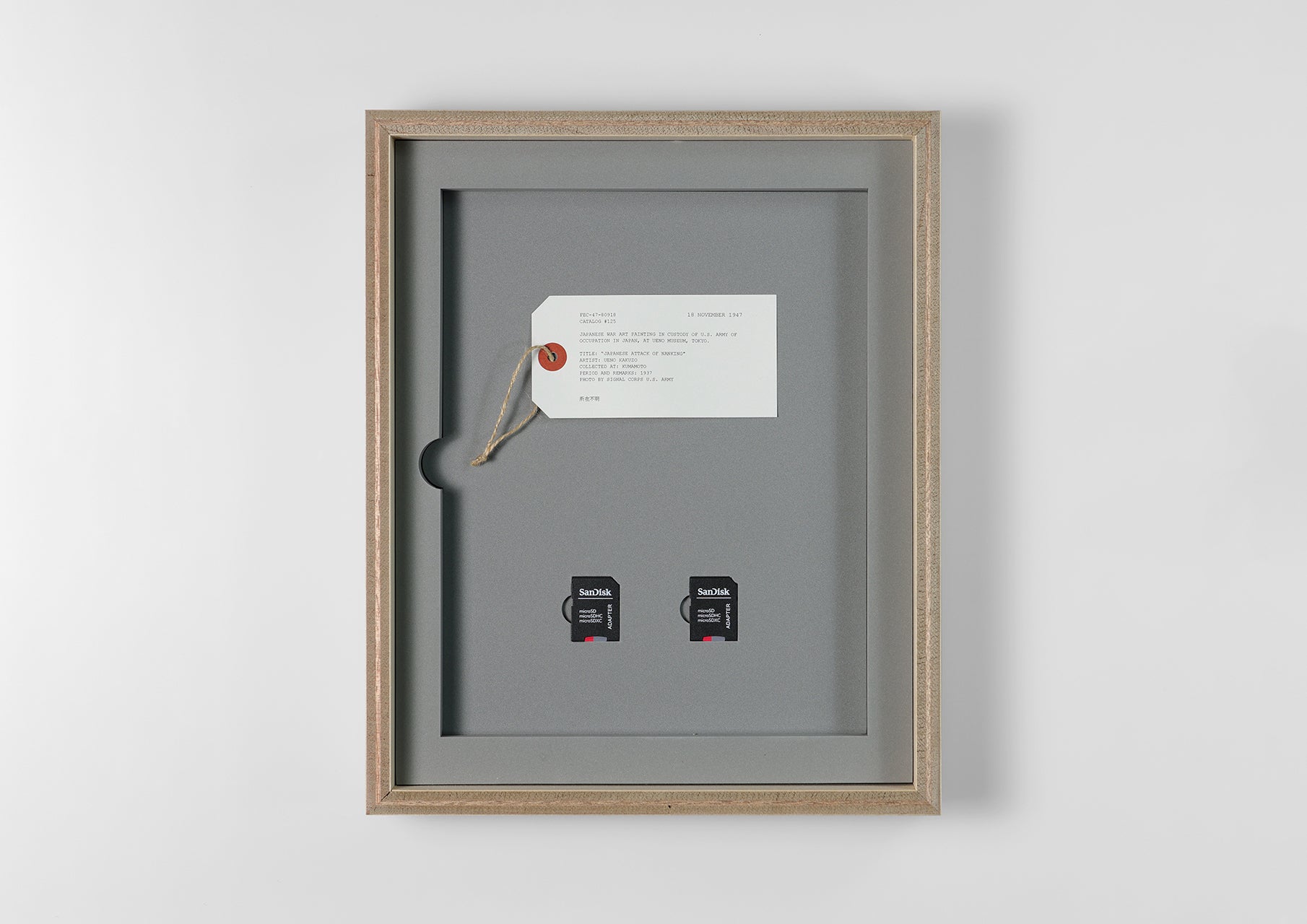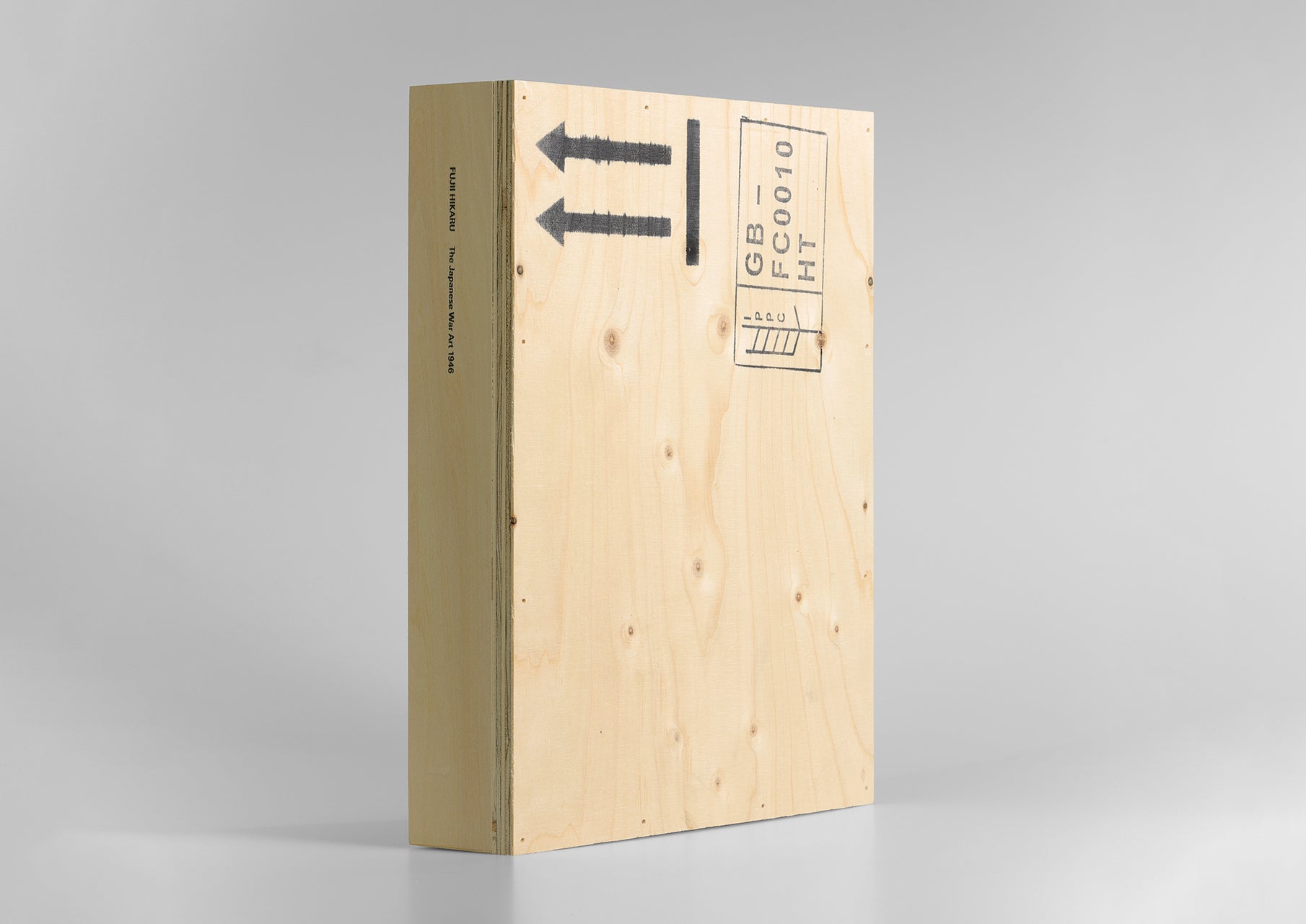 This multiple work (Japanese War Art 1946) is based on Hikaru Fujii's installation of Japanese war paintings at the Museum of Contemporary Art Tokyo in 2022, and includes two documentation books, video data, and artwork tags in a wooden box reassembled from scrap veneer after the exhibition was dismantled. The subject matter of the veneer books is a work of art.