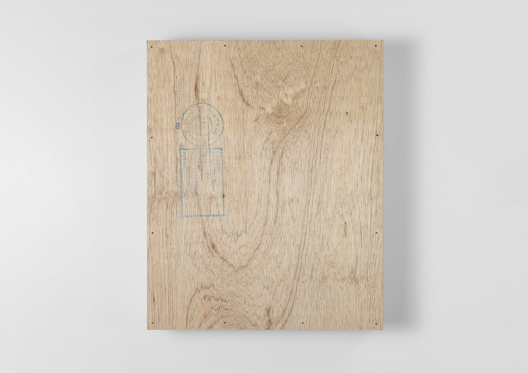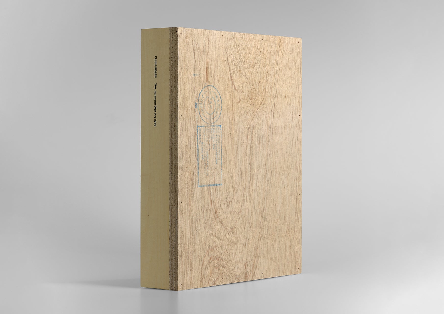 This multiple work (Japanese War Art 1946) is based on Hikaru Fujii's installation of Japanese war paintings at the Museum of Contemporary Art Tokyo in 2022, and includes two documentation books, video data, and artwork tags in a wooden box reassembled from scrap veneer after the exhibition was dismantled. The subject matter of the veneer books is a work of art.