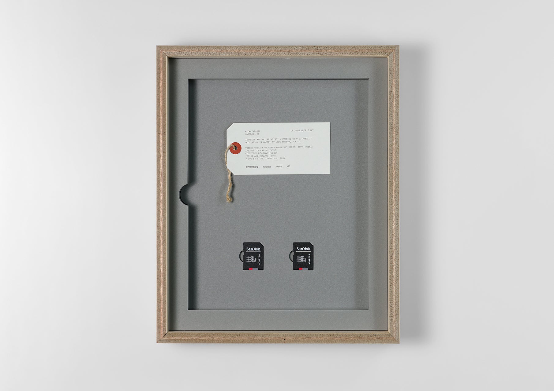 Certificate of Authenticity (with screening rights), Instructions, Video (SD card): 4A (23min.) / 4B (27min.) , Audio (SD card): Sound1 (5min.) / Sound2 (6min.) , Tag: KUMAOKA Yoshihiko, "Attack on the Humen Fortress", 1940 , Documents / 作品証明書 (上映権)、インストラクション、映像 (SDカード) : 4A (23分)/ 4B (27分) 、 音声(SDカード): サウンド1(5分)/ サウンド2(6分) 、 付票:熊岡美彦『虎門要塞攻撃』1941 、 資料