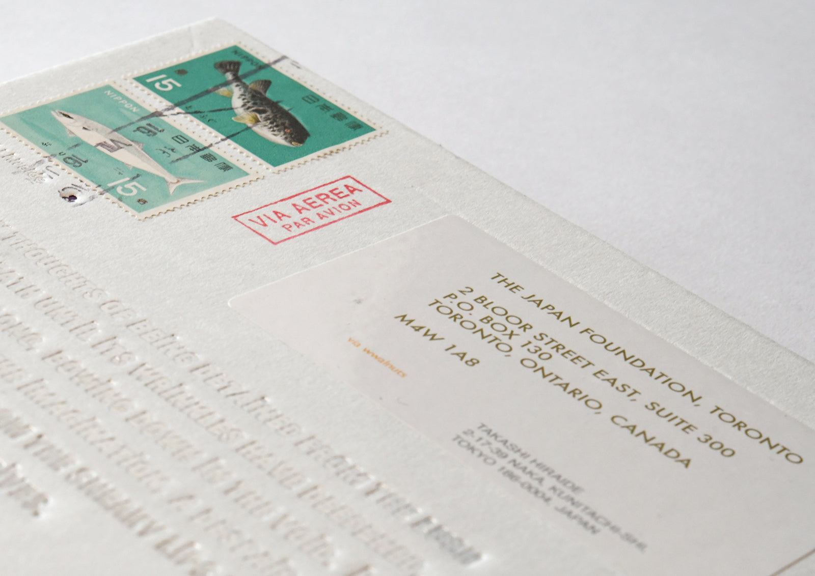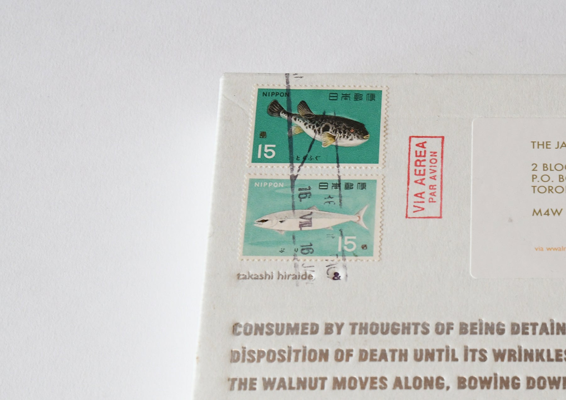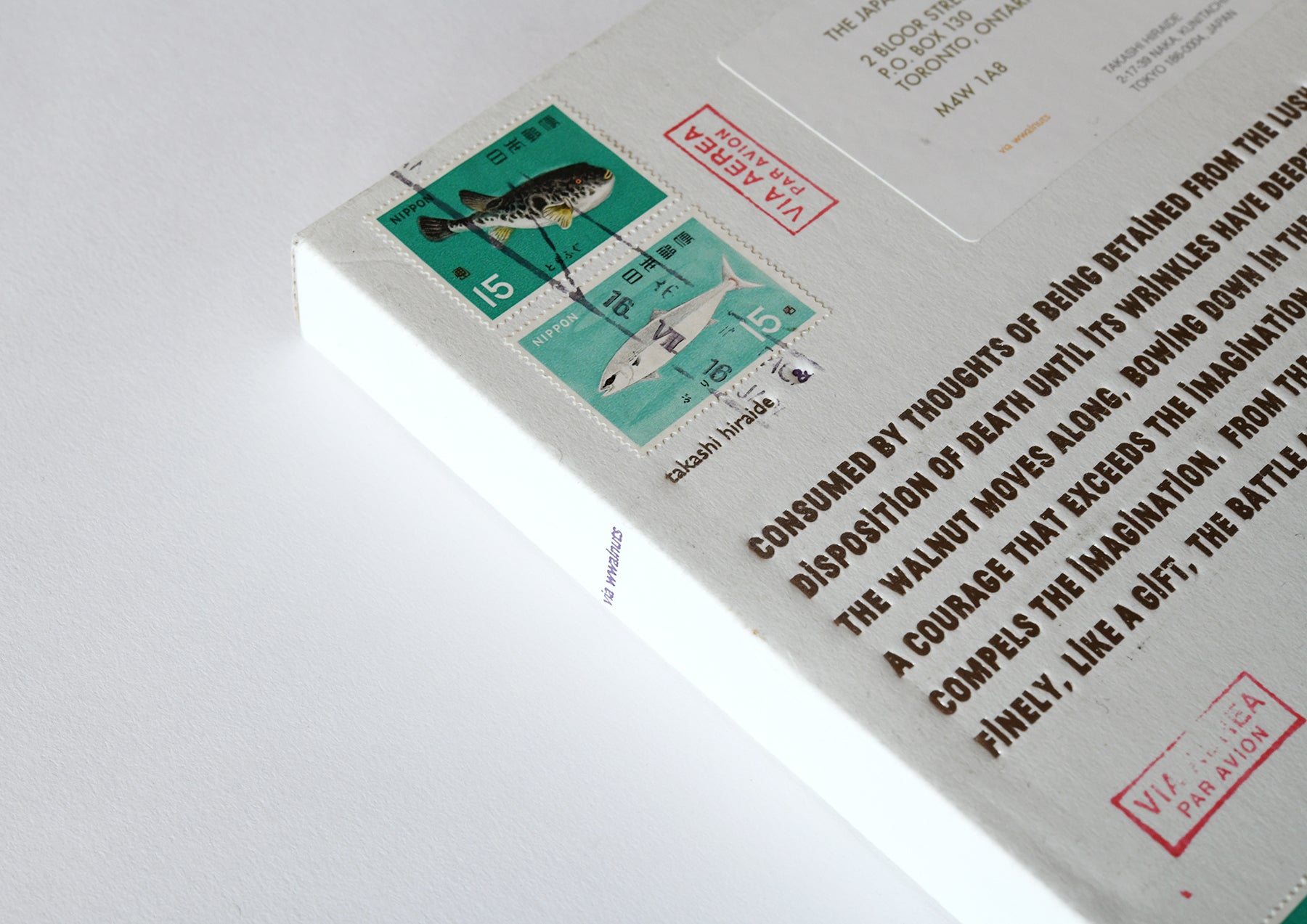 This "Lonely Scombroid" is a bookcase with old stamps of Japanese fish and finished with postmarks. The typeface is Jean-Luc. It was mailed to the Japan Foundation, Toronto for the "Takashi Hiraide Exhibition" held in Toronto in 2016.