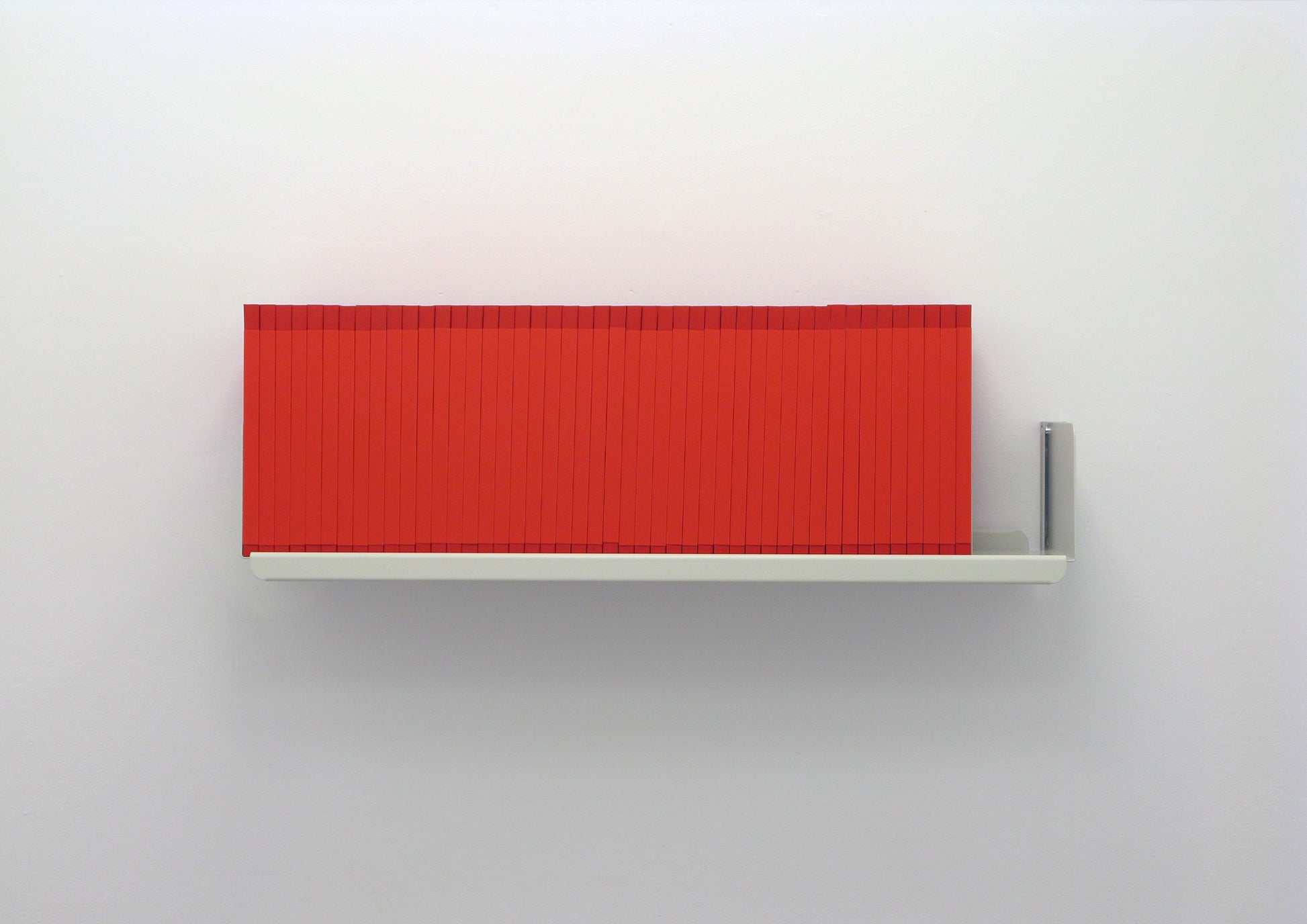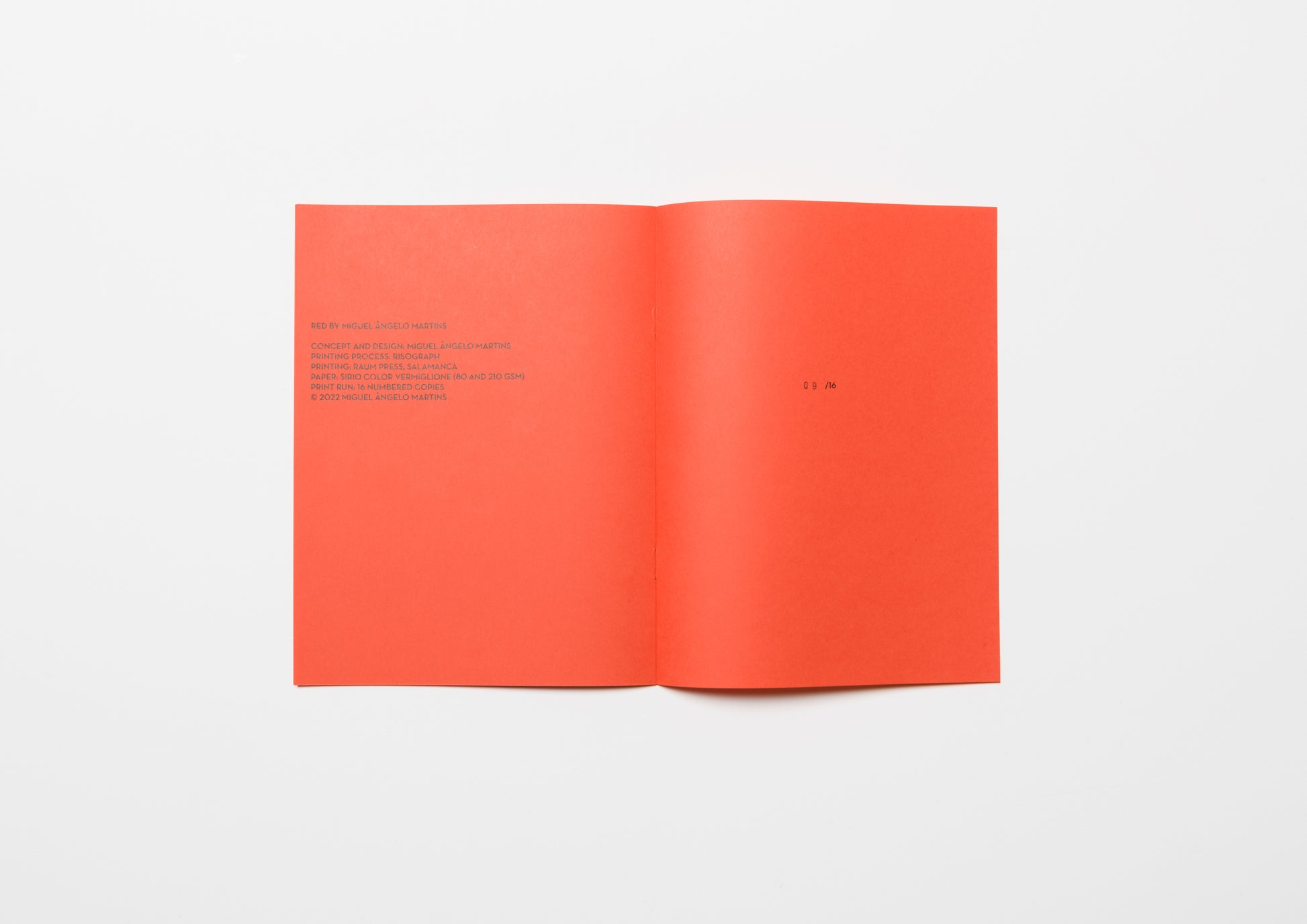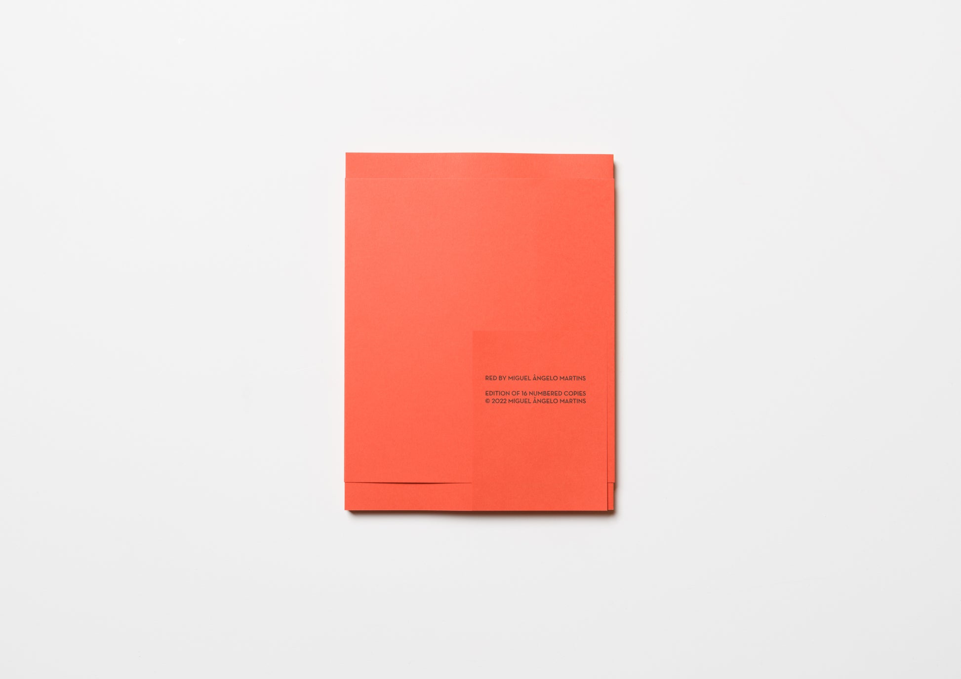 This book is based on the "Inventory of Red Paints," and is a book that has been finished while maintaining the book's specifications of a booklet and 46 cards fastened with a band. While the "Inventory of Red Paints" is a collection of the various types of red paint kept in Miguel's studio, "Red" is no longer a book with words or photographs, but only a series of pages printed in red. The only information available is a brief blurb justifying the edition.