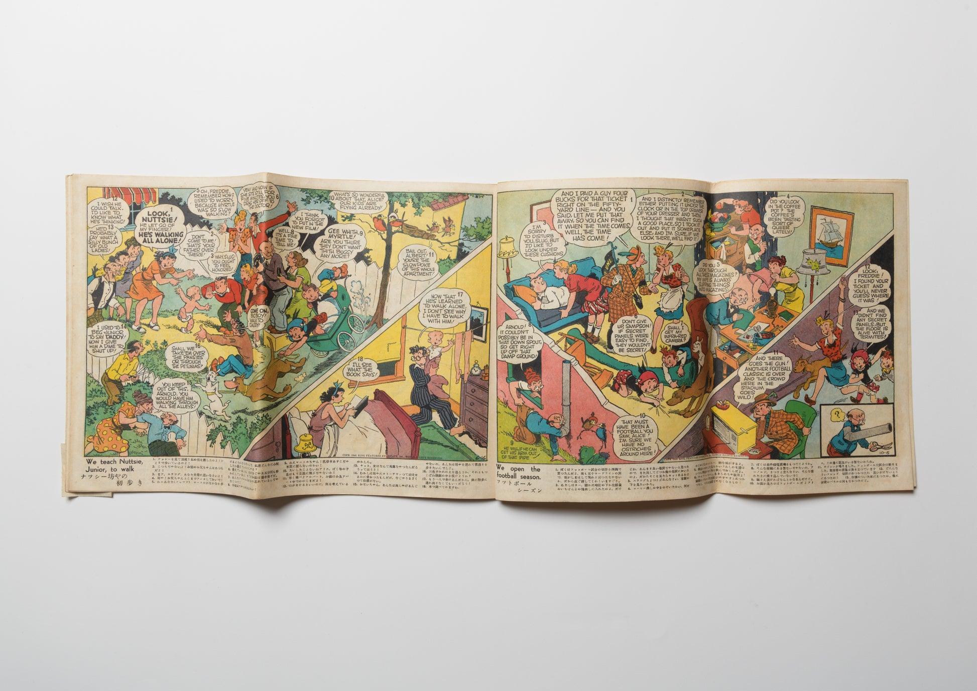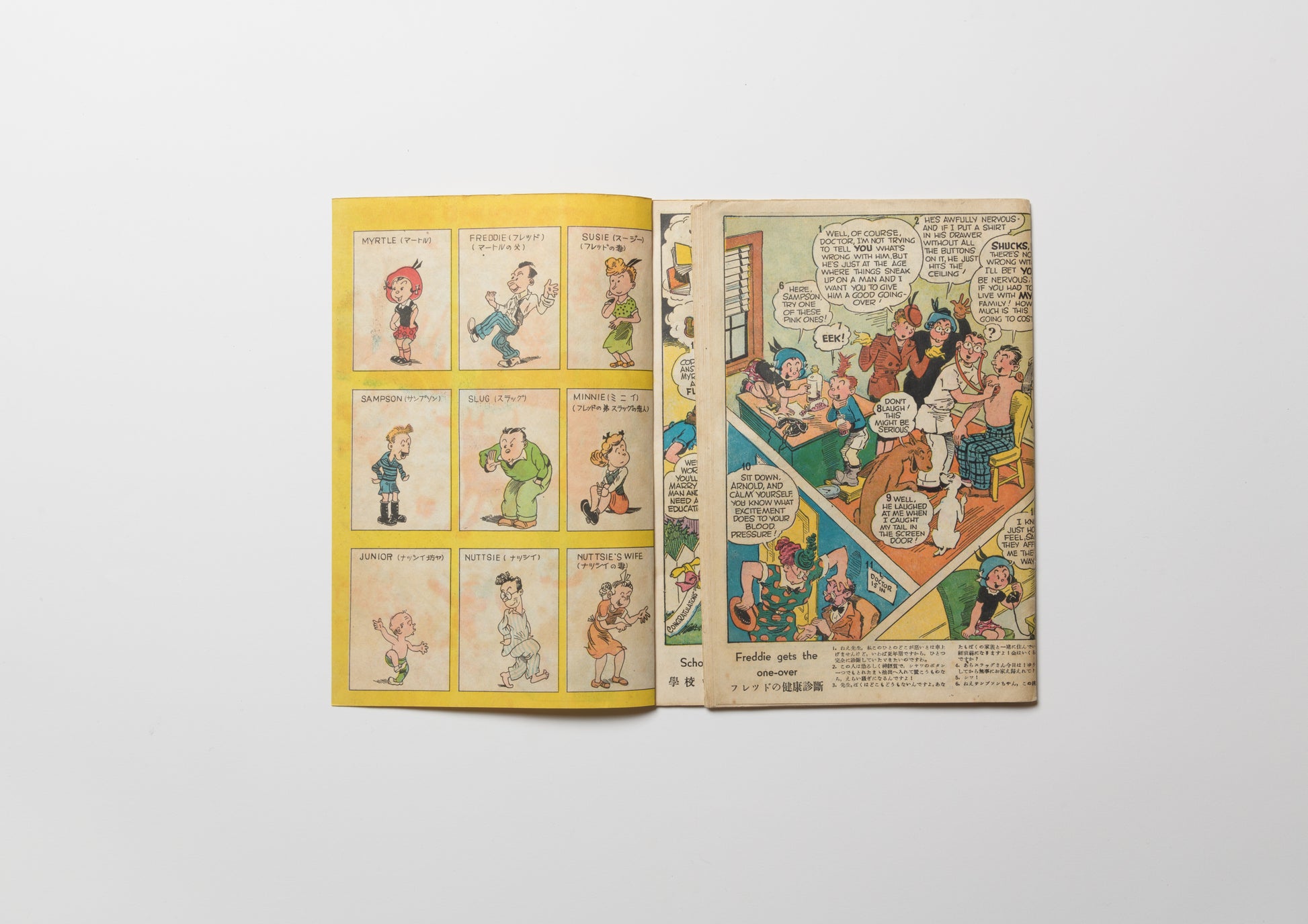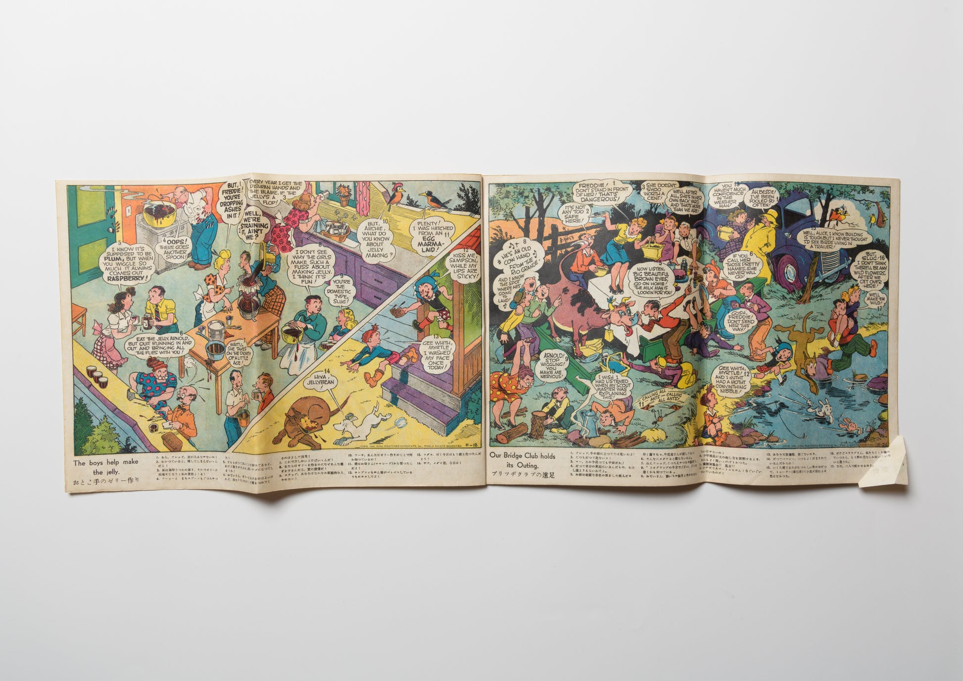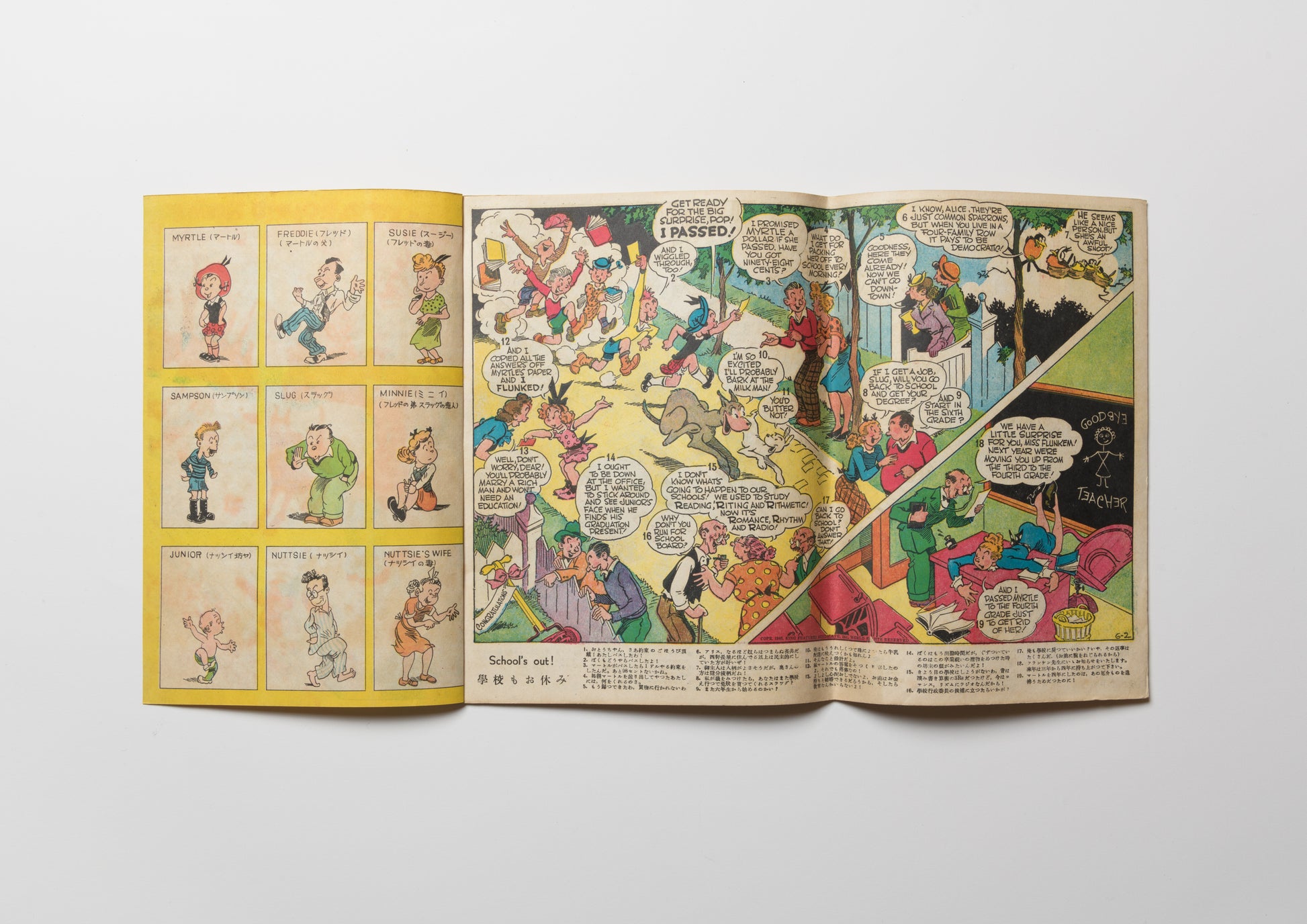 The book is based on 18 titles of the Sunday newspaper comic strip "RIGHT AROUND HOME" that was serialized in America during and after the war. In the Japanese version published in 1947, the English text in the speech bubbles was left unchanged, but the Japanese translation was laid out outside the picture frame. It was popular with a wide range of people, from GHQ personnel stationed in Japan to Japanese people who wanted to learn English.It was apparently well received by readers.