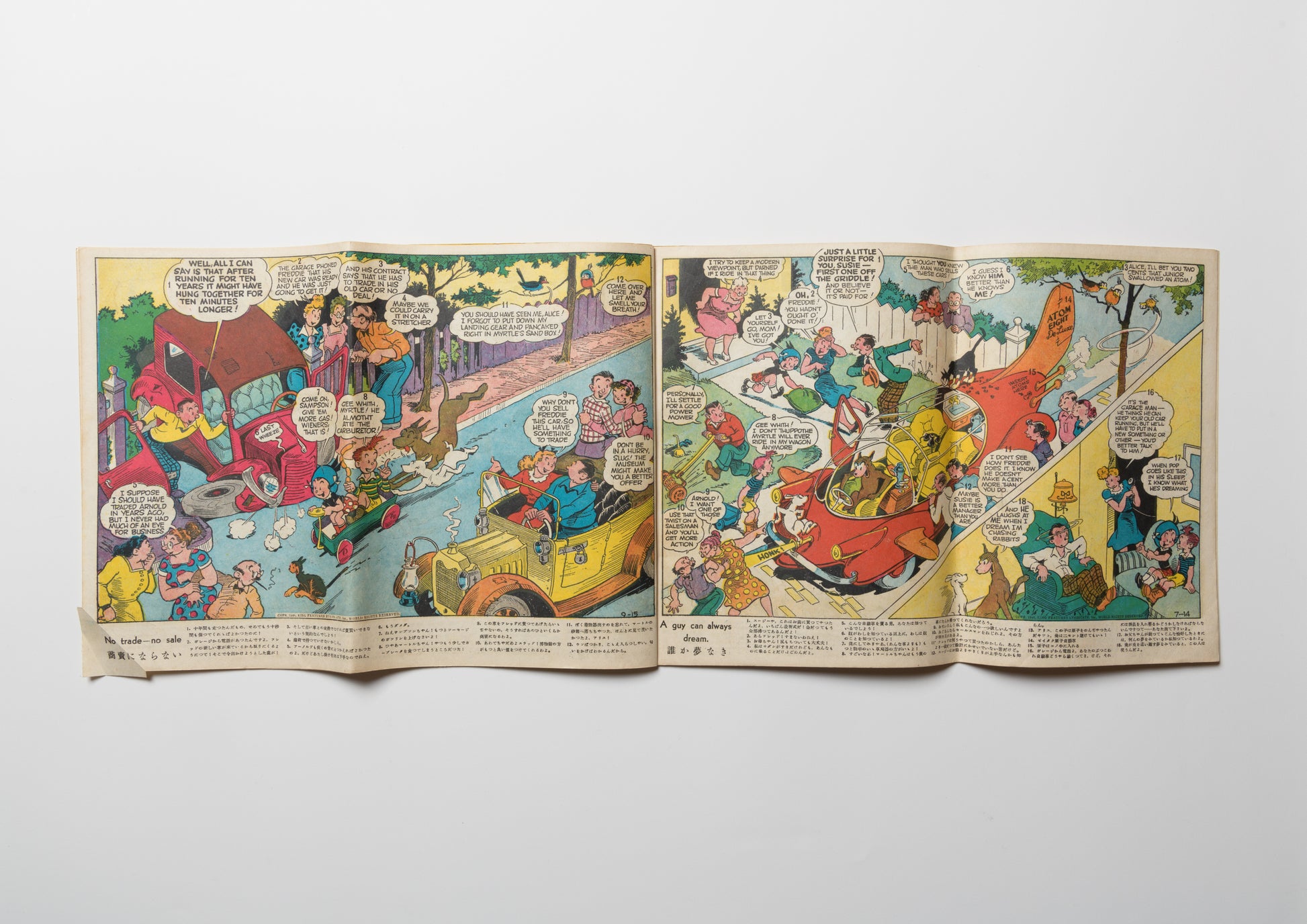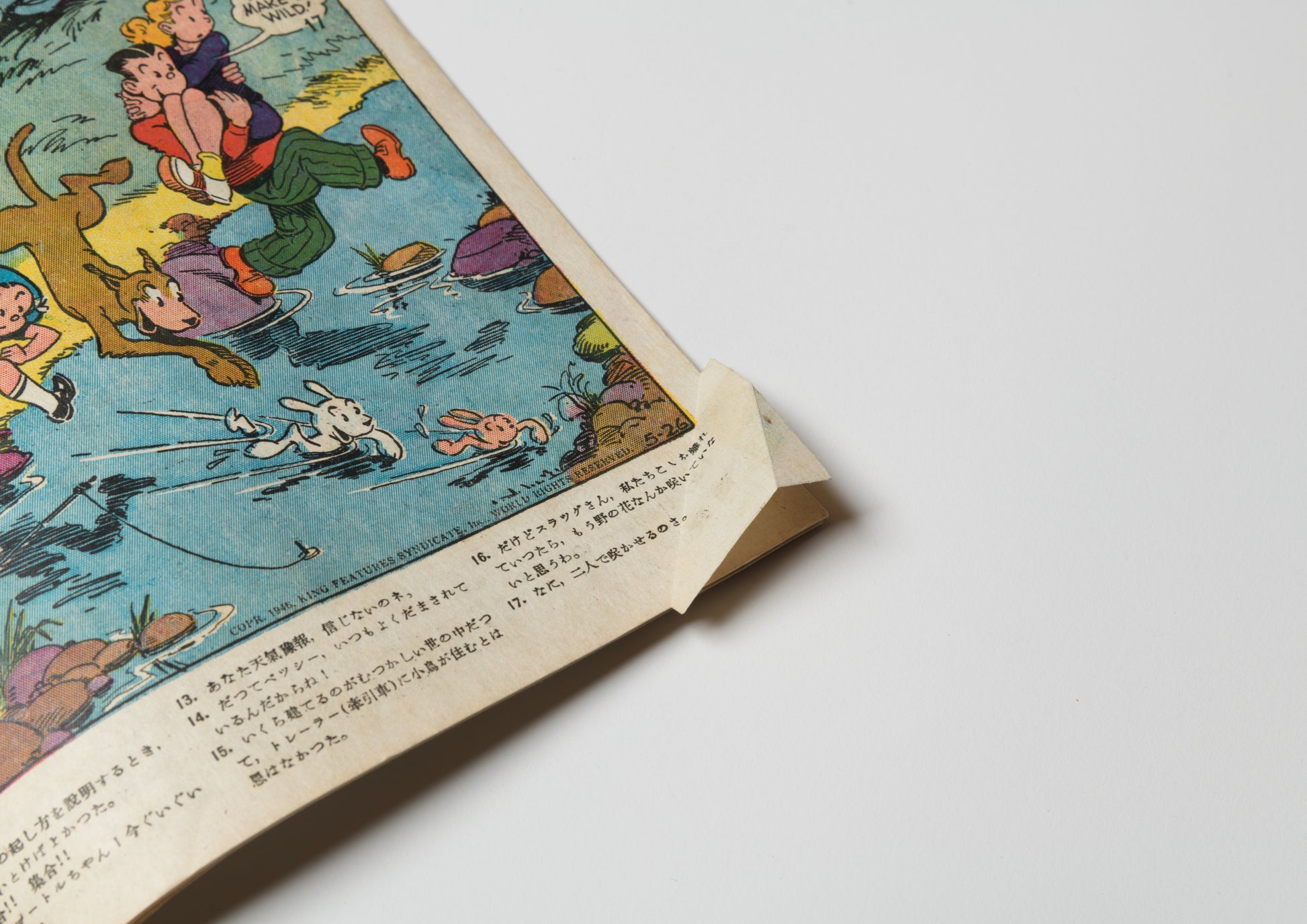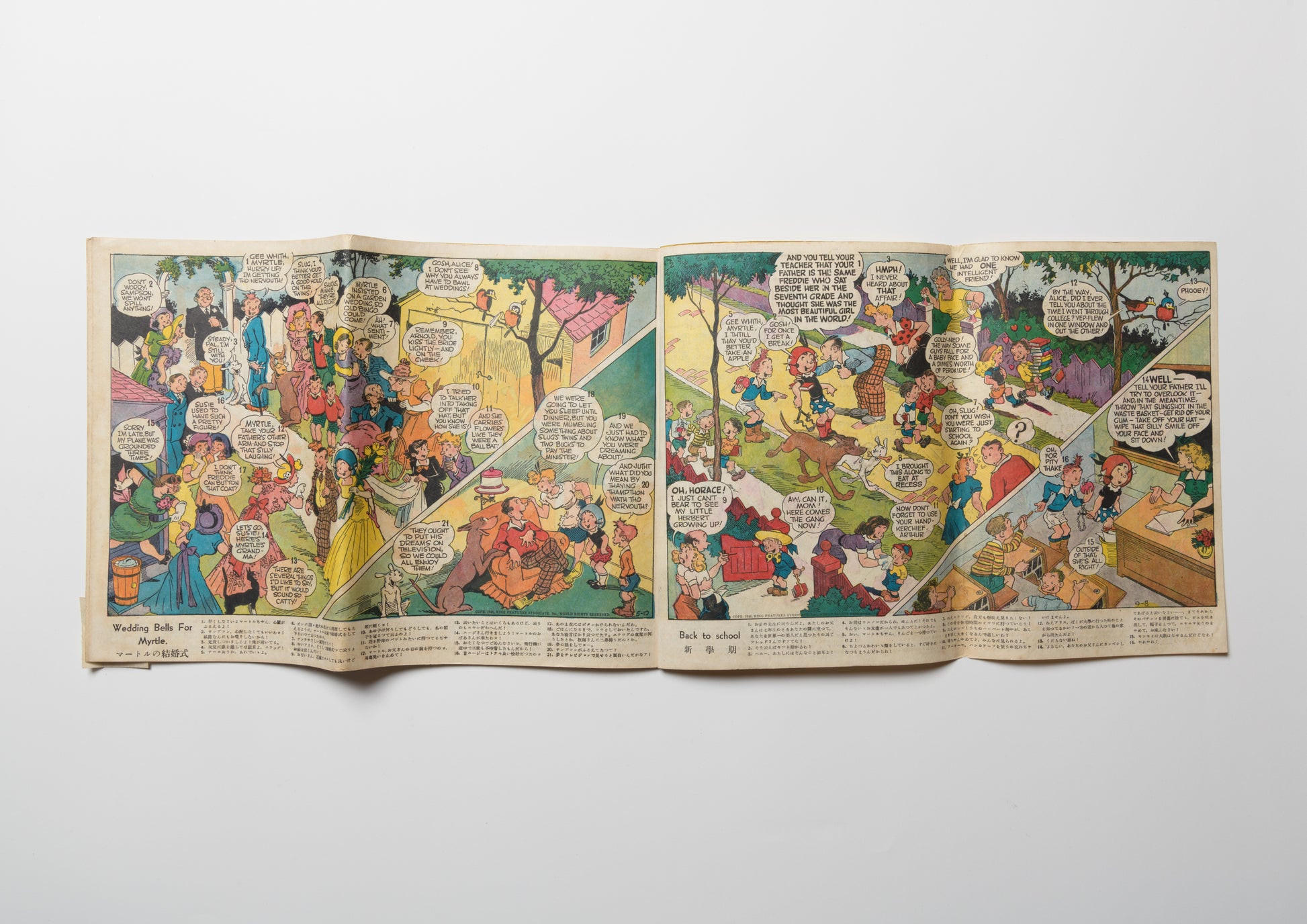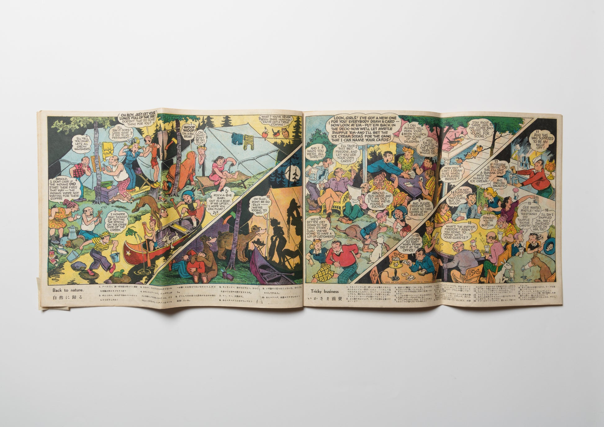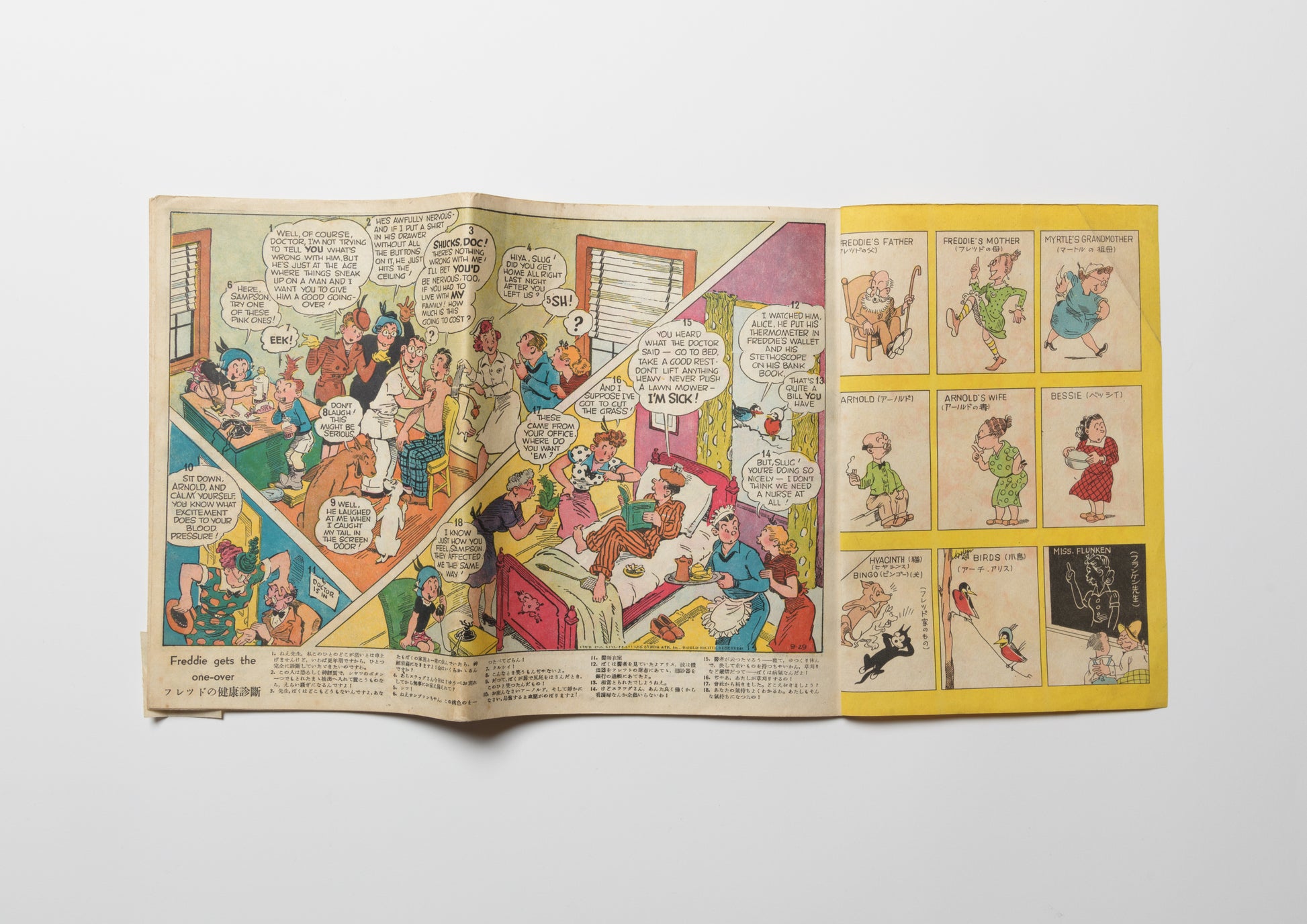 The book is based on 18 titles of the Sunday newspaper comic strip "RIGHT AROUND HOME" that was serialized in America during and after the war. In the Japanese version published in 1947, the English text in the speech bubbles was left unchanged, but the Japanese translation was laid out outside the picture frame. It was popular with a wide range of people, from GHQ personnel stationed in Japan to Japanese people who wanted to learn English.It was apparently well received by readers.