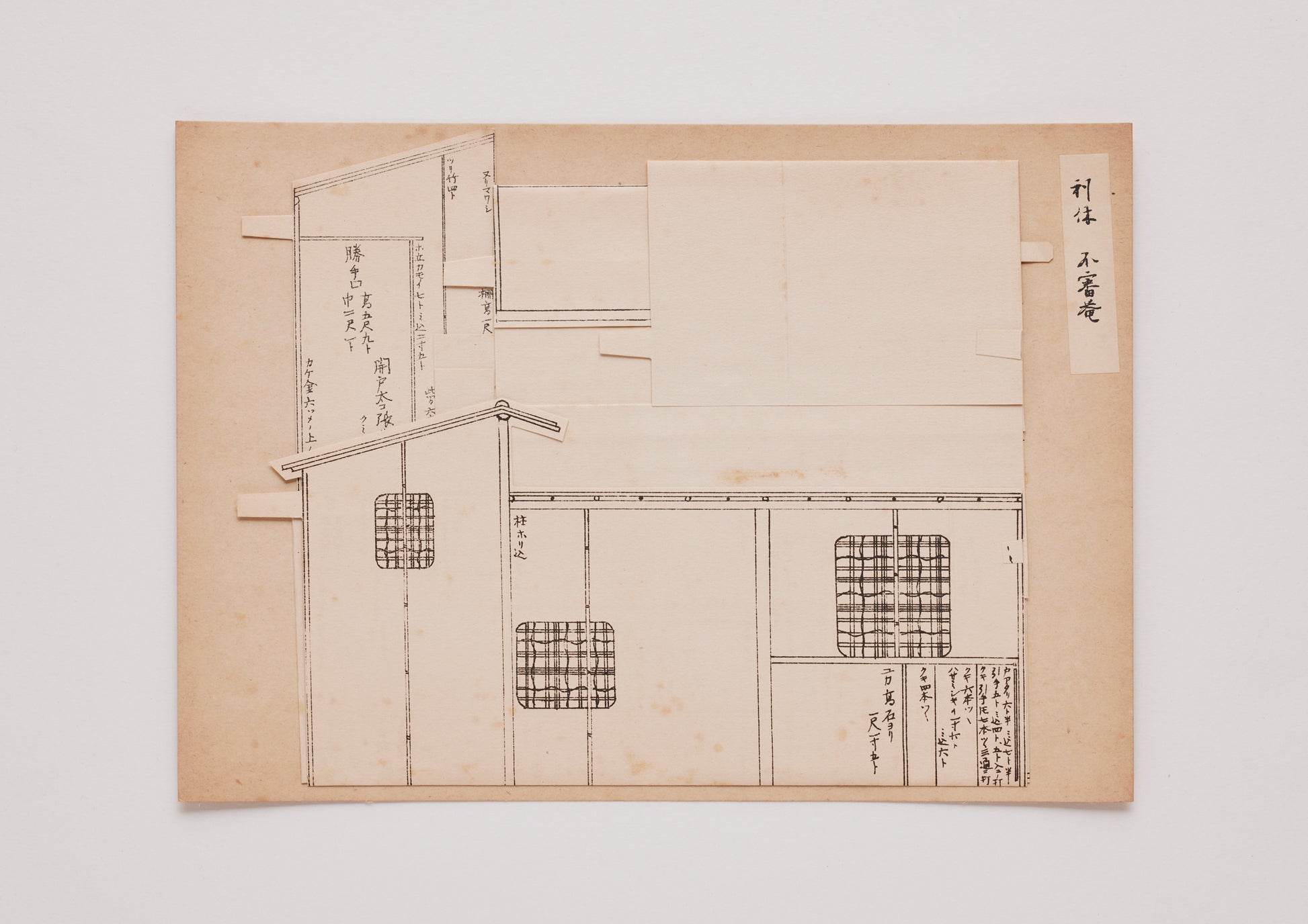 We will introduce you to some of the most inventive "Okoshi-ezu" (raising the teahouse), from famous teahouses by Rikyu, Oribe, and Korin that existed in the 400 years since the birth of the teahouse, to the surrounding areas of the teahouse such as Setsugakure, Mizuyari, and Nakasen. The folded paper is raised and the nails are inserted to make it stand upright without using glue. Suki means "like". The dimensions and materials are drawn in detail, and it greatly helped sukiya who had no knowledge or skills in architecture to express their "taste" without being bound by common sense. This small teahouse model was handed over by the tea master to a craftsman (a sukiya carpenter), who interpreted it and constructed it. This is a one-of-a-kind introduction from the "Sukiya Okoshi-ezu" (published in 1931), published by Zammaisha, which collected "Okoshi-ezu" (raising the teahouse) handed down to tea ceremony masters 90 years ago and published in limited quantities.