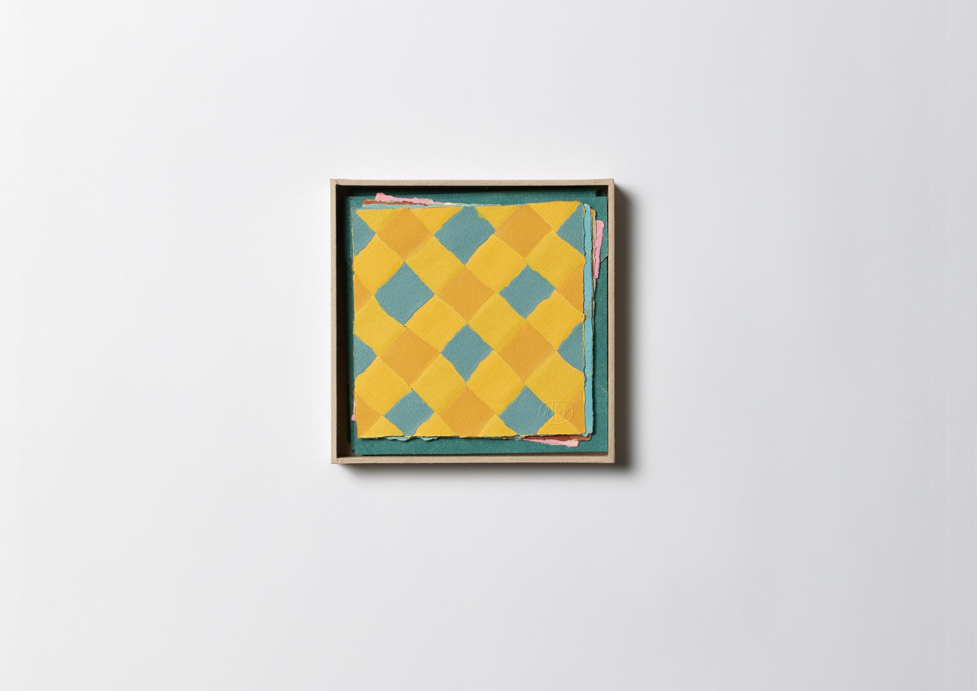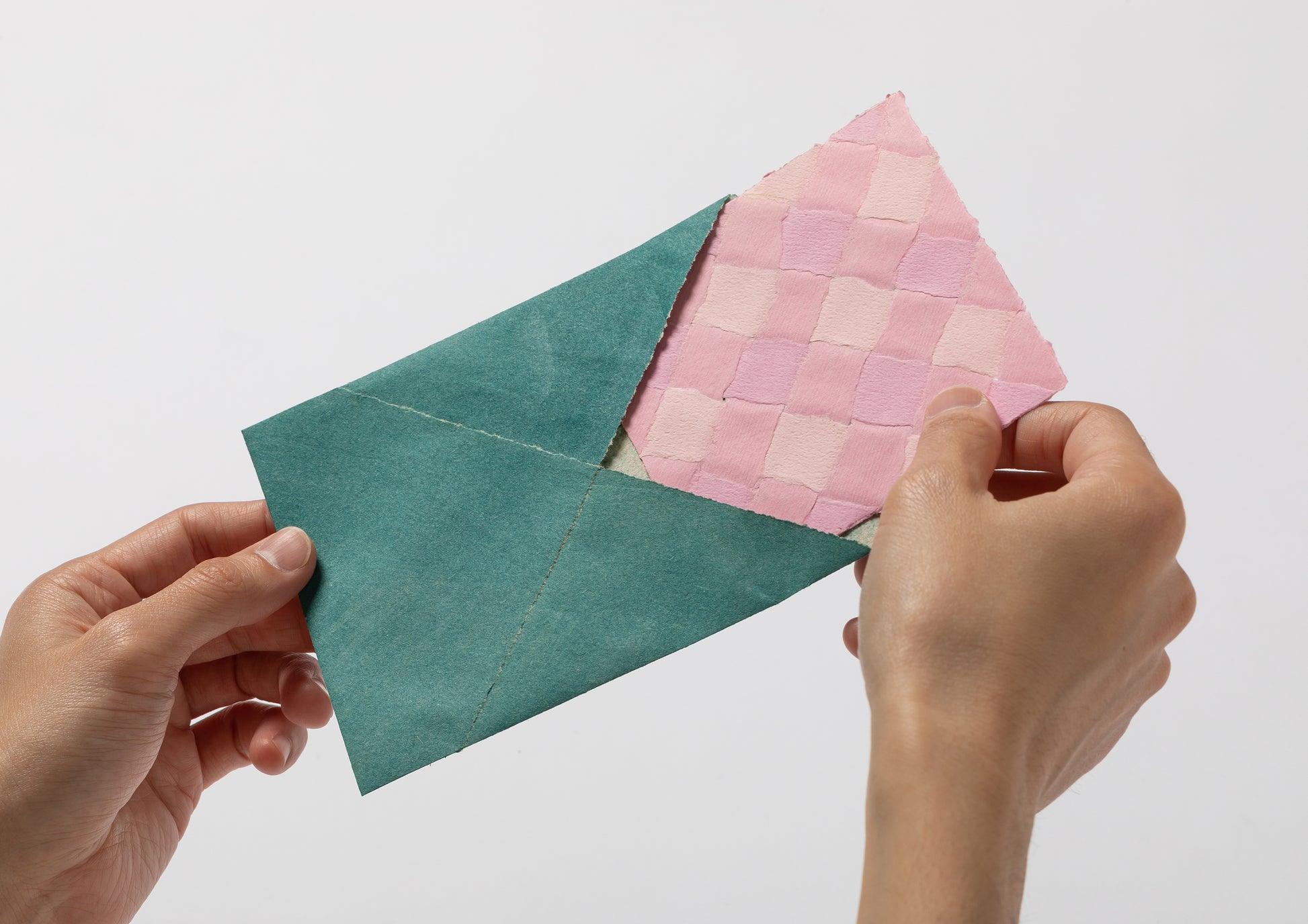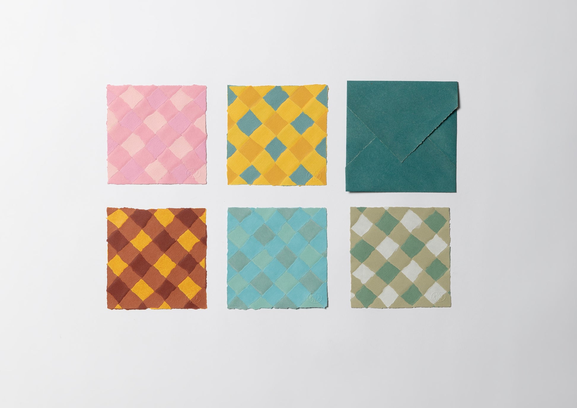 Inspired by the image of a building and the tiles that decorate its walls, the overlapping pieces of paper, angled at 45 degrees, are enclosed in a sky-blue box. However, it is different from the color of Barcelona. Because here, where we are now, there are also colors that are comforting and soothing. And it comes with an envelope so you can share it with someone.