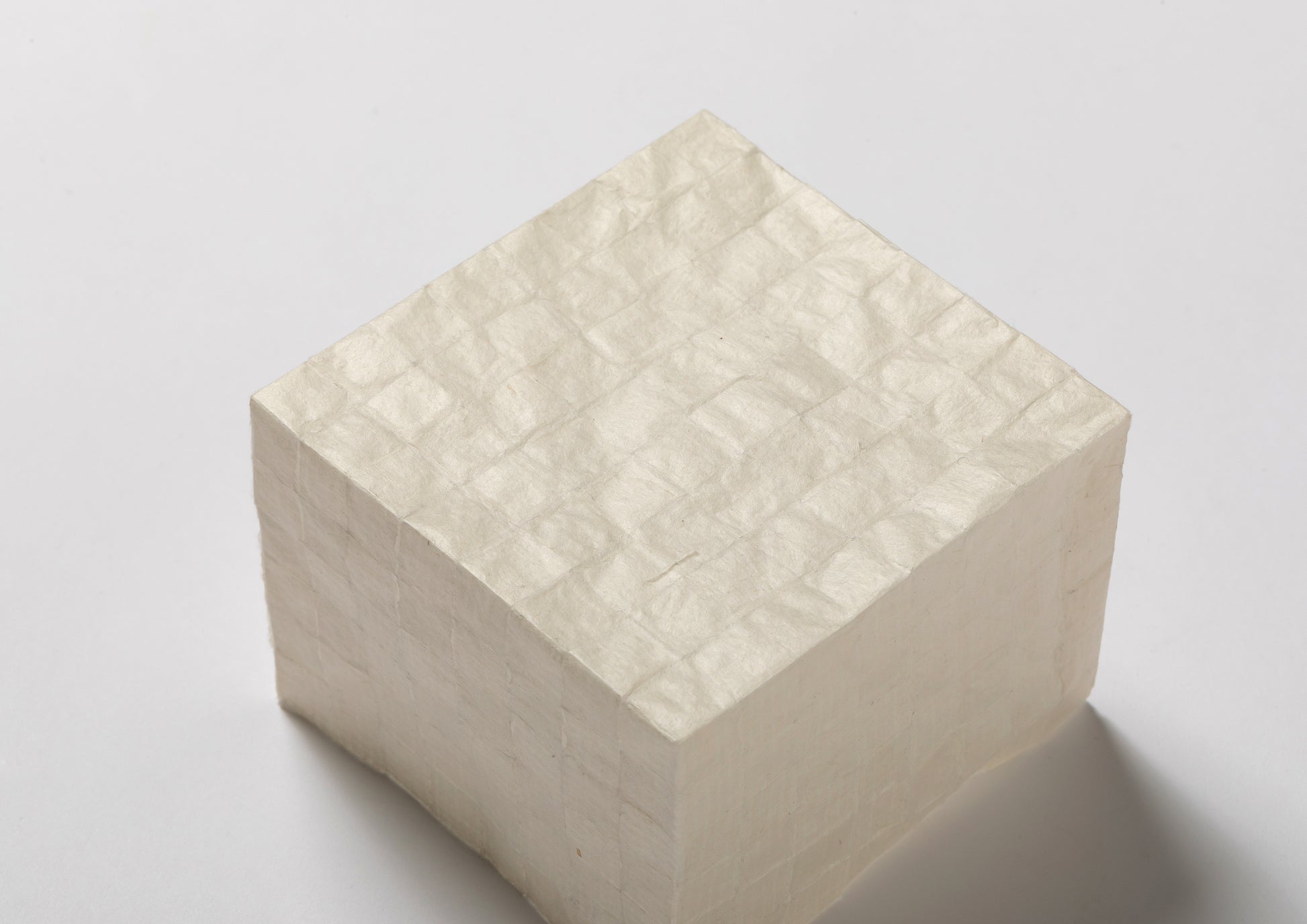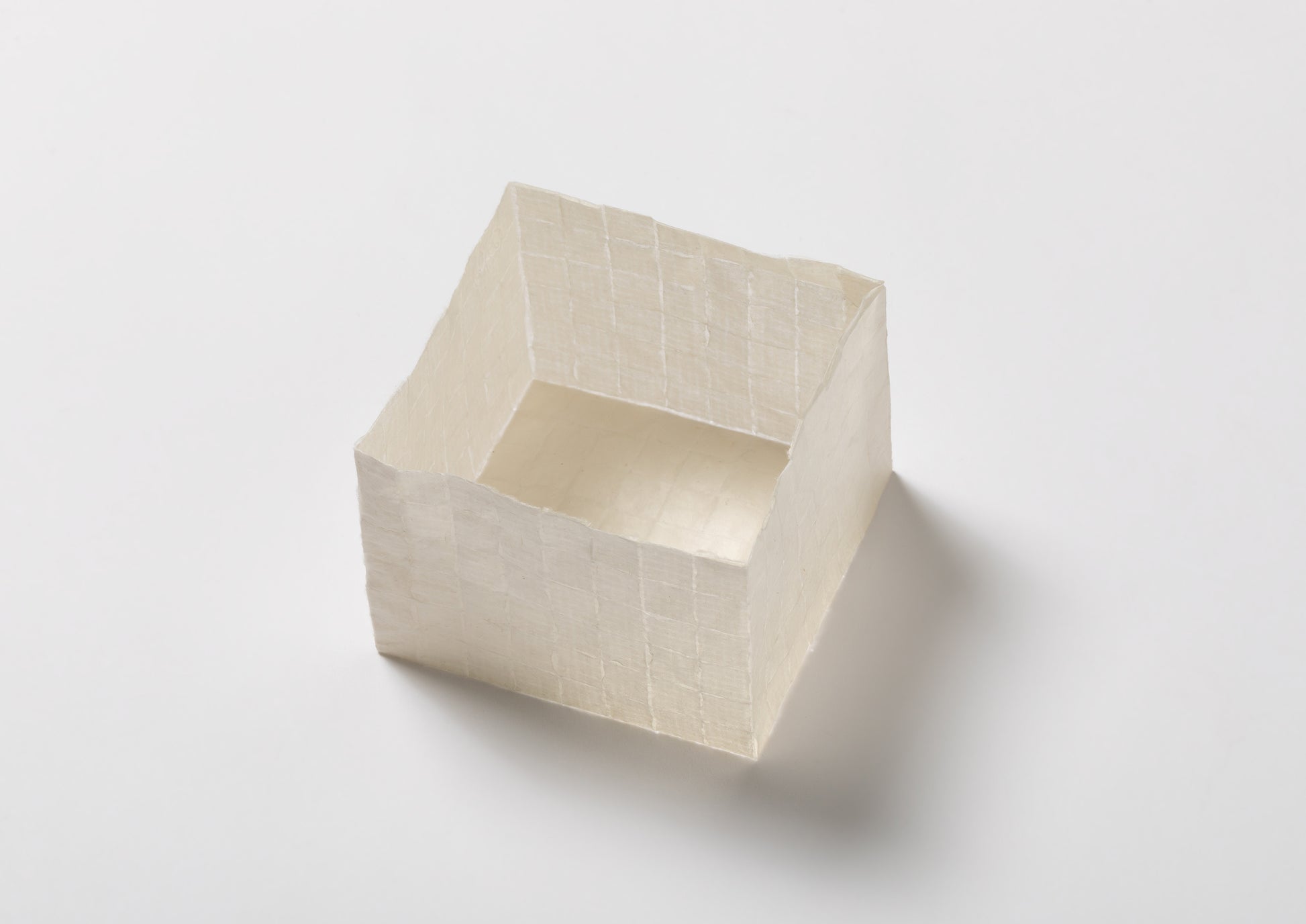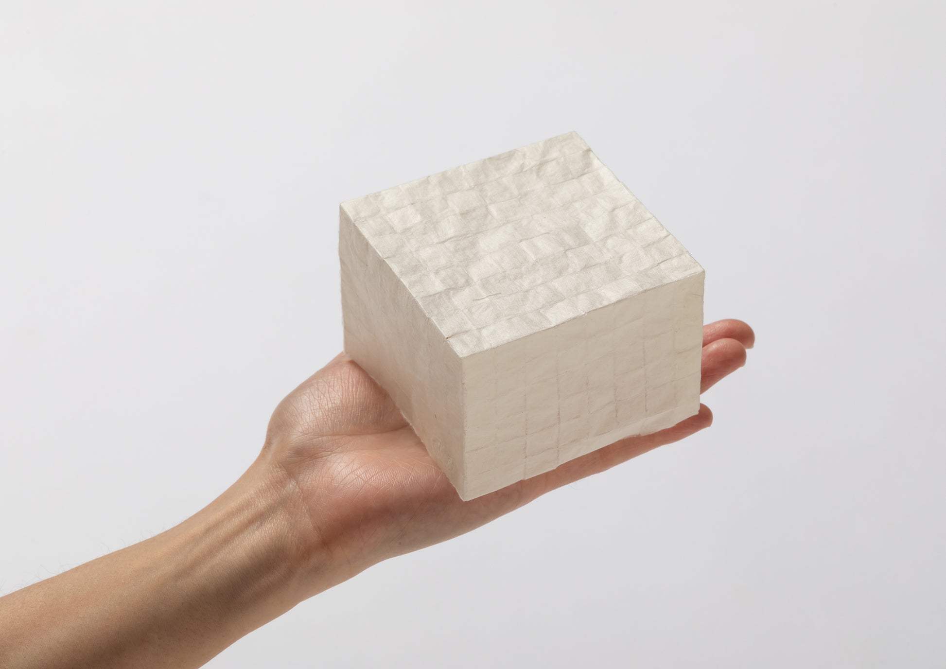 Using handmade Japanese paper, a craftsman tore and woven a cube of paper into shape. The process may be somewhat similar to that of making tofu. It looks like tofu, but it's not, and it's a shape that floats a little out of the ordinary and into space.