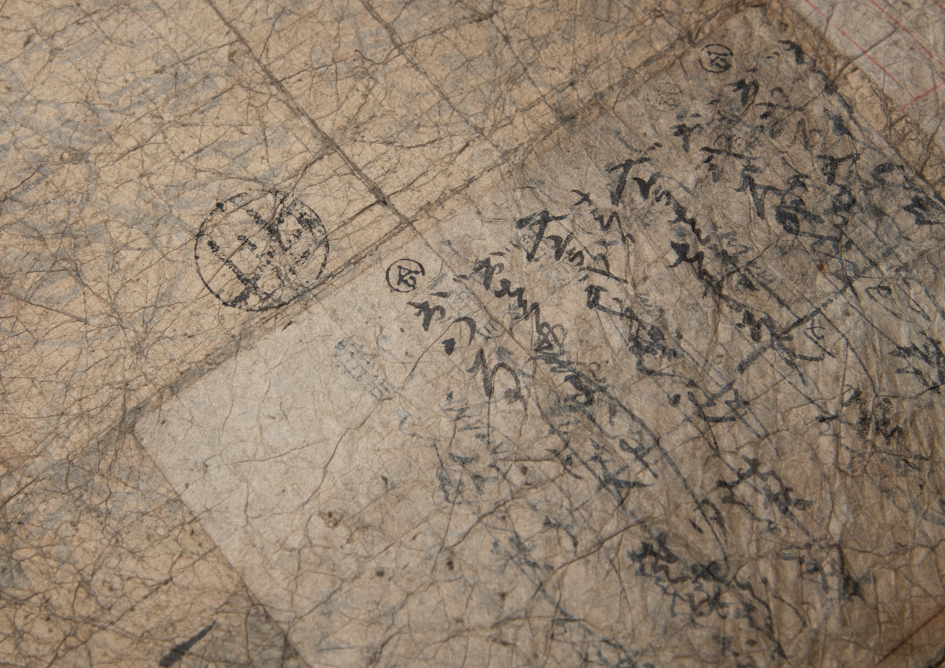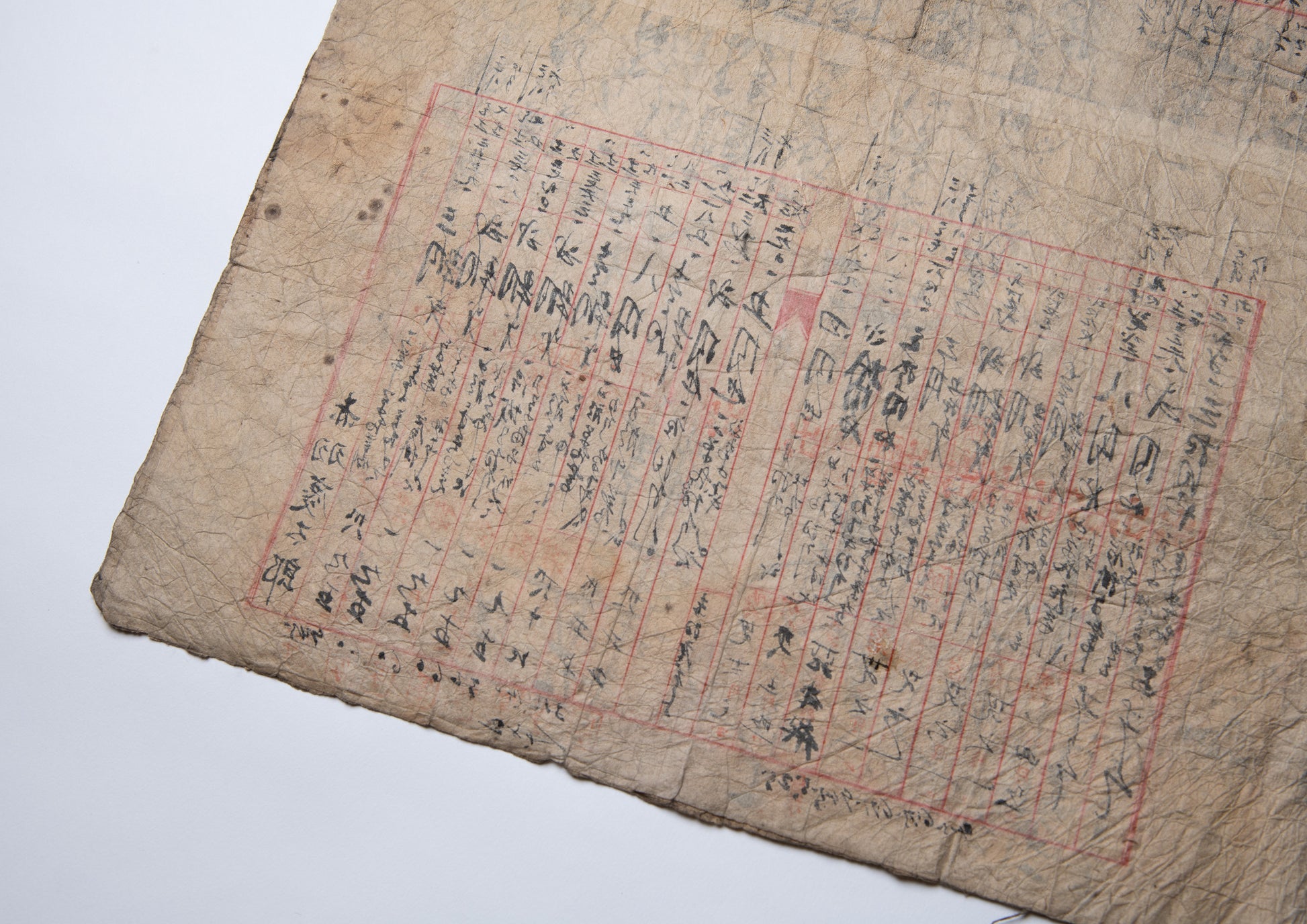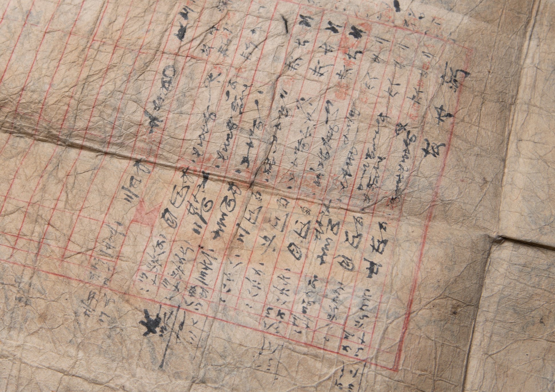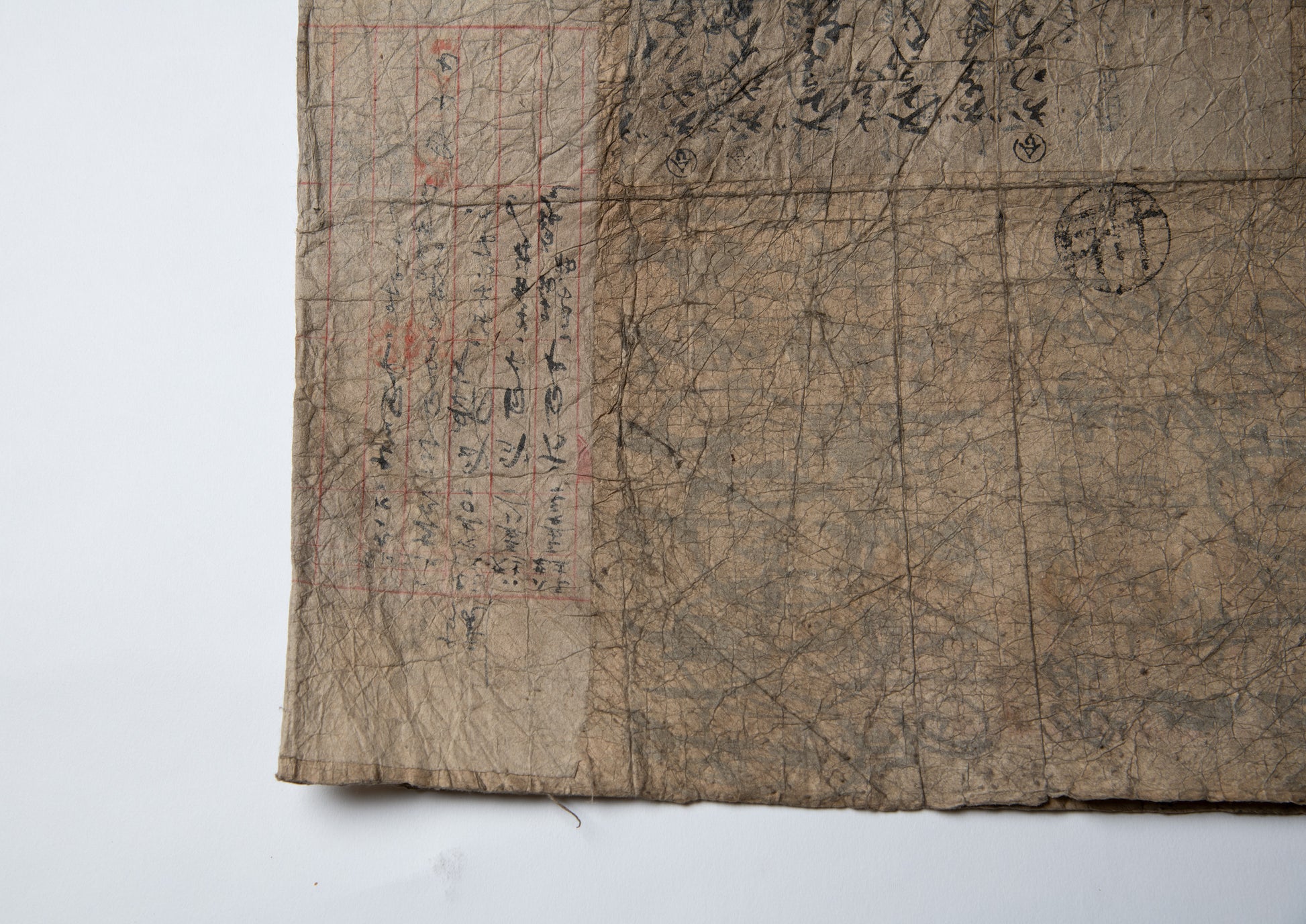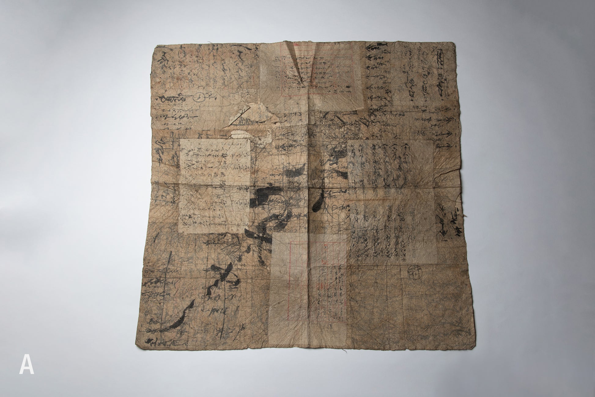 All the pawnbroker papers introduced here are believed to have come from a single pawnbroker, with the oldest dating back to the end of the Edo period and the newest dating back to the end of the Taisho period. Many of them are made from untied pawnbroker ledgers, and it is interesting to note that they are stuck together back-to-back to make them difficult to read, perhaps due to the professional ethics of the pawnbrokers. Other pieces include washi paper that appears to be calligraphy mistakes, a Meiji science textbook with copperplate illustrations showing through it, and notebooks with red and blue lines, all the washi paper that was around us and no longer needed (and all of it is back-to-front). They were not simply pasted together to make them larger, but were layered three or four times, and weak or damaged parts were patched with more washi paper. As a result of thorough use, they have become pliable and soft, with a texture and feel that is almost like cloth.