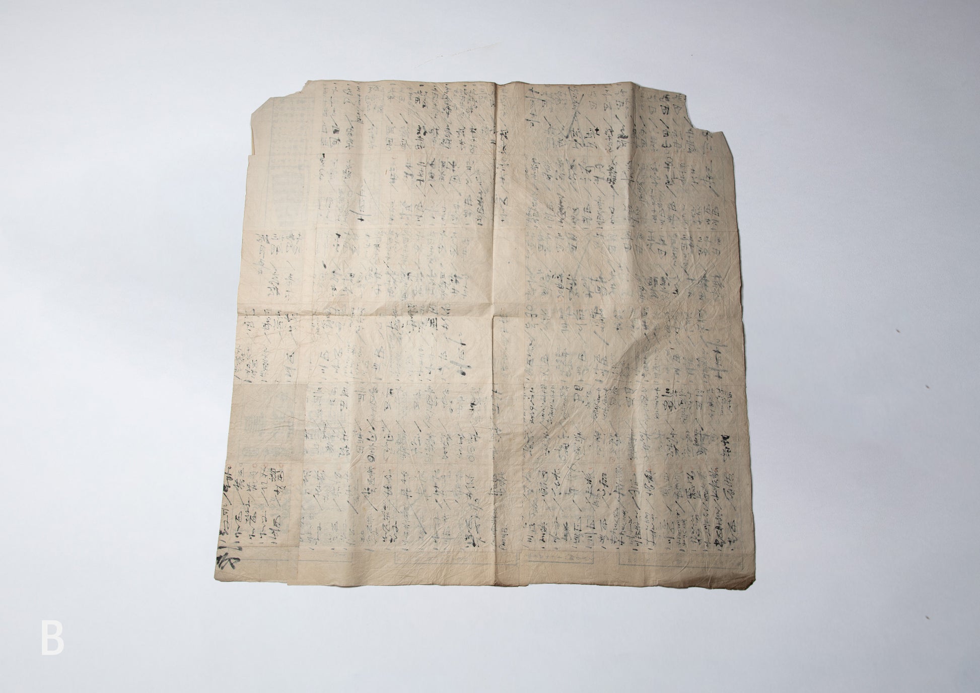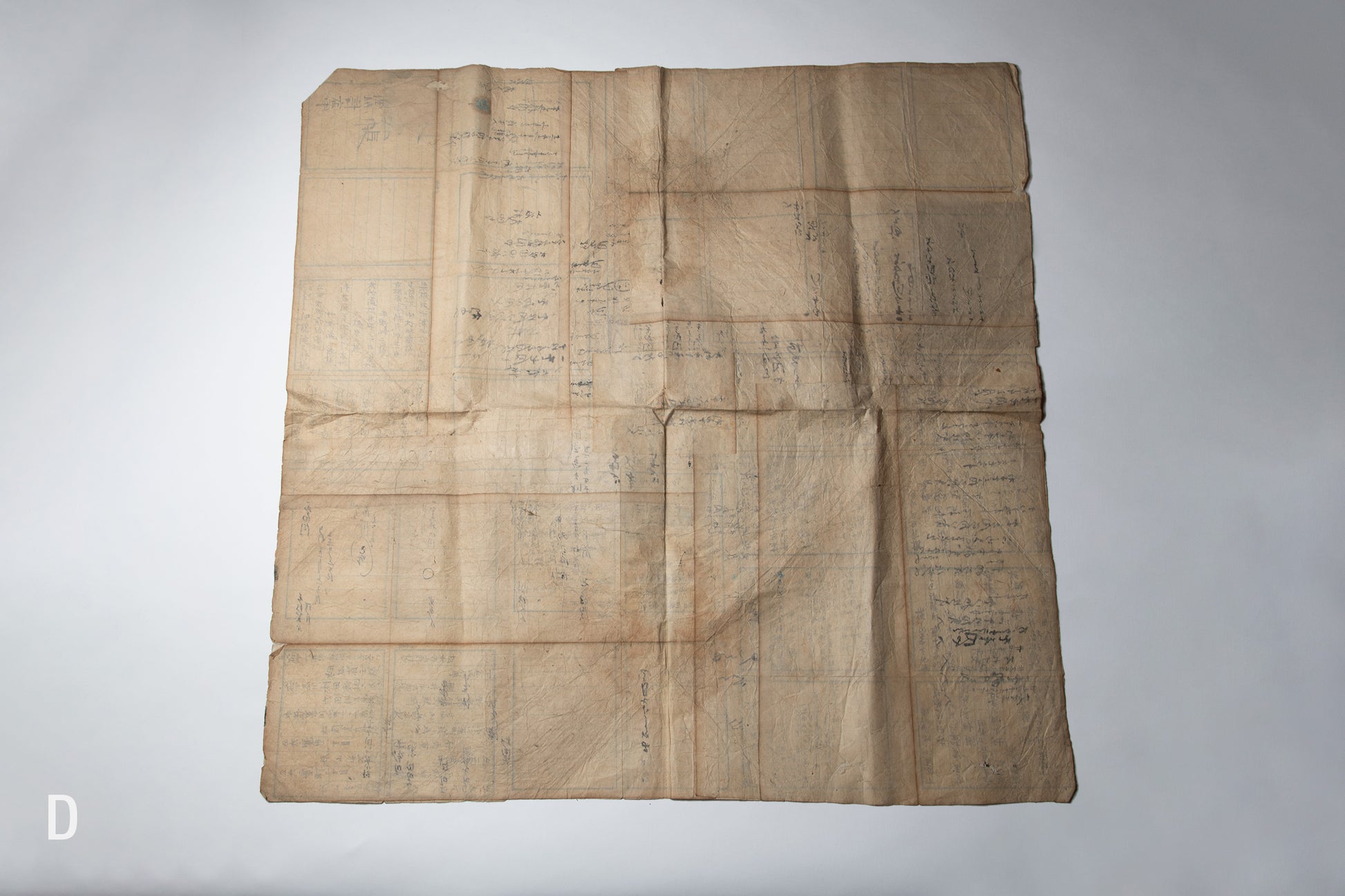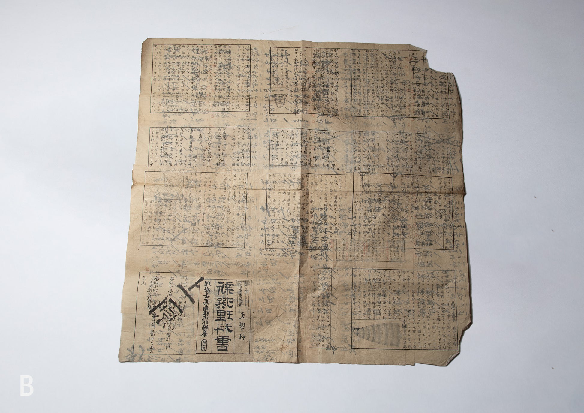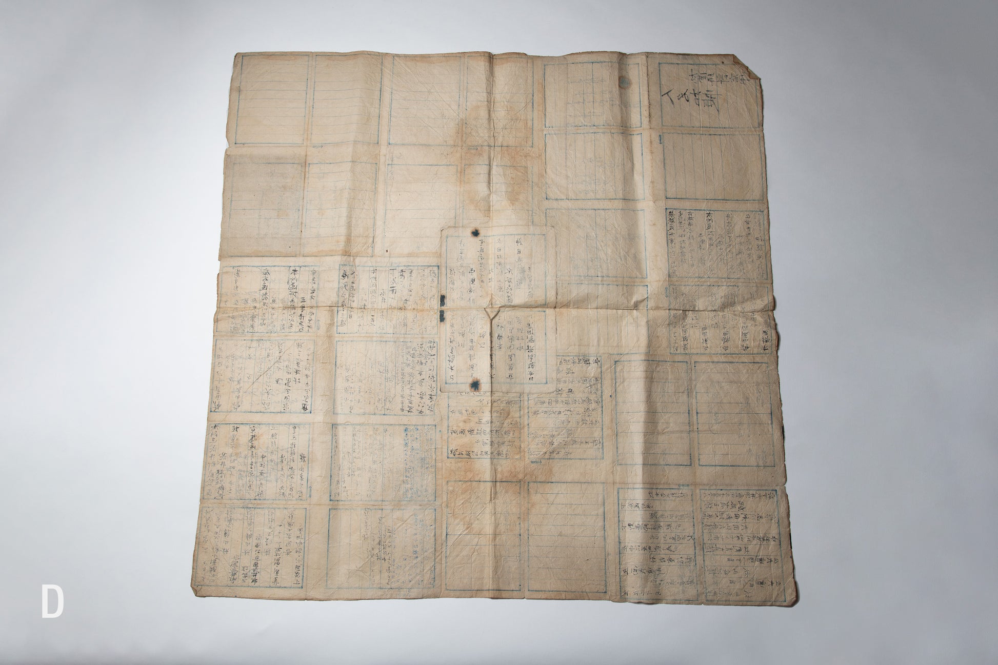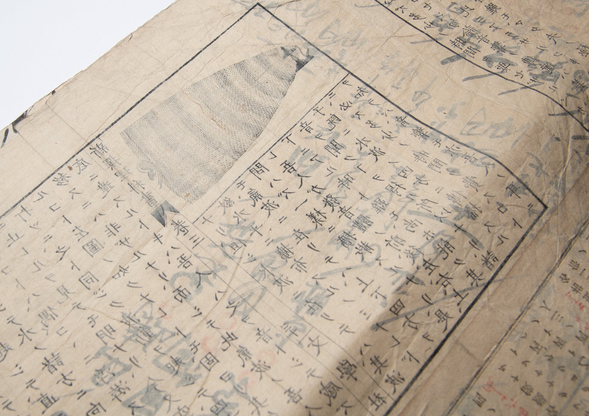 All the pawnbroker papers introduced here are believed to have come from a single pawnbroker, with the oldest dating back to the end of the Edo period and the newest dating back to the end of the Taisho period. Many of them are made from untied pawnbroker ledgers, and it is interesting to note that they are stuck together back-to-back to make them difficult to read, perhaps due to the professional ethics of the pawnbrokers. Other pieces include washi paper that appears to be calligraphy mistakes, a Meiji science textbook with copperplate illustrations showing through it, and notebooks with red and blue lines, all the washi paper that was around us and no longer needed (and all of it is back-to-front). They were not simply pasted together to make them larger, but were layered three or four times, and weak or damaged parts were patched with more washi paper. As a result of thorough use, they have become pliable and soft, with a texture and feel that is almost like cloth.