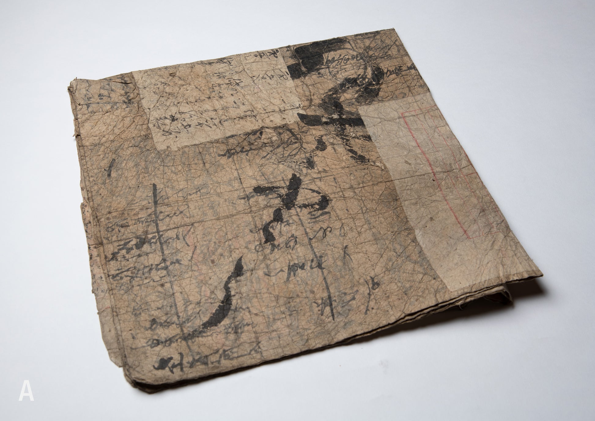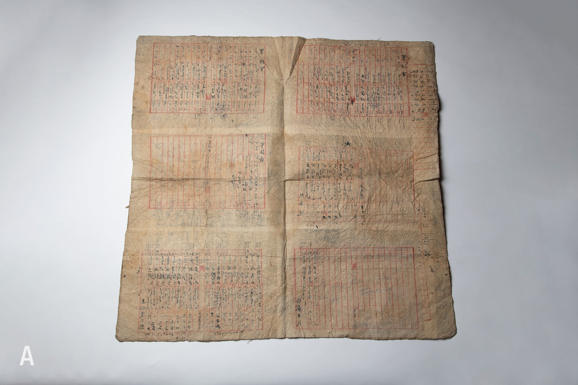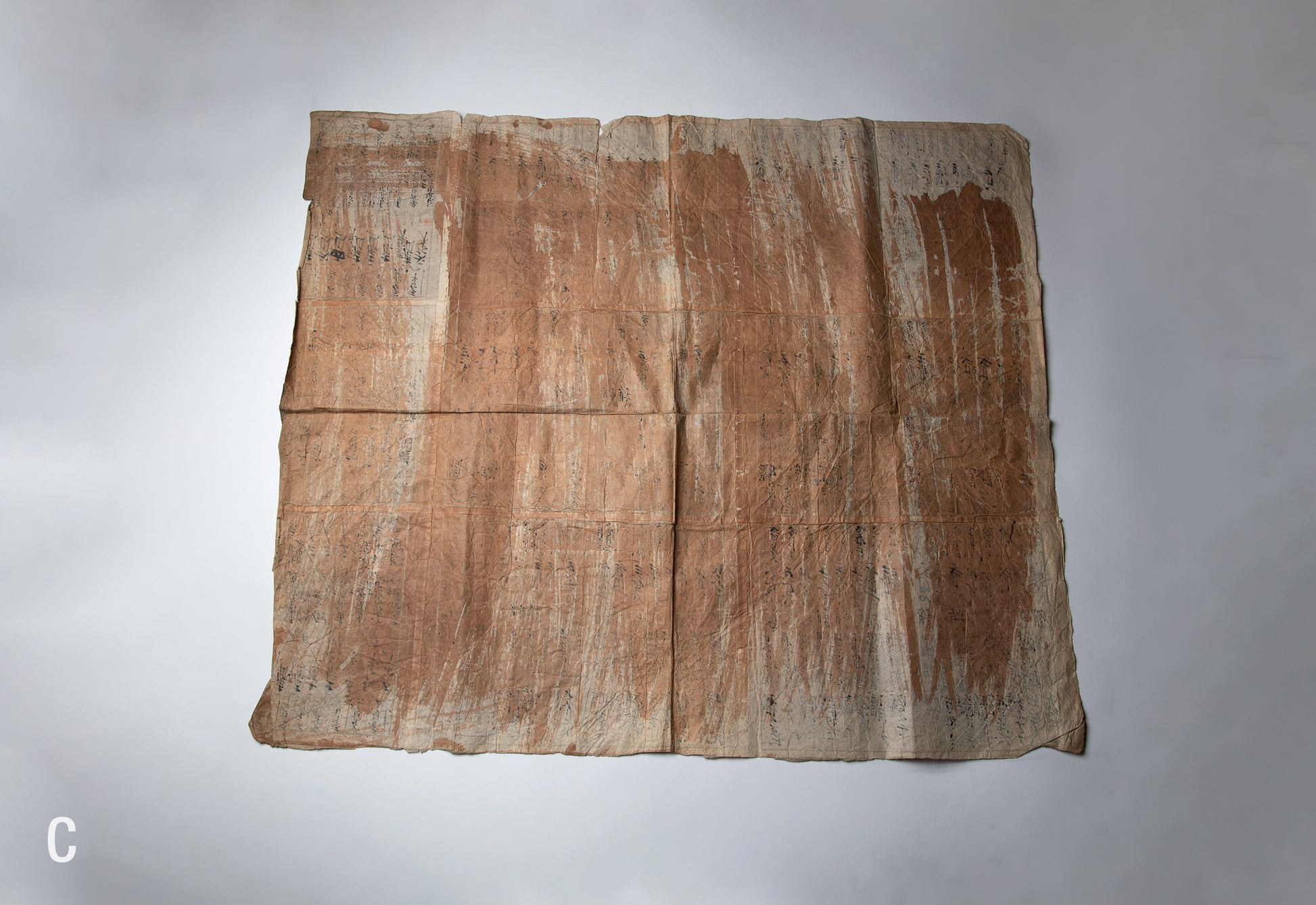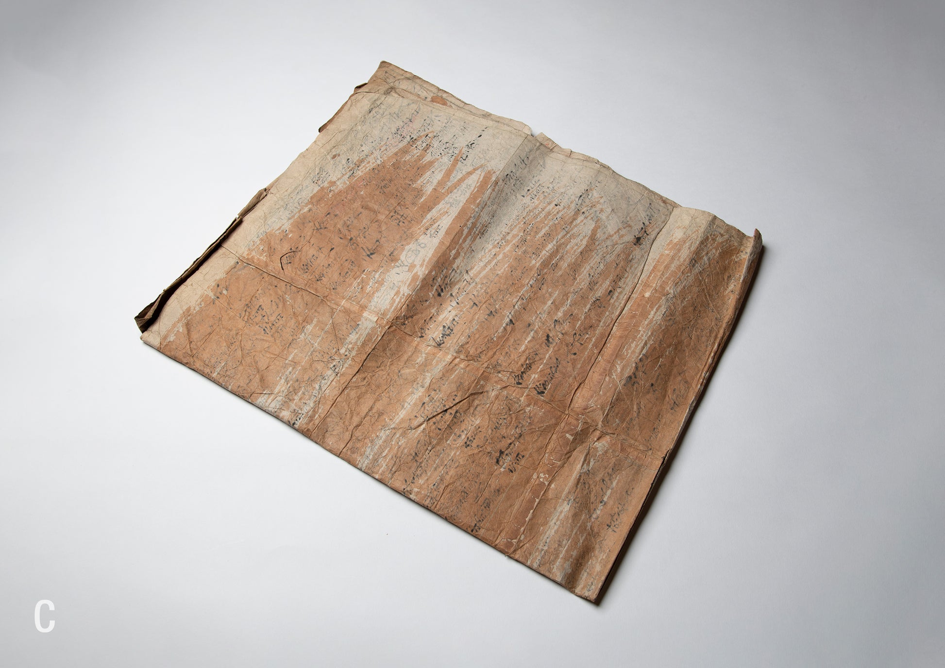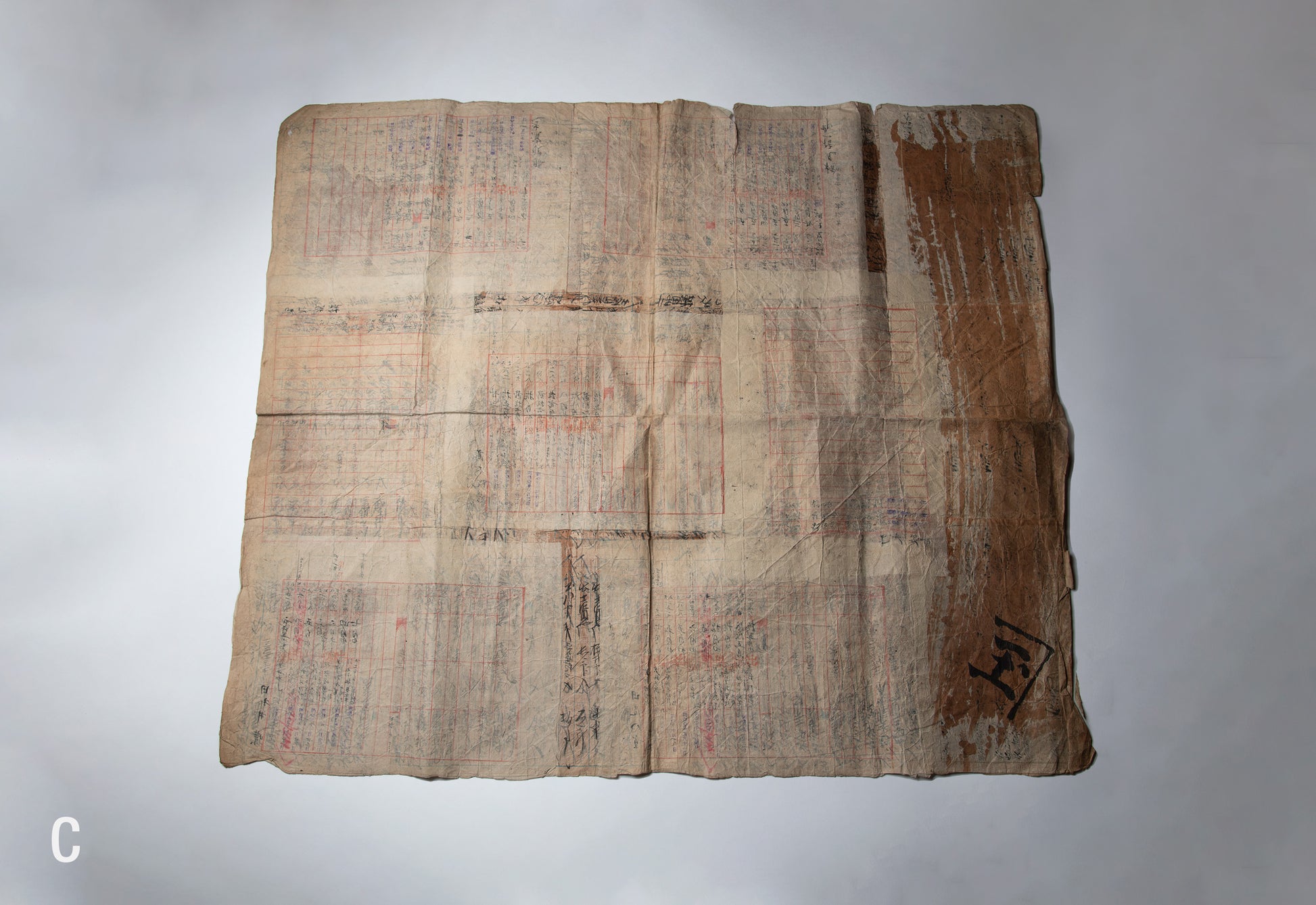 The item we are introducing this time, <A>, is particularly old among the entire cardboard box full of pawnbroker papers that arrived, and is an impressive piece that is almost bizarre in appearance. I have never seen anything like it anywhere else.<B><C>DThe ones that look like they are dyed brown are actually made by brushing on persimmon tannins, which is thought to be a preservative and insect repellent.