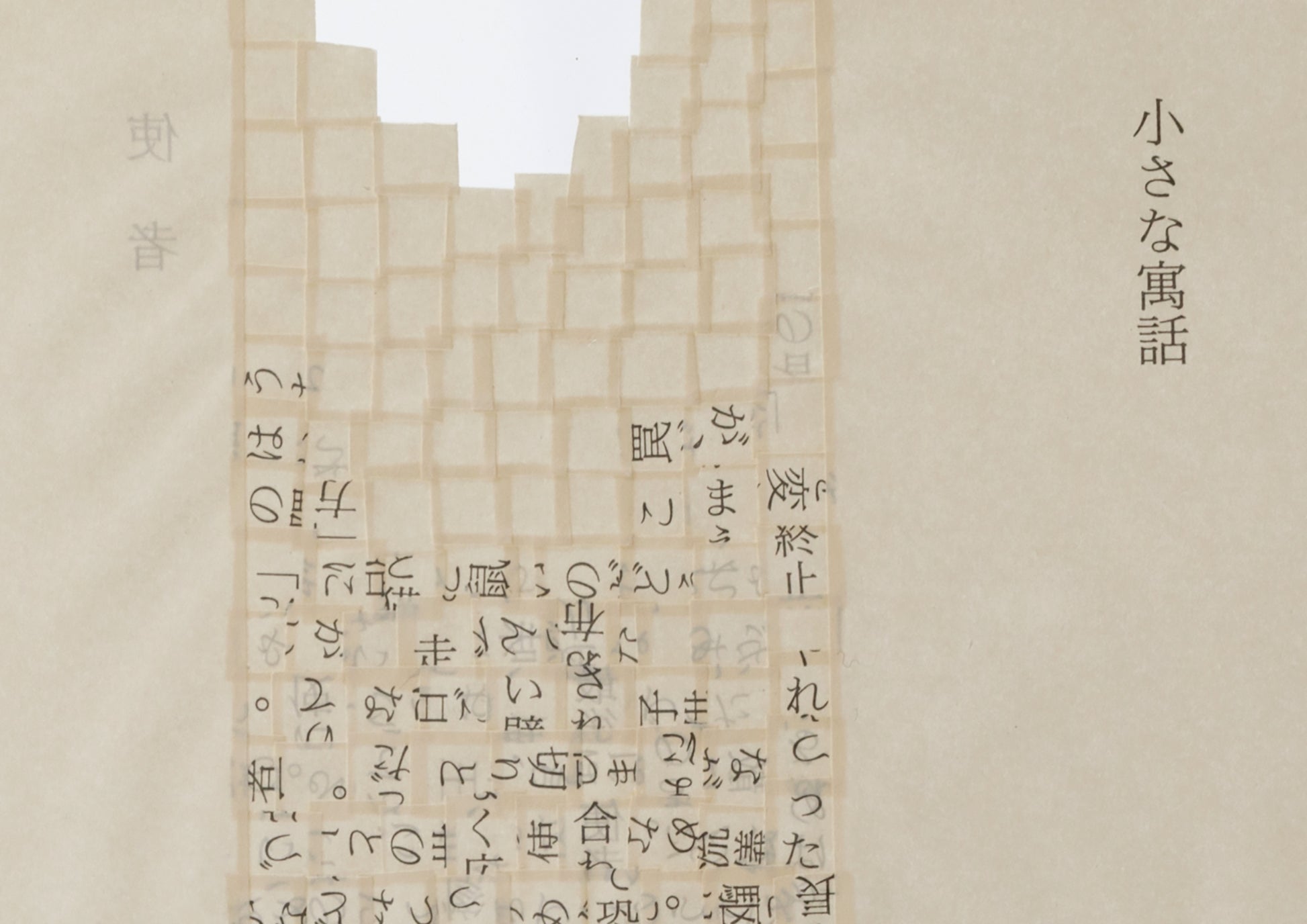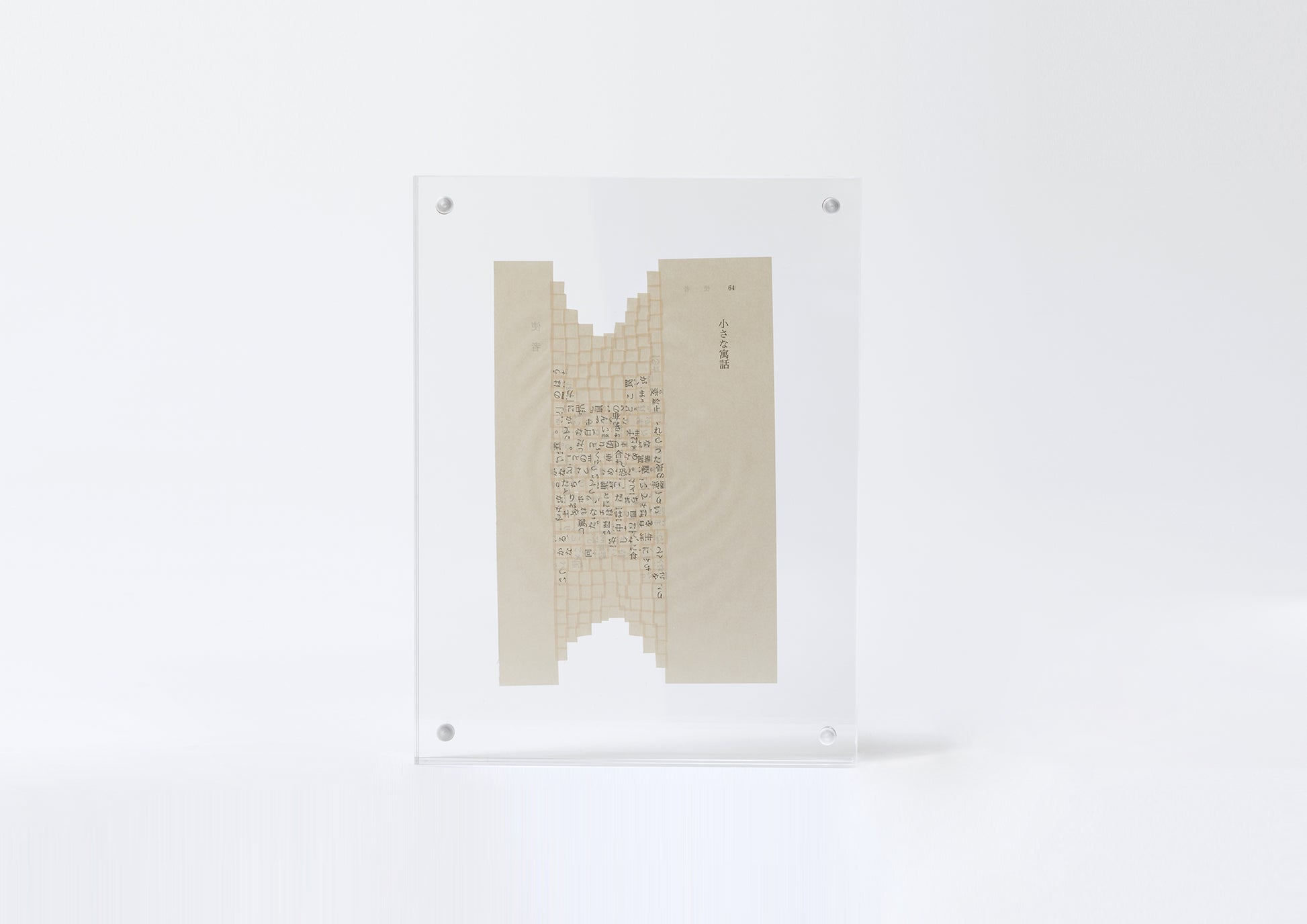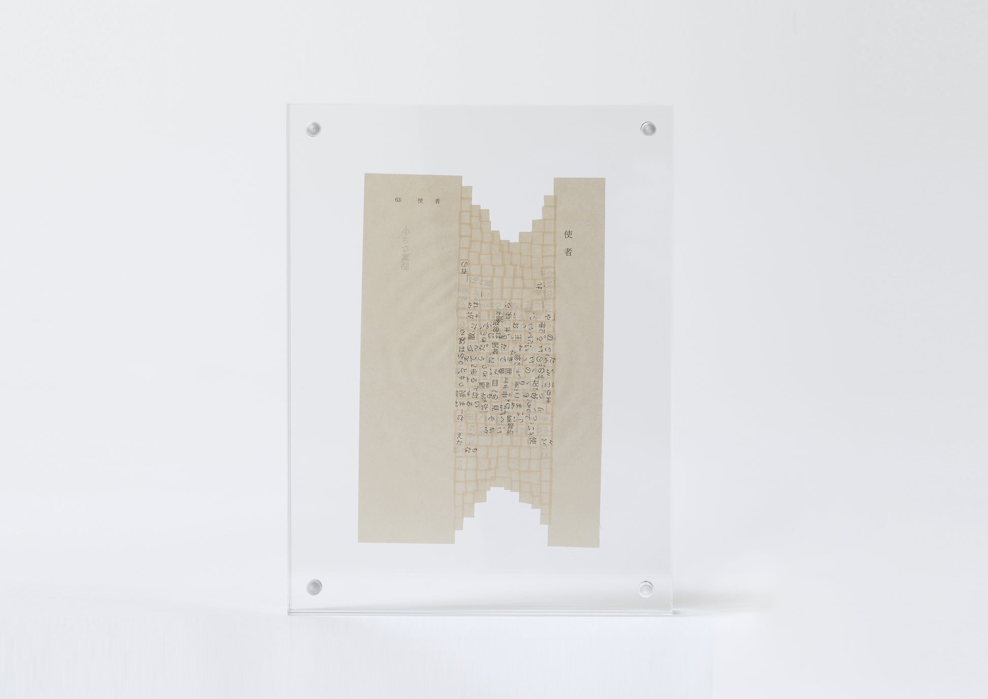 The short story "Kafka's Fables" (Iwanami Bunko/translated by Ikeuchi Ki)"The Messenger" and "A Little Fable"" was cut up into two pages (one sheet of paper) and then randomly glued together again without losing a single character. This strange piece perfectly captures the unique feature of a book, which is that there is text on both sides of the paper. It is sandwiched between thick acrylic panels so that it can be viewed from both sides.