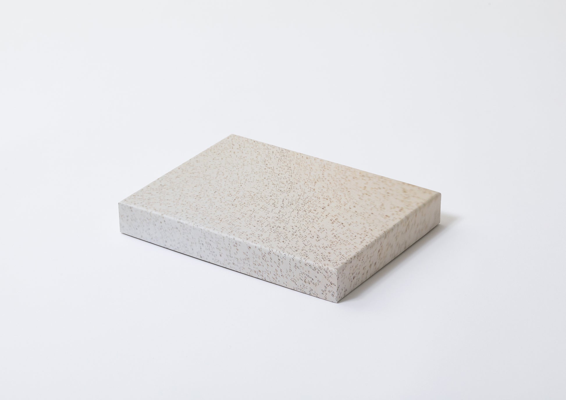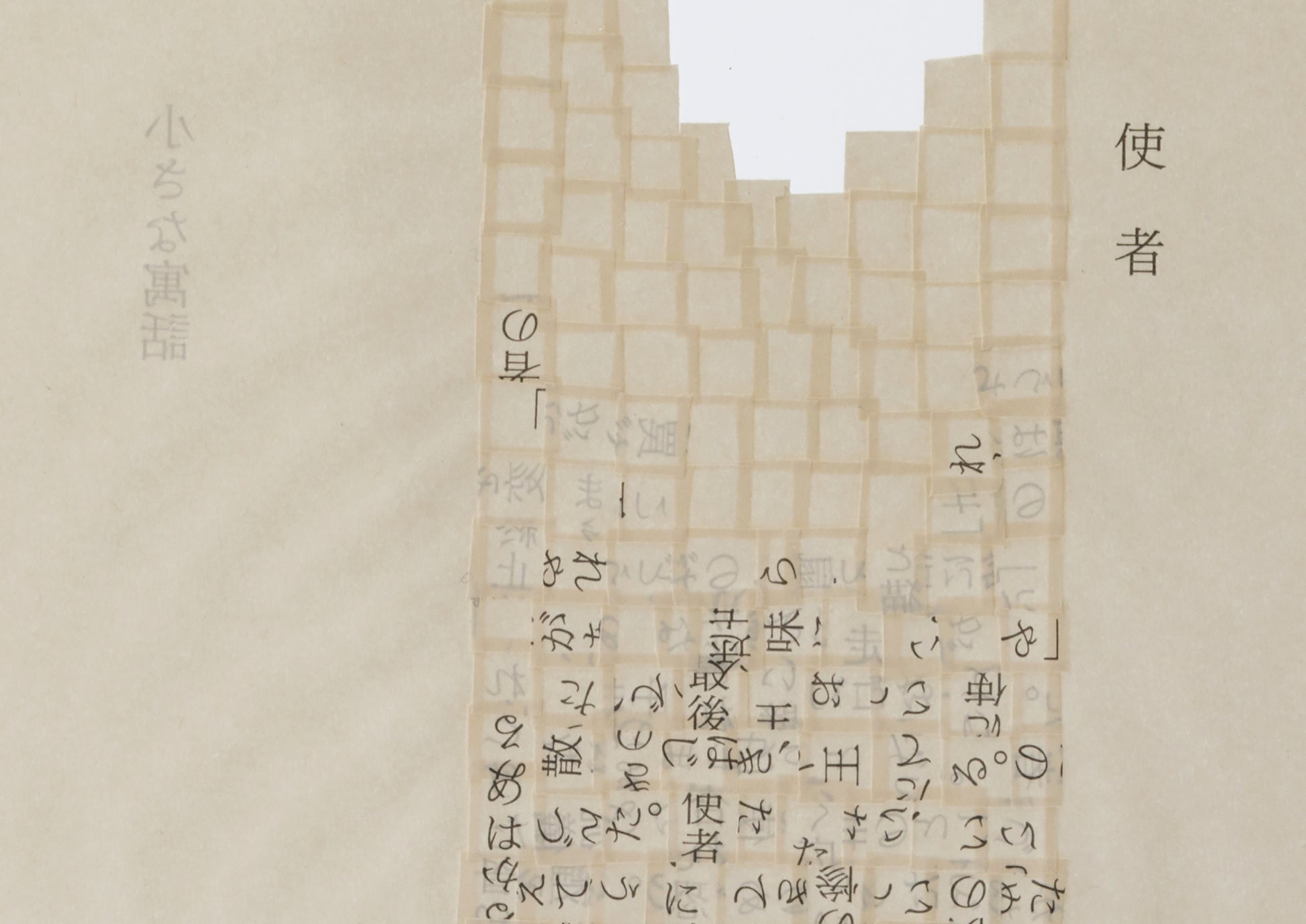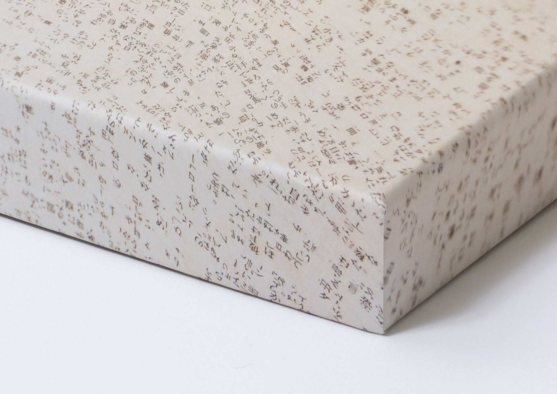 The short story "Kafka's Fables" (Iwanami Bunko/translated by Ikeuchi Ki)"The Messenger" and "A Little Fable"" was cut up into two pages (one sheet of paper) and then randomly glued together again without losing a single character. This strange piece perfectly captures the unique feature of a book, which is that there is text on both sides of the paper. It is sandwiched between thick acrylic panels so that it can be viewed from both sides.