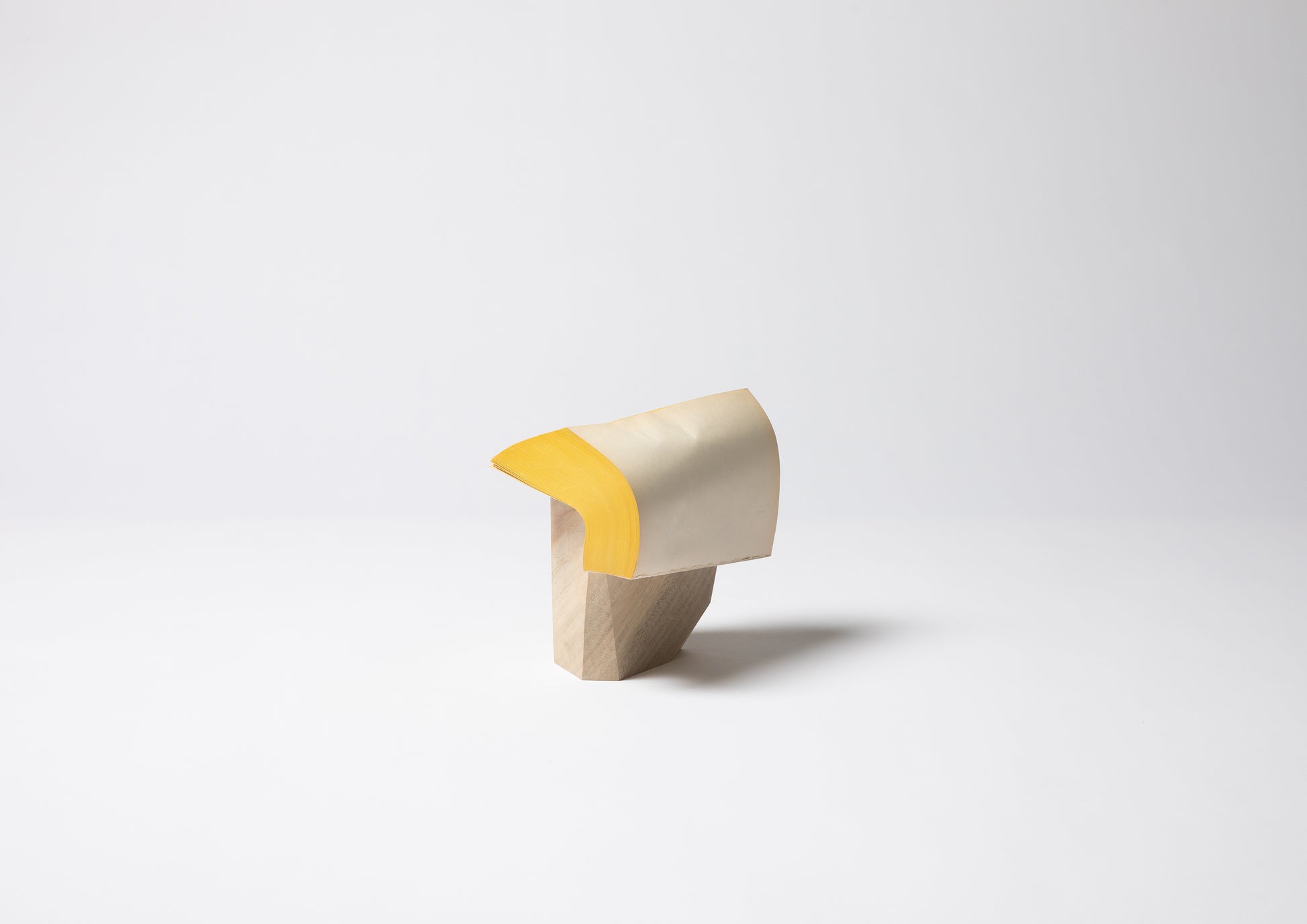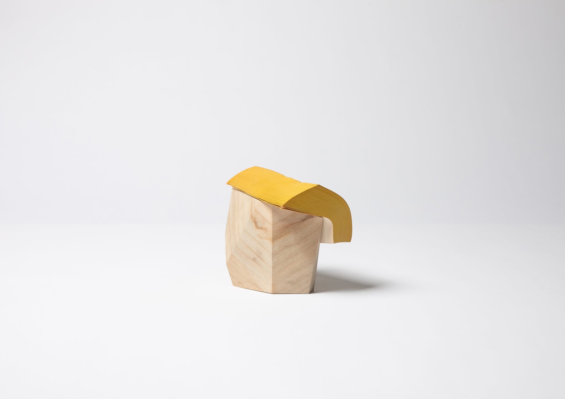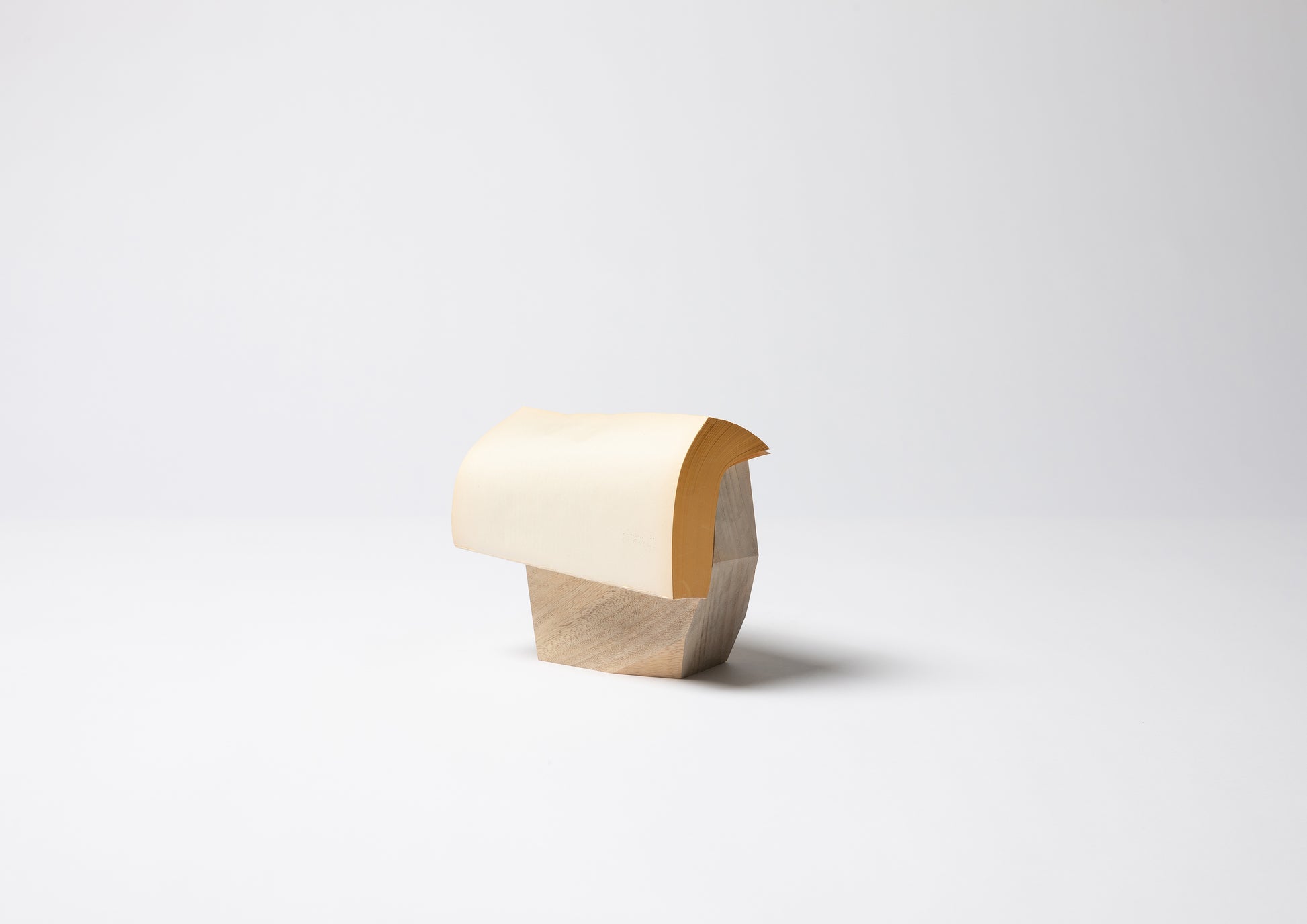 Fragile Exhibition in June 2023 is pleased to present "SILENT BOOK," a solo exhibition by Ryuta Iida. This work, which he began working on in 2019, the year of the Corona Disaster, shows a book that has passed through the hands of many people and is now crumpled. For Ryuta Iida, who sculpts from paper and used books, sculpting means sealing them, and in the past he has separated "reading" from books and sculpted a different body language, keeping the story inside. In this latest work, "SILENT BOOK," a "pedestal" appears for the first time in this act of sealing, and the book, which is said to be extinct soon, is crystallized like a fossil.