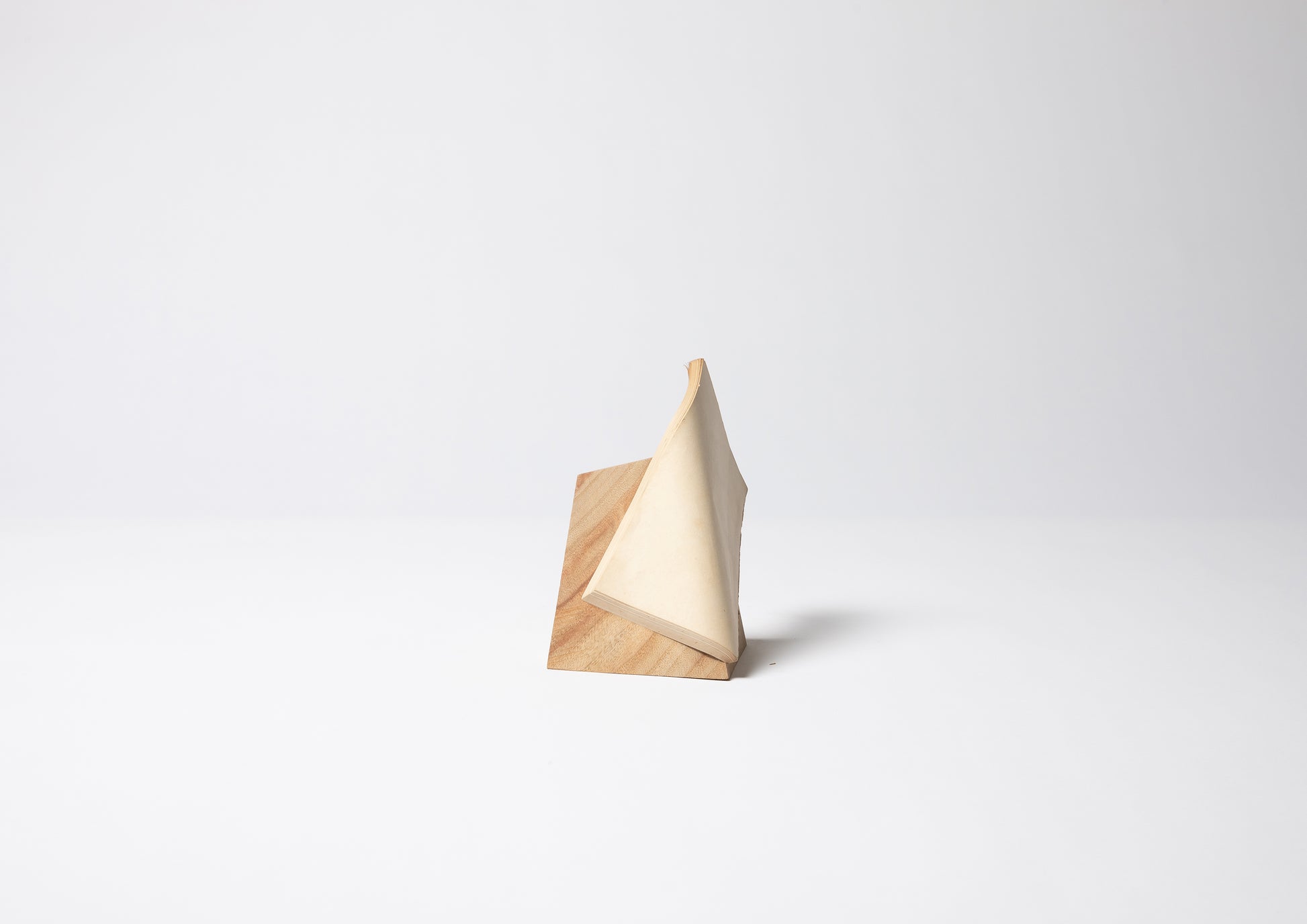 Fragile Exhibition in June 2023 is pleased to present "SILENT BOOK," a solo exhibition by Ryuta Iida. This work, which he began working on in 2019, the year of the Corona Disaster, shows a book that has passed through the hands of many people and is now crumpled. For Ryuta Iida, who sculpts from paper and used books, sculpting means sealing them, and in the past he has separated "reading" from books and sculpted a different body language, keeping the story inside. In this latest work, "SILENT BOOK," a "pedestal" appears for the first time in this act of sealing, and the book, which is said to be extinct soon, is crystallized like a fossil.