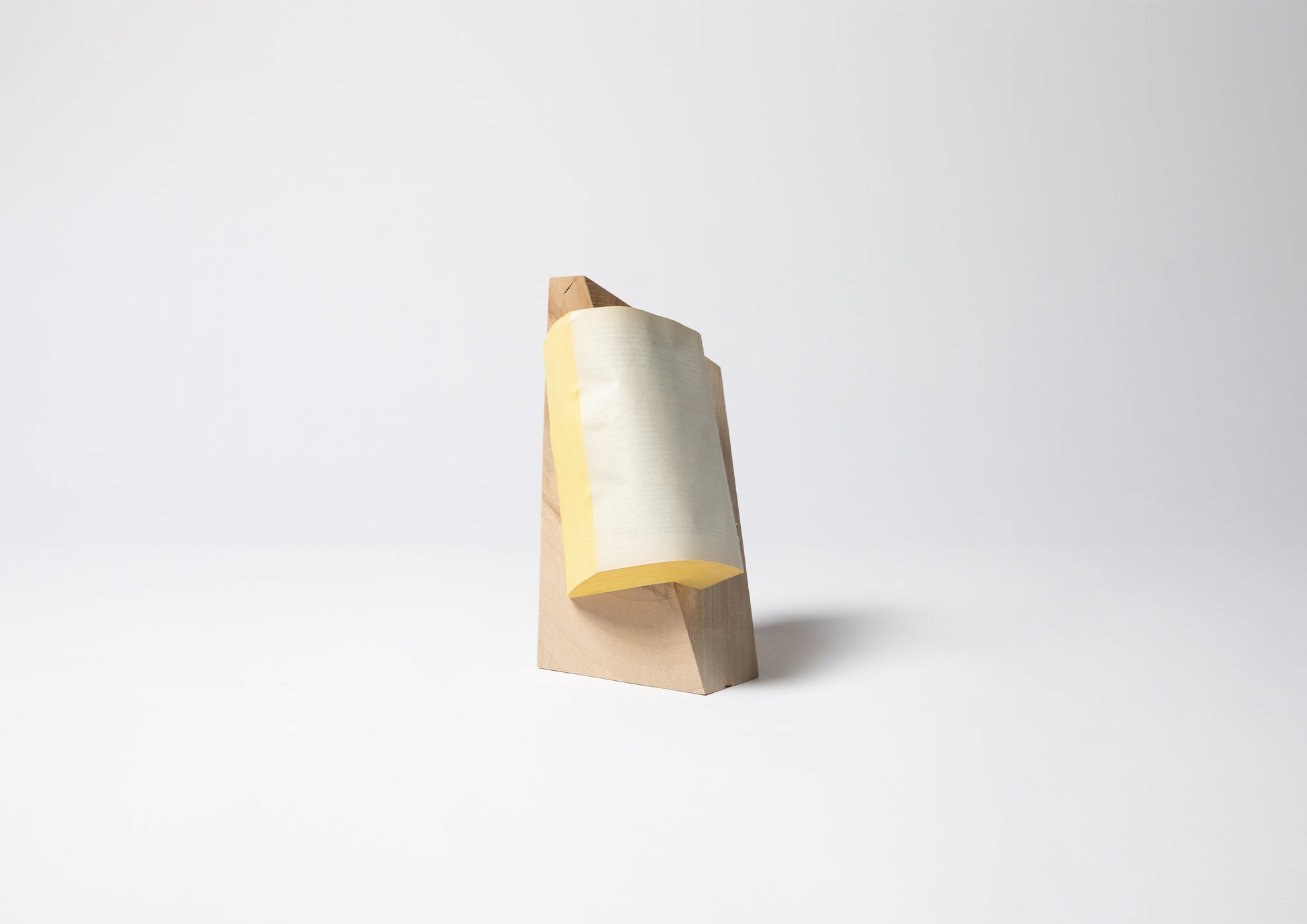 Fragile Exhibition in June 2023 is pleased to present "SILENT BOOK," a solo exhibition by Ryuta Iida. This work, which he began working on in 2019, the year of the Corona Disaster, shows a book that has passed through the hands of many people and is now crumpled. For Ryuta Iida, who sculpts from paper and used books, sculpting means sealing them, and in the past he has separated "reading" from books and sculpted a different body language, keeping the story inside. In this latest work, "SILENT BOOK," a "pedestal" appears for the first time in this act of sealing, and the book, which is said to be extinct soon, is crystallized like a fossil.