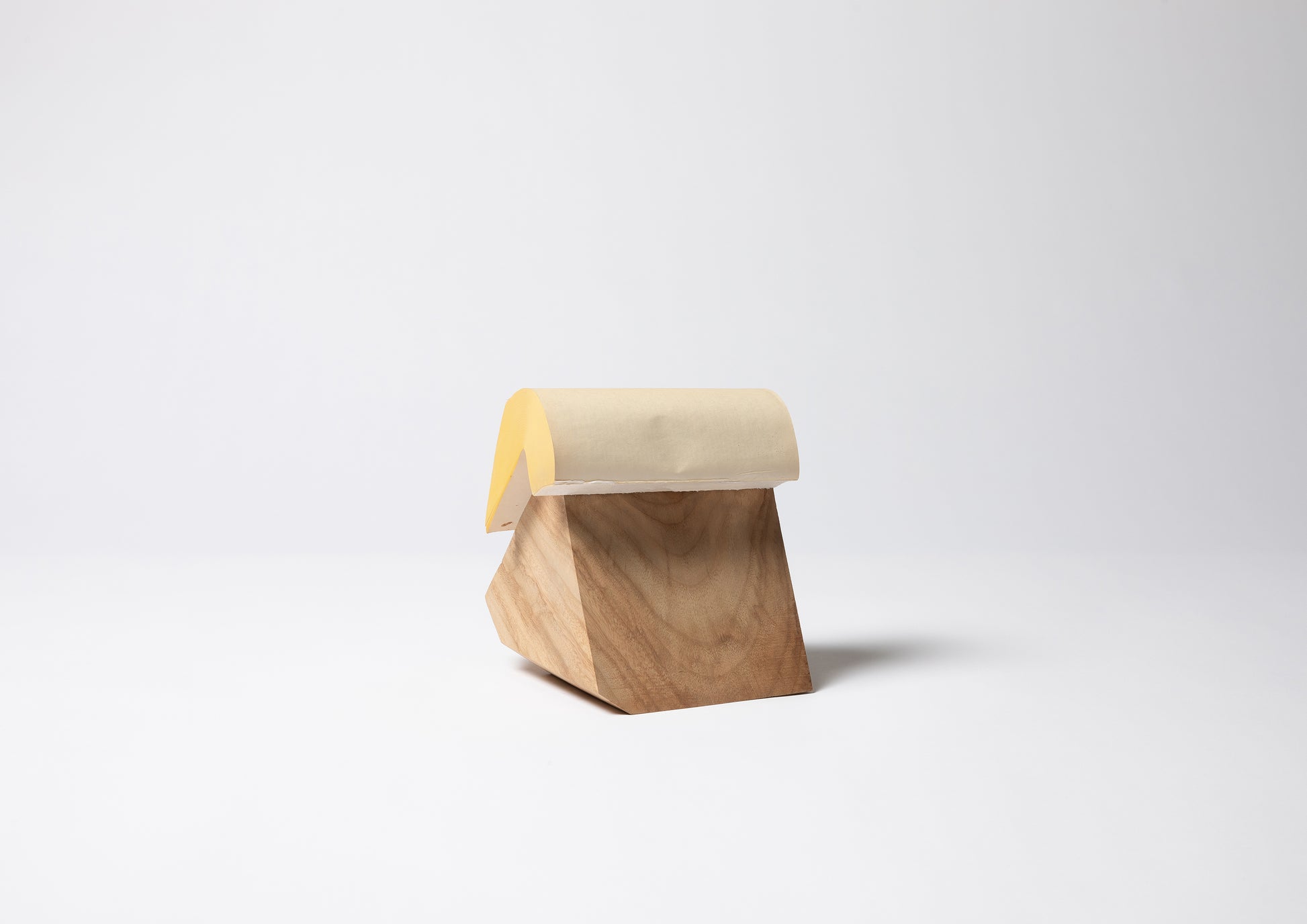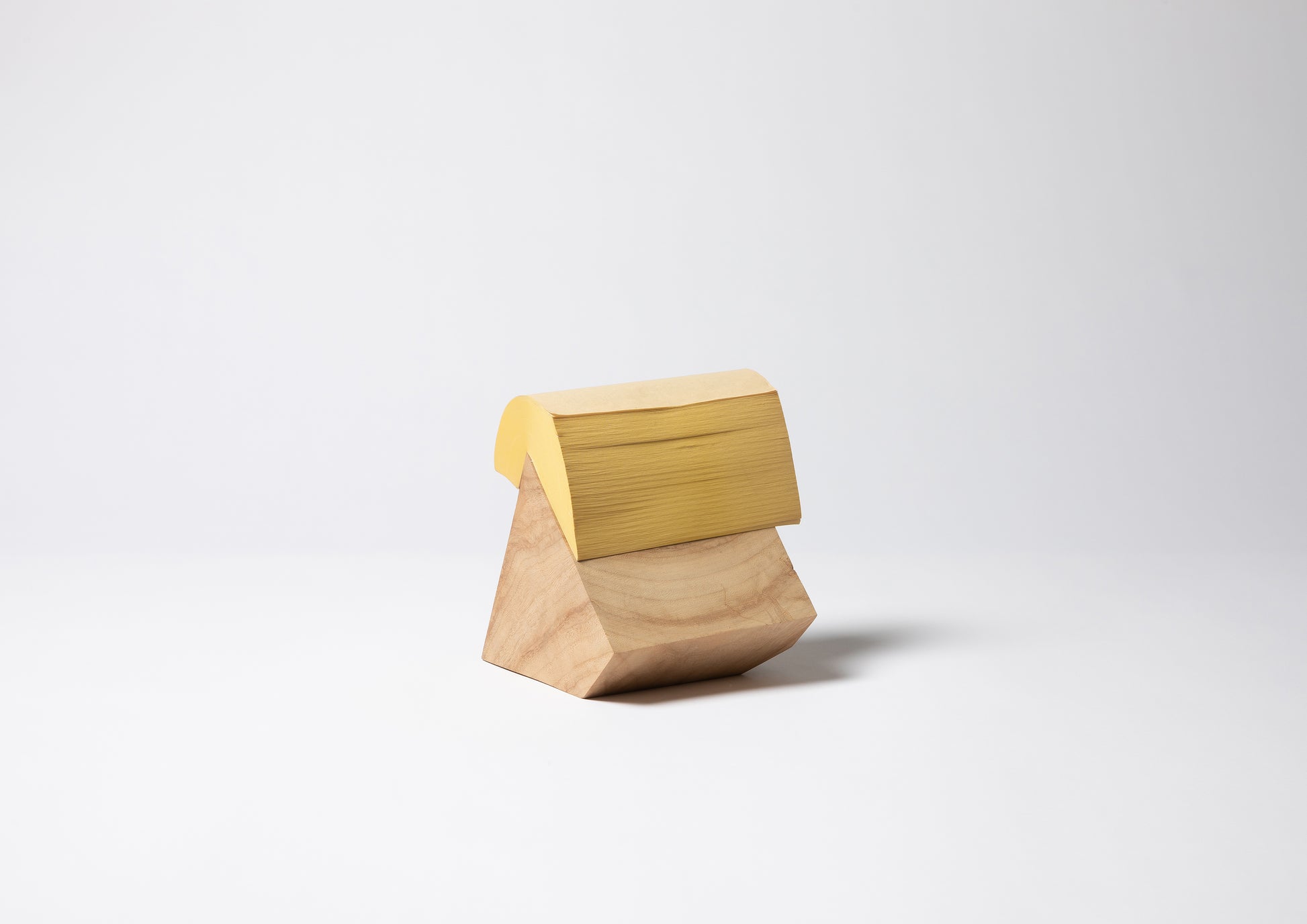 Fragile Exhibition in June 2023 is pleased to present "SILENT BOOK," a solo exhibition by Ryuta Iida. This work, which he began working on in 2019, the year of the Corona Disaster, shows a book that has passed through the hands of many people and is now crumpled. For Ryuta Iida, who sculpts from paper and used books, sculpting means sealing them, and in the past he has separated "reading" from books and sculpted a different body language, keeping the story inside. In this latest work, "SILENT BOOK," a "pedestal" appears for the first time in this act of sealing, and the book, which is said to be extinct soon, is crystallized like a fossil.