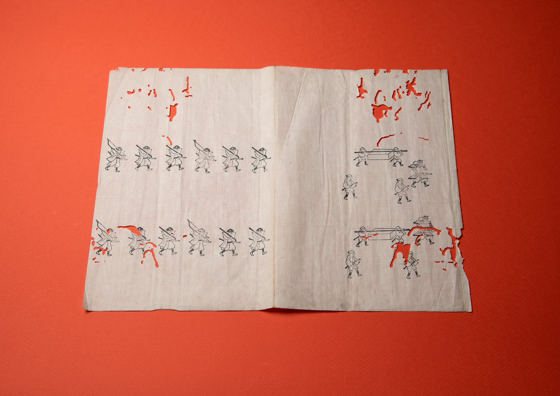 The woodblocks used in this work are of 10 types, including armored warriors, spear-group foot soldiers, archers, gunners, horse-riding magistrates, and monks. In addition, there are inscriptions about the formation of the army, such as two right-hand men, a small packing carrier, and two kitchen soldiers.
