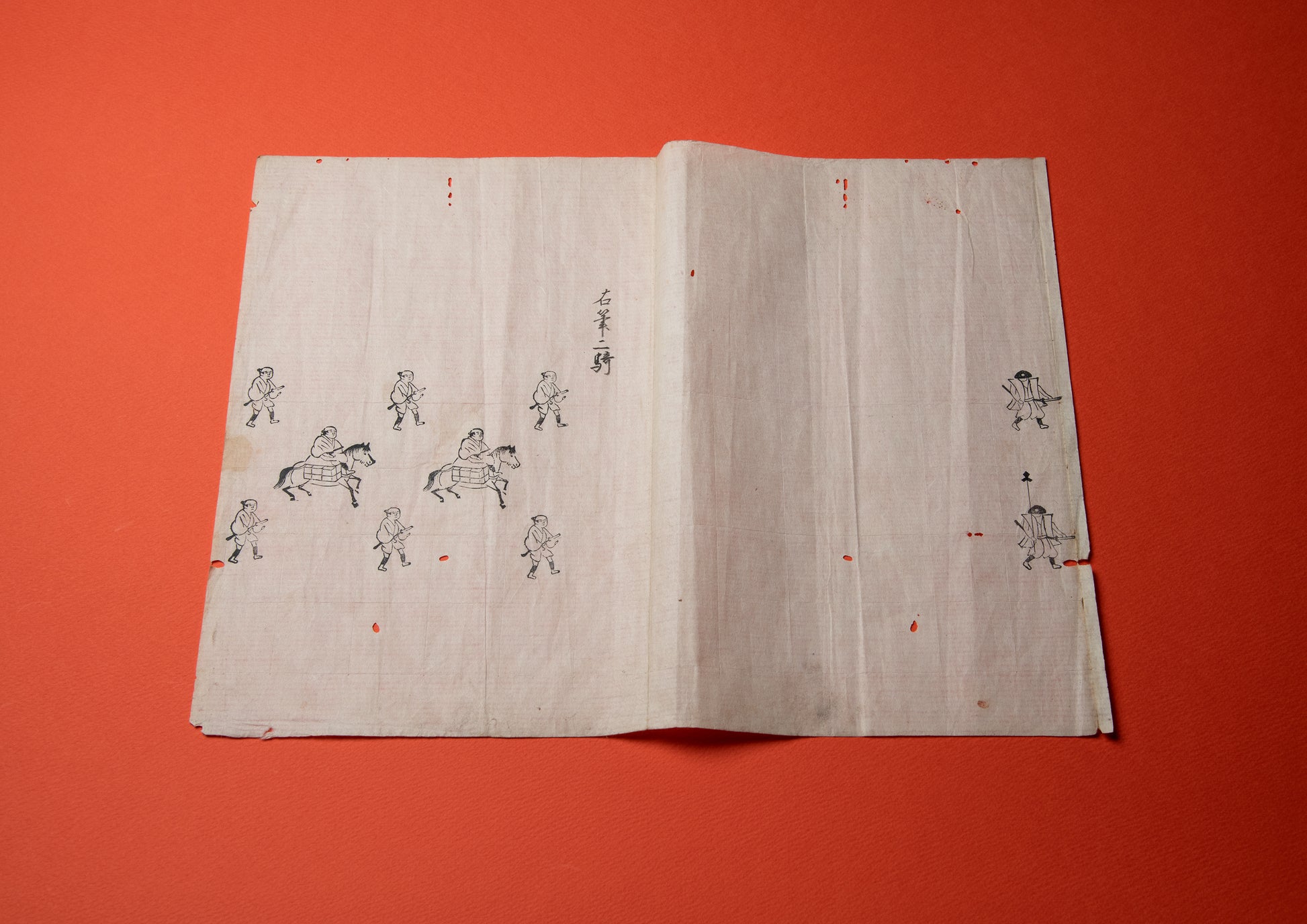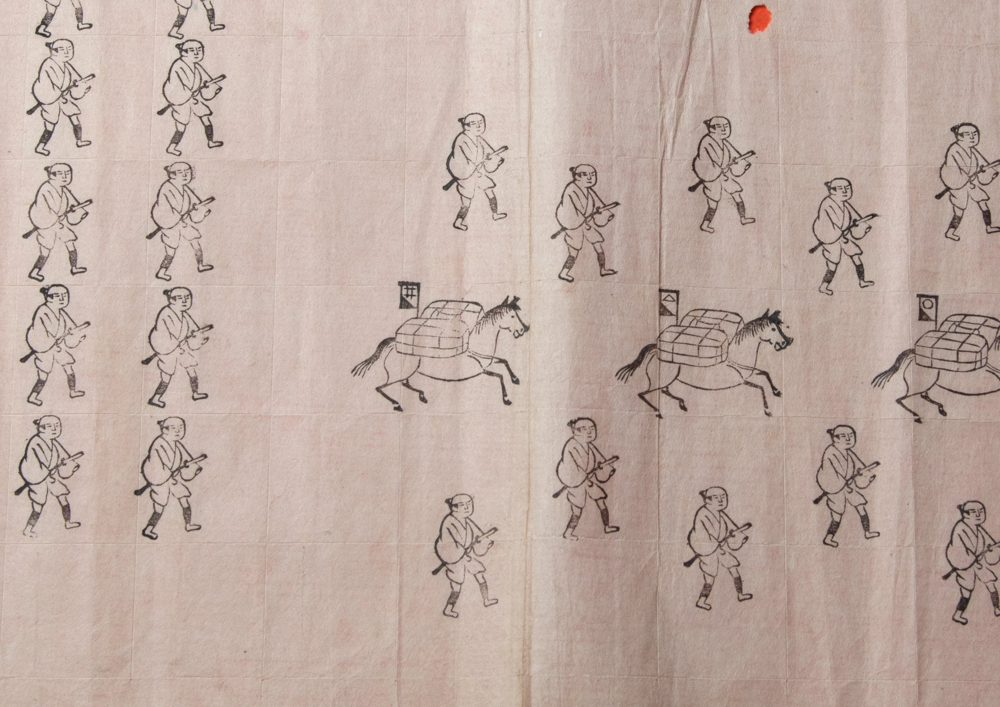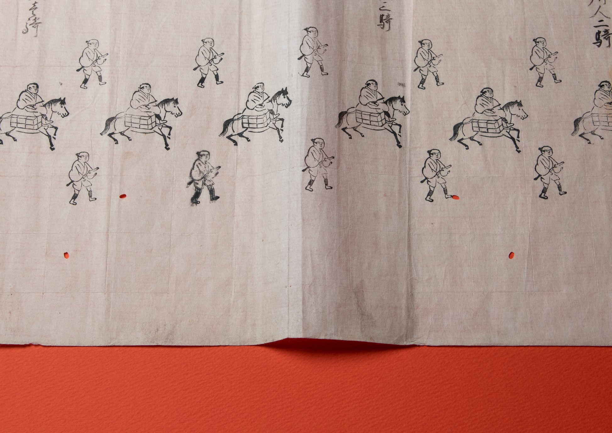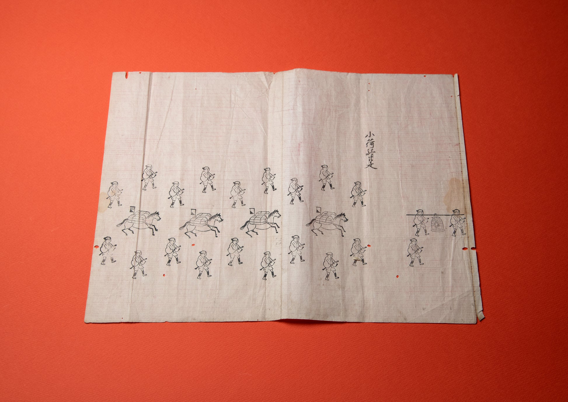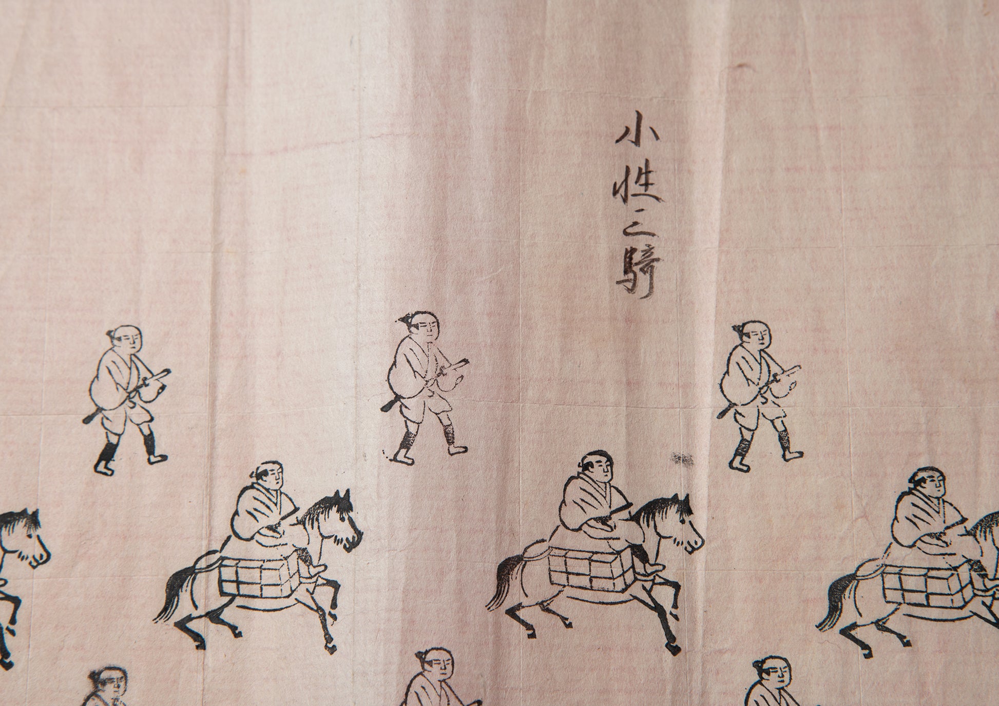 Judging from the dates of similar items, the piece is thought to date to the early to mid-Edo period, and the procession diagram, which can be seen as a symbol of samurai power, is to be made using stamps rather than hand-drawn.