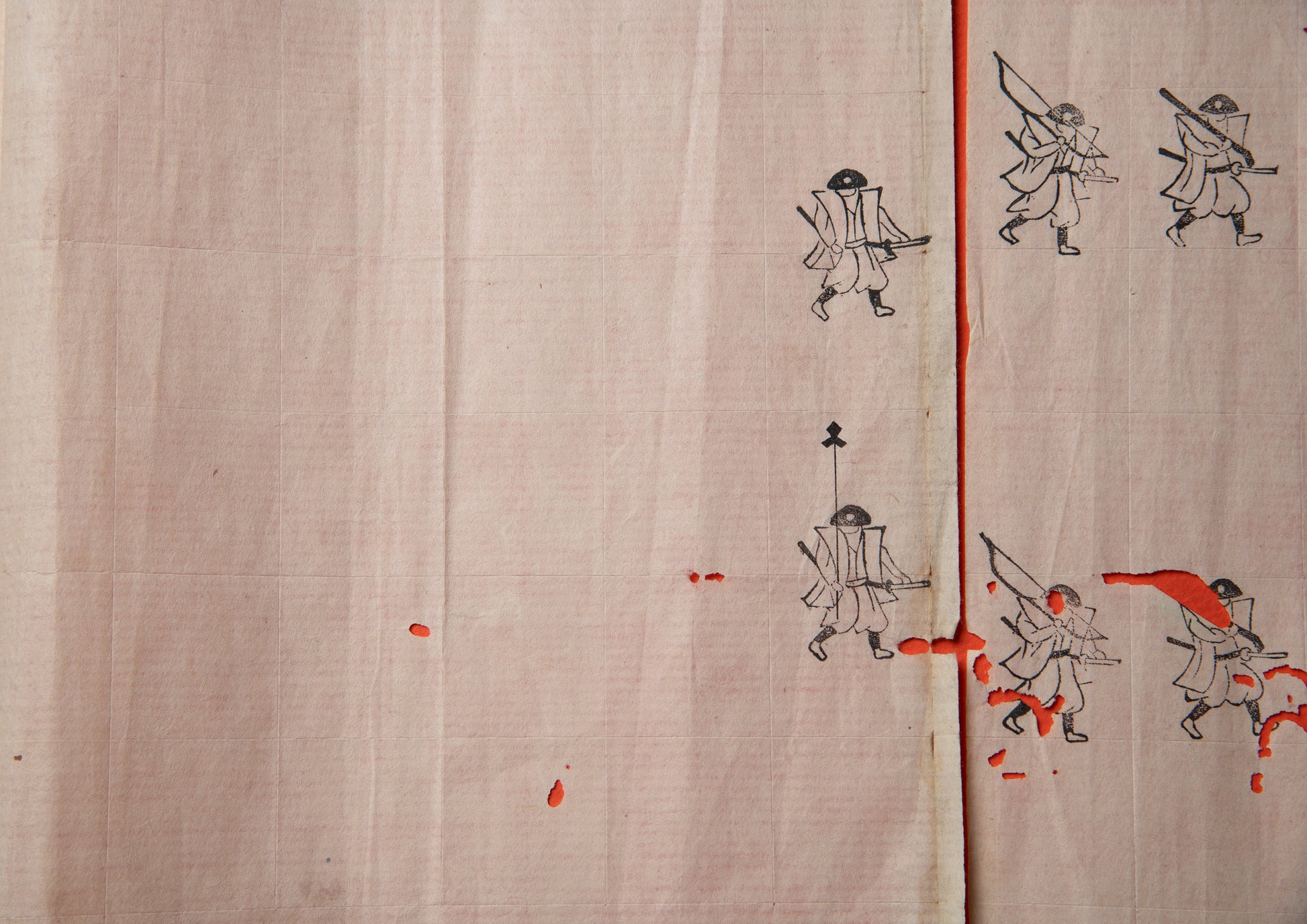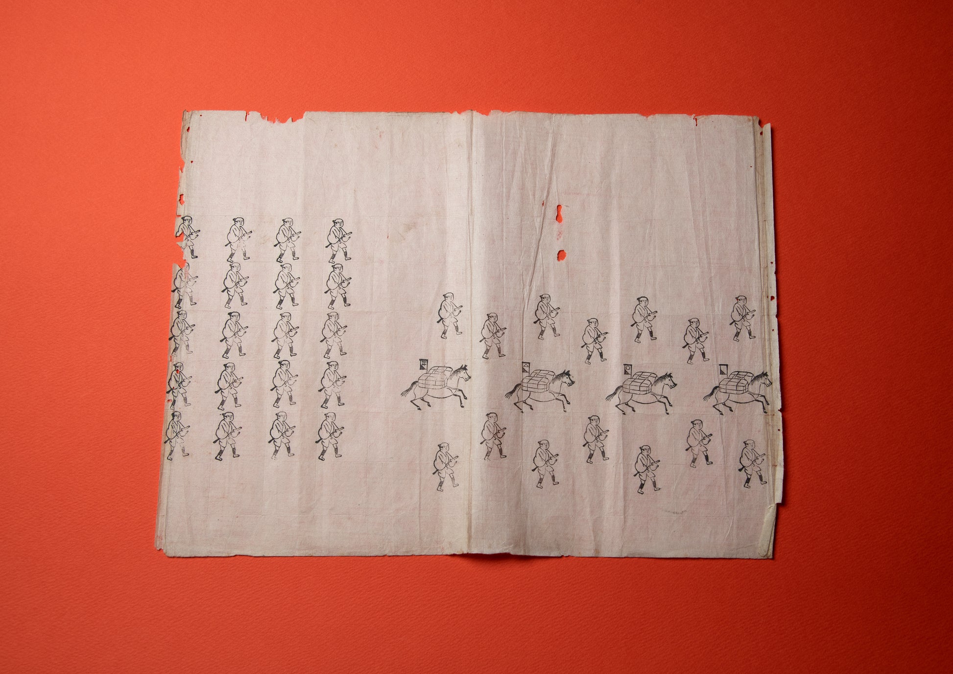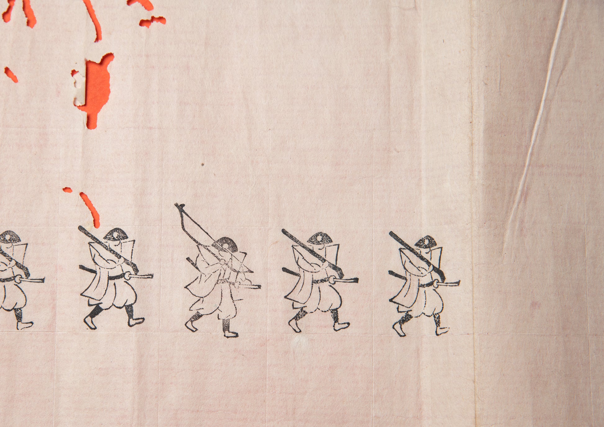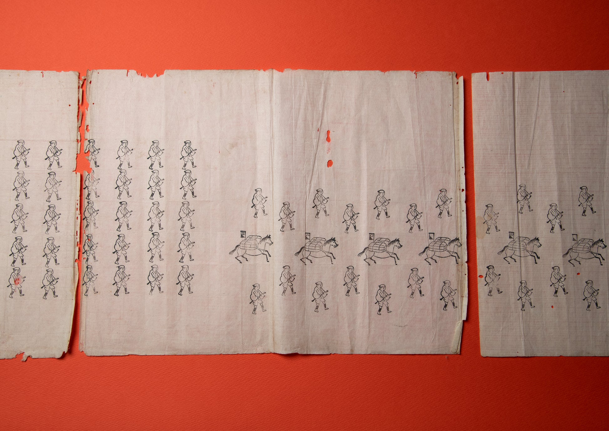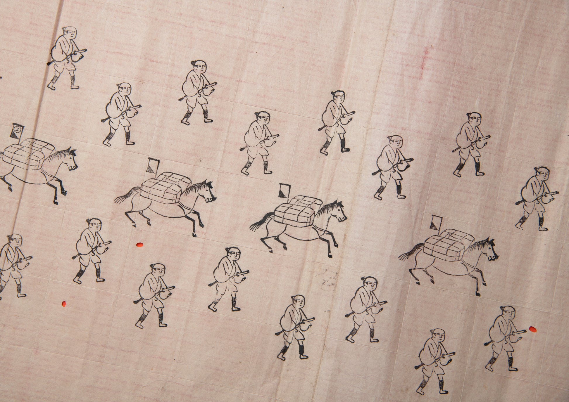Judging from the dates of similar items, the piece is thought to date to the early to mid-Edo period, and the procession diagram, which can be seen as a symbol of samurai power, is to be made using stamps rather than hand-drawn.
