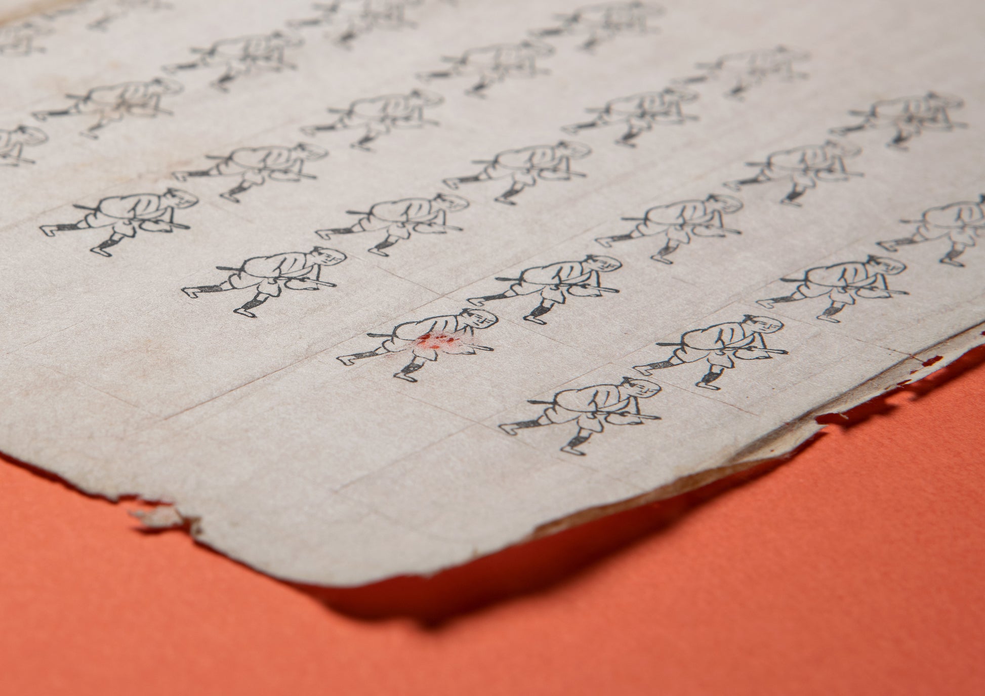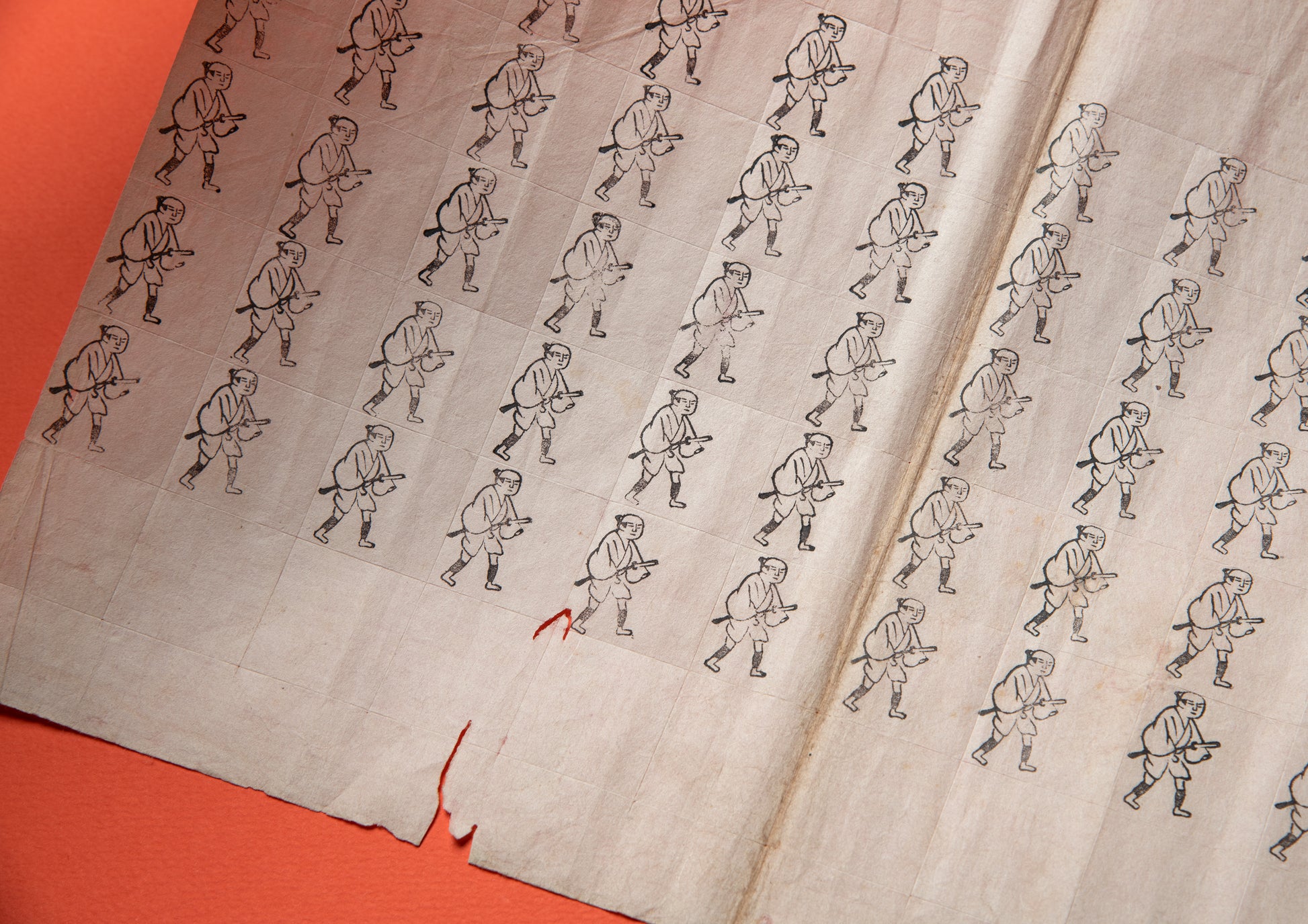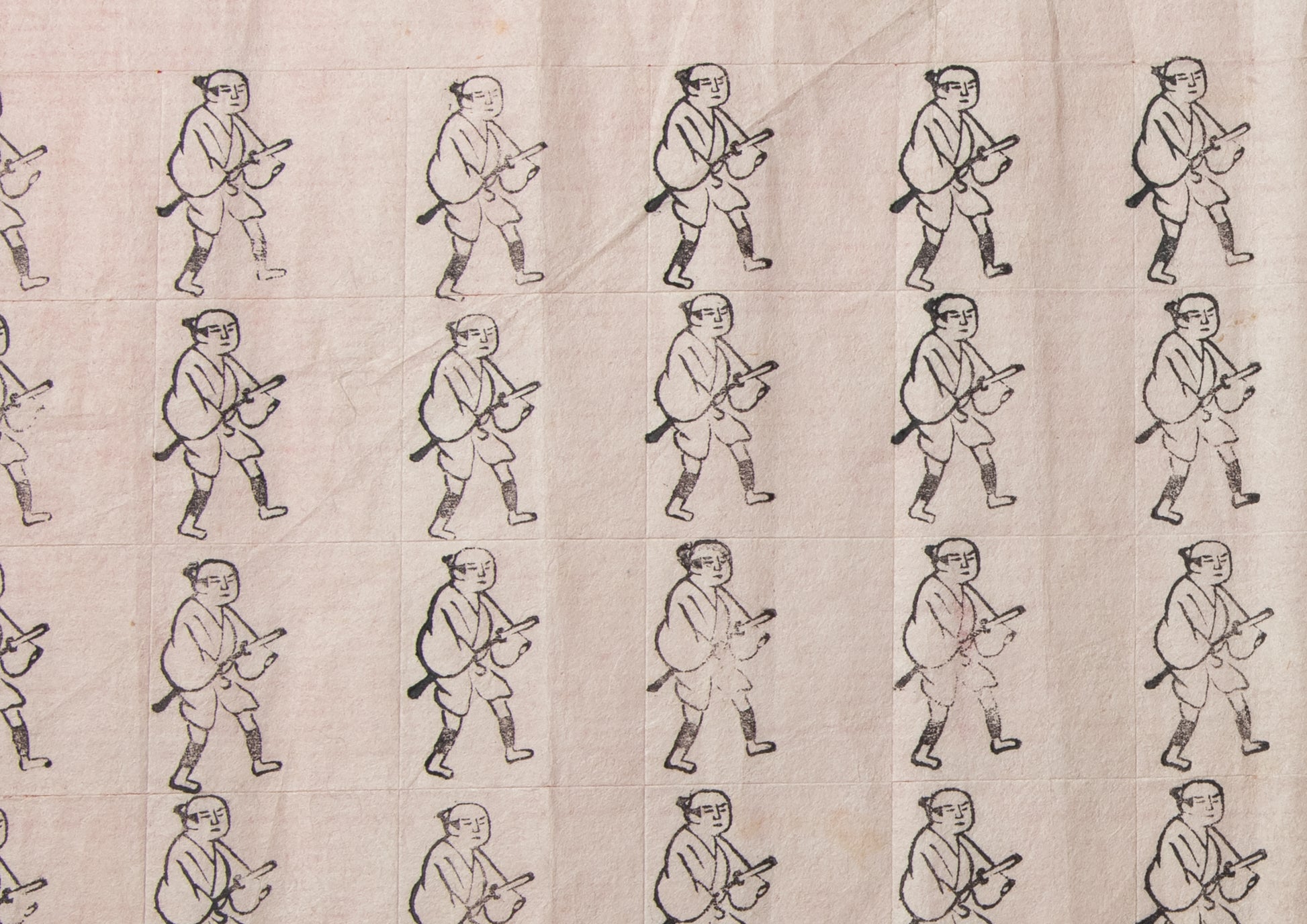 This stamp painting is actually a rare item that is hard to find, and even if you search for one created using the same technique regardless of the subject, it seems that only three libraries in Japan have it: the National Diet Library, the Japan Folk Crafts Museum, and the Waseda University Library. There are many splendid picture scrolls that depict daimyo processions, painted by samurai families to demonstrate their dignity and wealth and leave them for posterity, but most of them are hand-painted works commissioned to painters. It is said that there are other stamp versions like this one, but their whereabouts are unclear. Although it is a stamp, it is not printed, so the same work is not produced multiple times, and even when compared to stamps from similar stamp picture scrolls, the size and poses of the characters are not uniform, and there are various sizes depending on the picture scroll. Not only scrolls but also folding screen paintings created using this stamp technique have been found, and although the specific production method and time are not clear, it seems certain that there was a certain demand for them around the mid-Edo period, and a supply system was established.