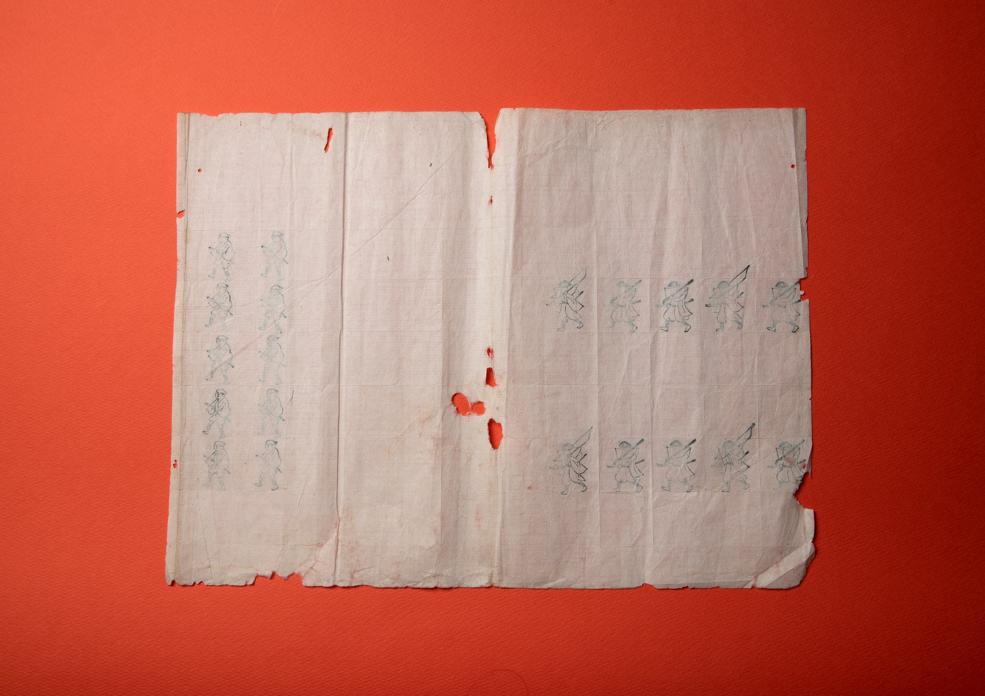 If we look closely, we can see faint creases and stamps of people and other figures are pressed along these creases, which suggests that this was probably a preliminary sketch.