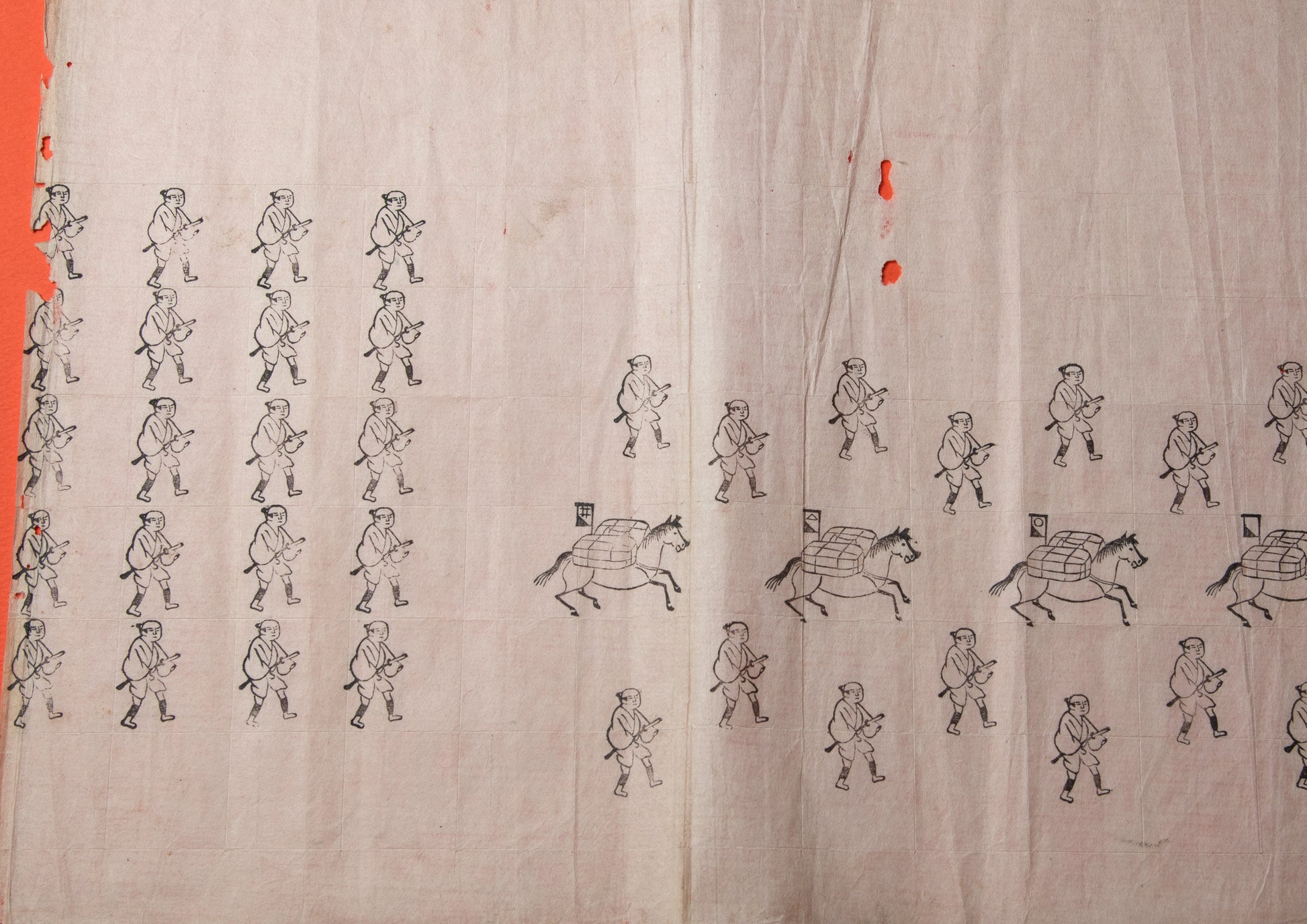 However, all you need is woodblocks depicting warriors and foot soldiers, and ink. That's it. All you have to do is stamp the same woodblock over and over again like a stamp to record the formation. It's a bit dizzying to think how many times it must have taken to make a scroll.