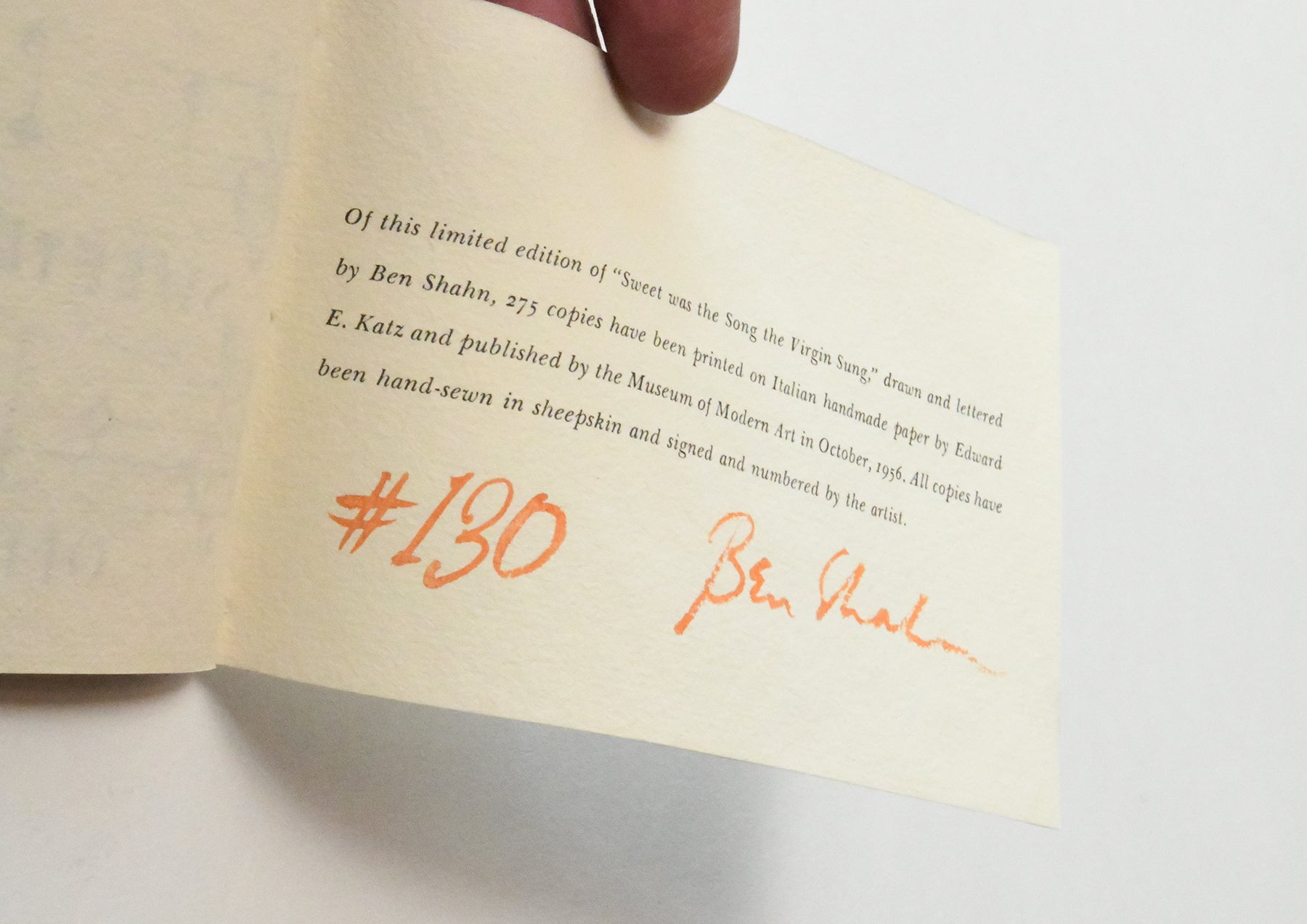 This book is one of 275 limited editions released by MOMA (Museum of Modern Art, New York) in 1956. That same year, Ben Shahn exhibited at the MOMA exhibition "Modern American Art: Painting, Sculpture, Prints," but the connection to this book is unclear.
