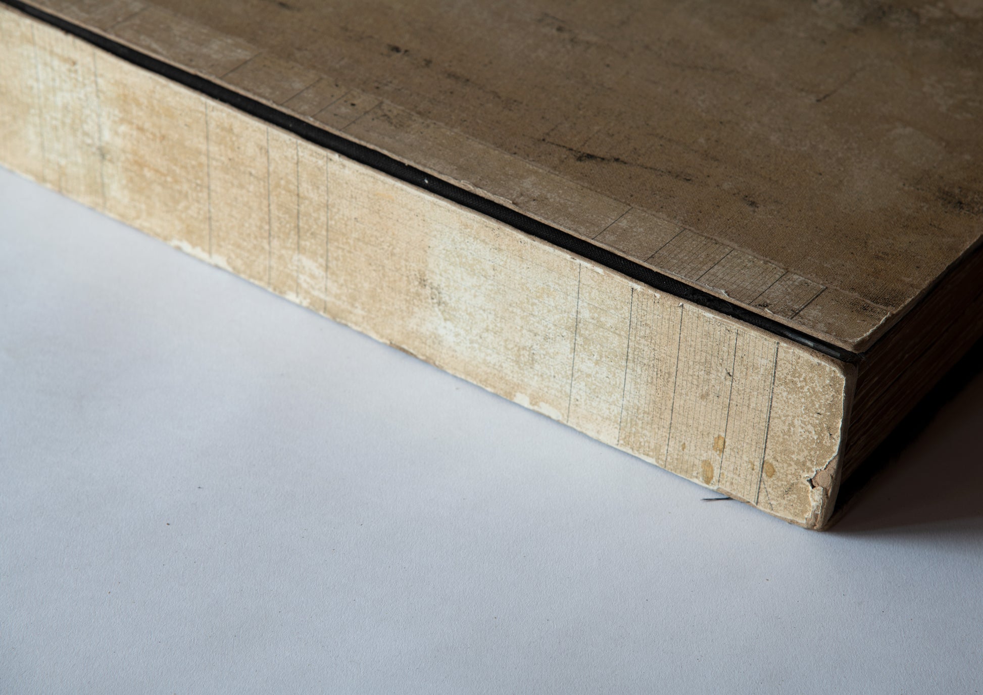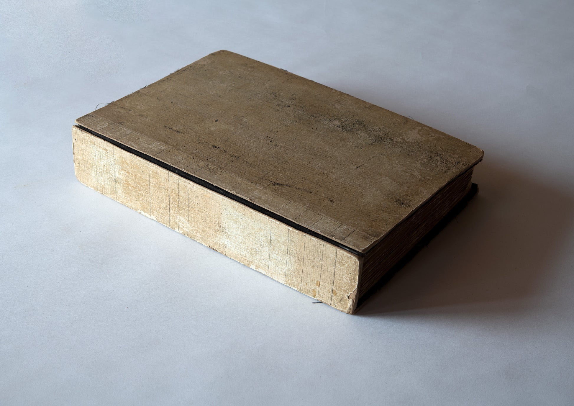 Overseas fabricsThe sample book isThe basic format is a large, thick book bound in hardcover. The pages are heavy because the main text is covered with a lot of fabric. As a result, the pages can no longer withstand the weight over time,The front and back coversPeeling off from the textThe book being exhibited at this exhibition has the black cloth used for the cover peeled off, but this shows us that the presence of a large, thick book that was once properly bound is not diminished even if the cover comes off, but rather becomes more impressive.