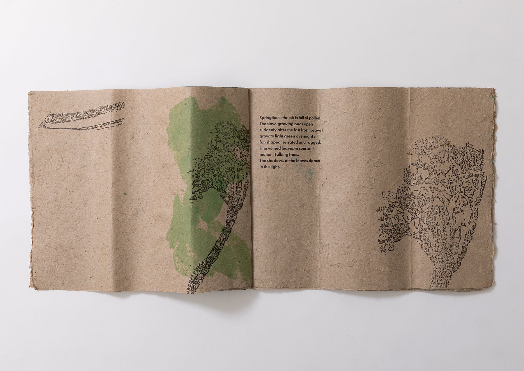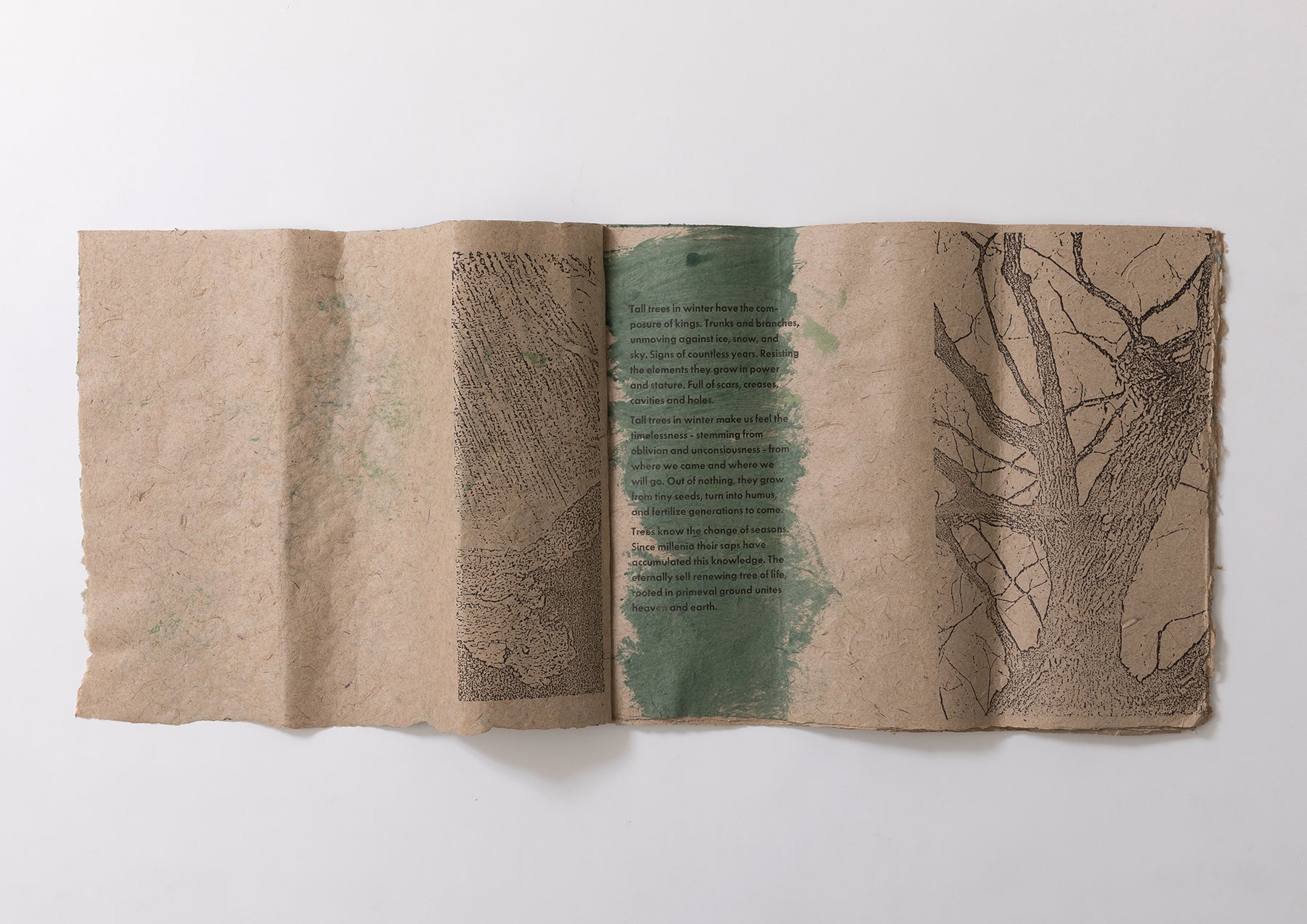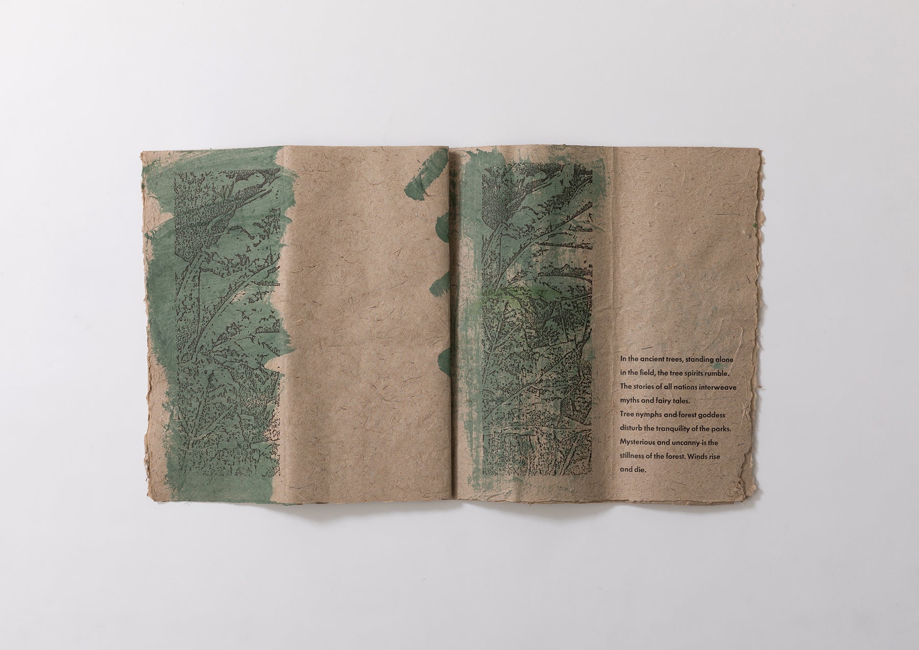 The material for the illustration is a maple tree. It is a giant tree over 200 years old that grows in Poestenkill, New York, about a three-hour drive from Manhattan. The printing is done by Kaldway himself using letterpress. The type is 30-point Futura (as stated in the colophon). And the paper is cedar bark paper by Tono Shusaku. Only 40 copies were made in the world.
