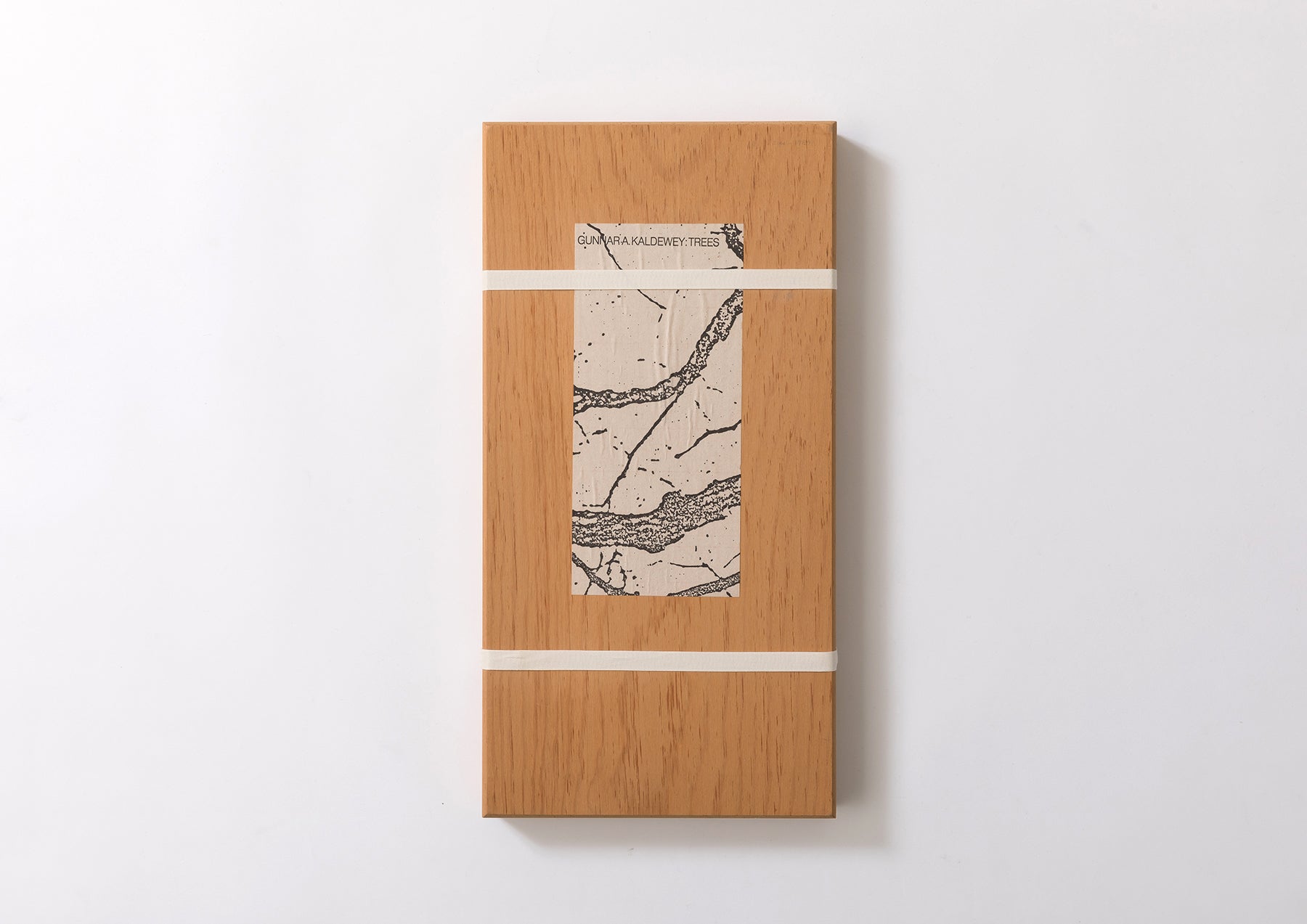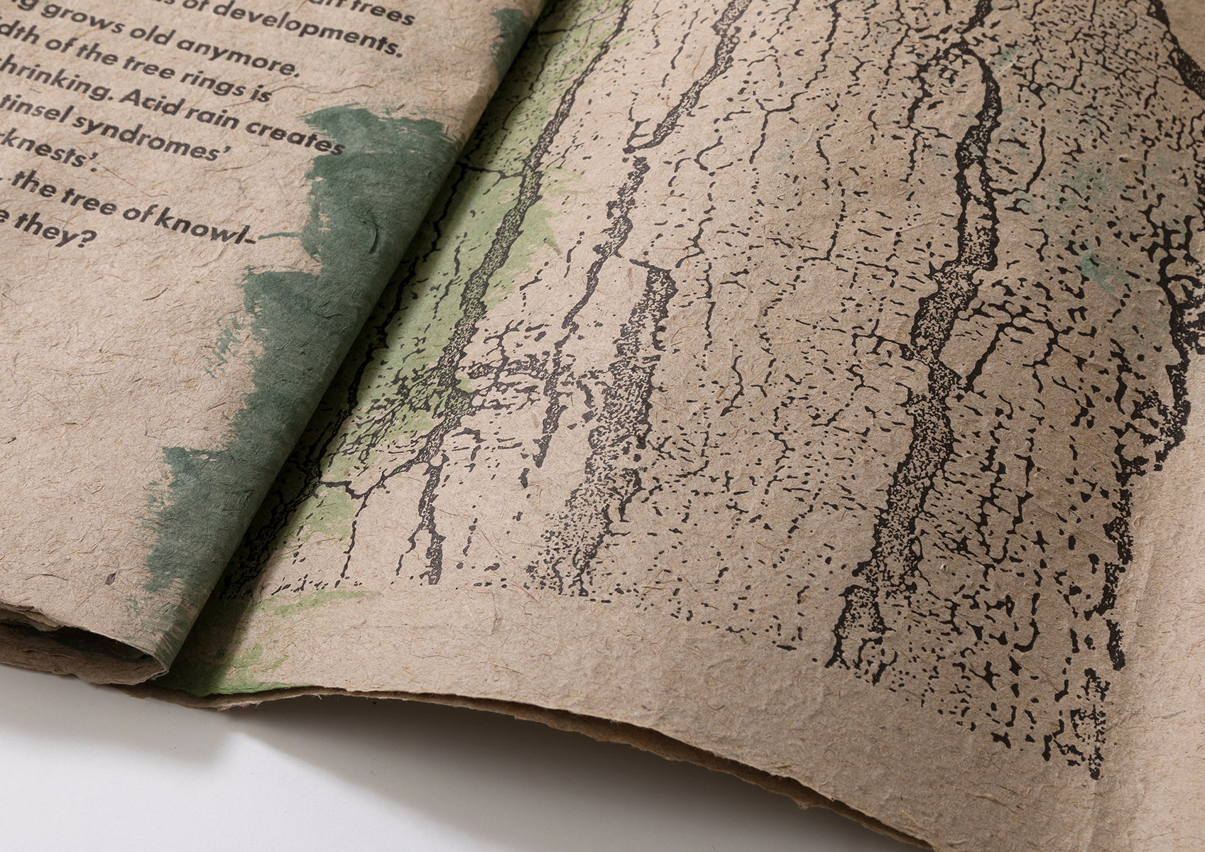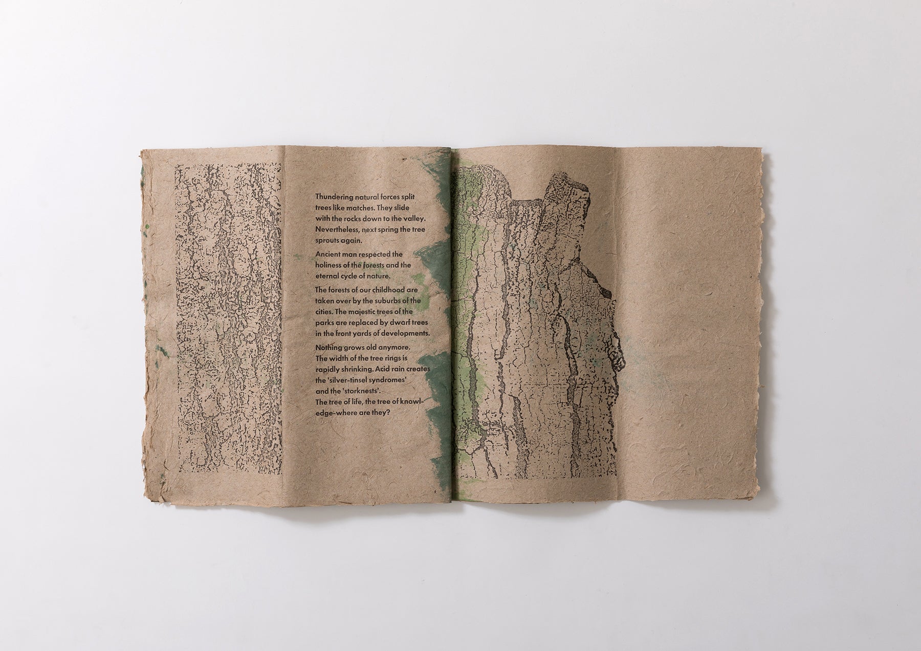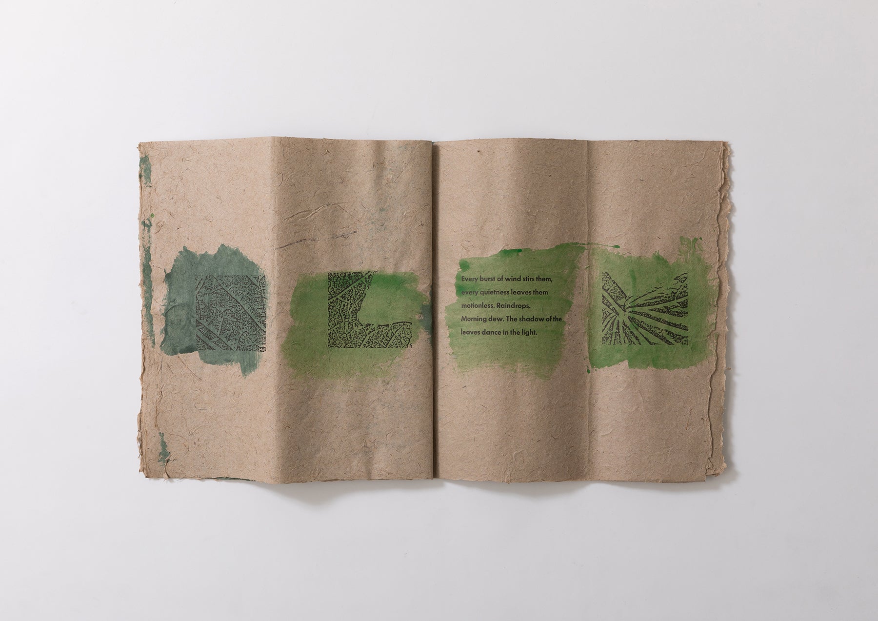 The material for the illustration is a maple tree. It is a giant tree over 200 years old that grows in Poestenkill, New York, about a three-hour drive from Manhattan. The printing is done by Kaldway himself using letterpress. The type is 30-point Futura (as stated in the colophon). And the paper is cedar bark paper by Tono Shusaku. Only 40 copies were made in the world.