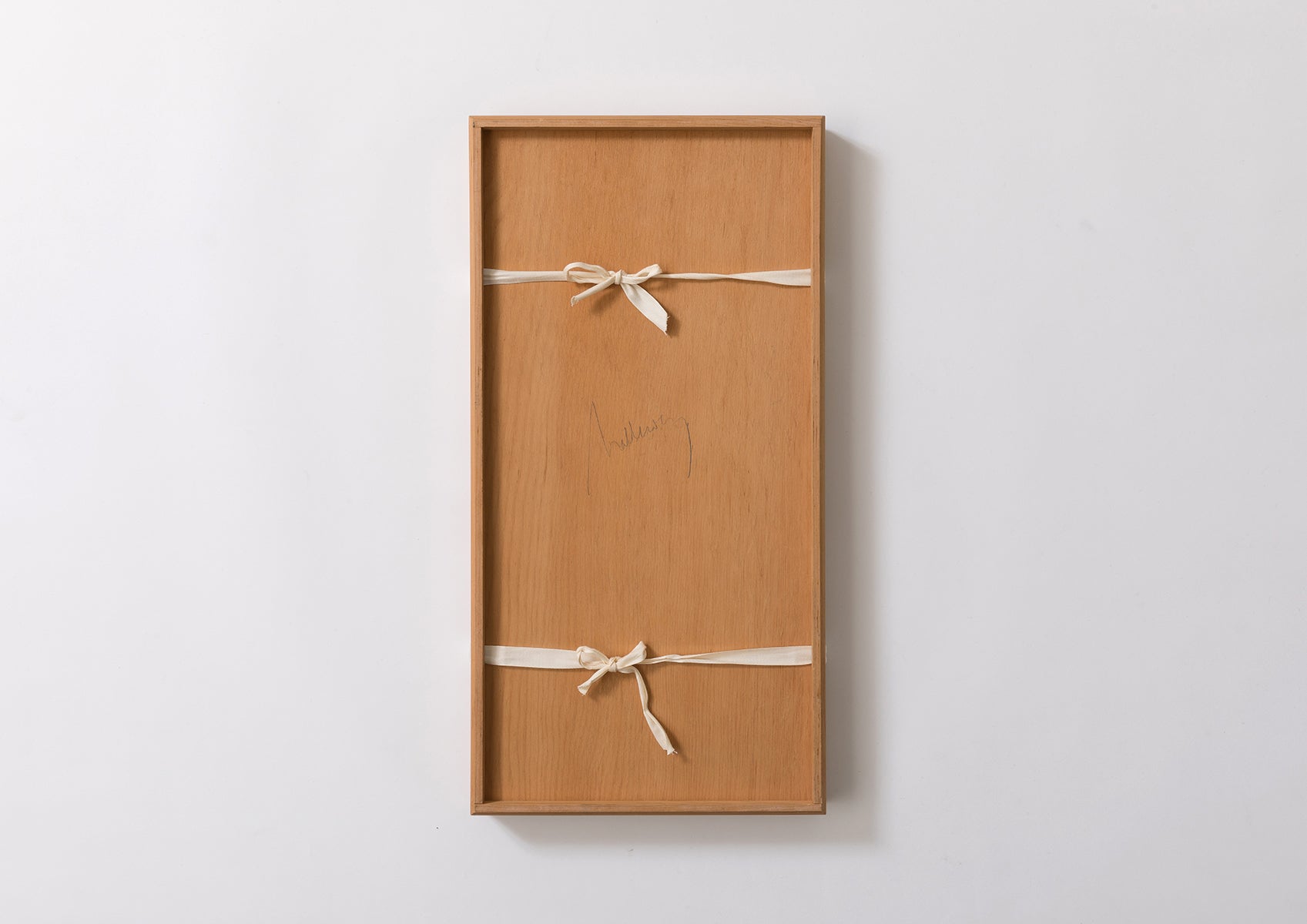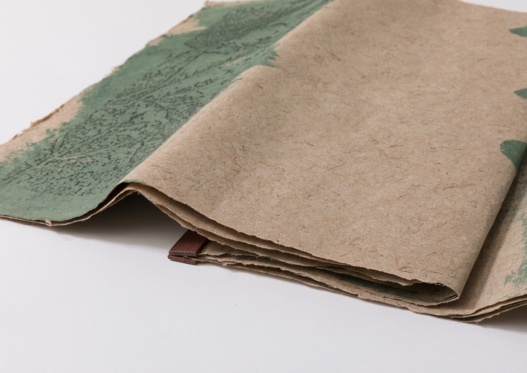カルドウェイ本人のサインつき。きめの粗い茶色の杉皮紙7枚に、さまざまな緑の色合いの手彩色と、17のリノカットがモノプリントされています。本体は観音開きで3分の1の寸法に折りたたまれ、プライウッドの木箱に収められます。箱のふたには、大きなラベルが貼られ、木箱全体は、リネンの平紐で固定されます。