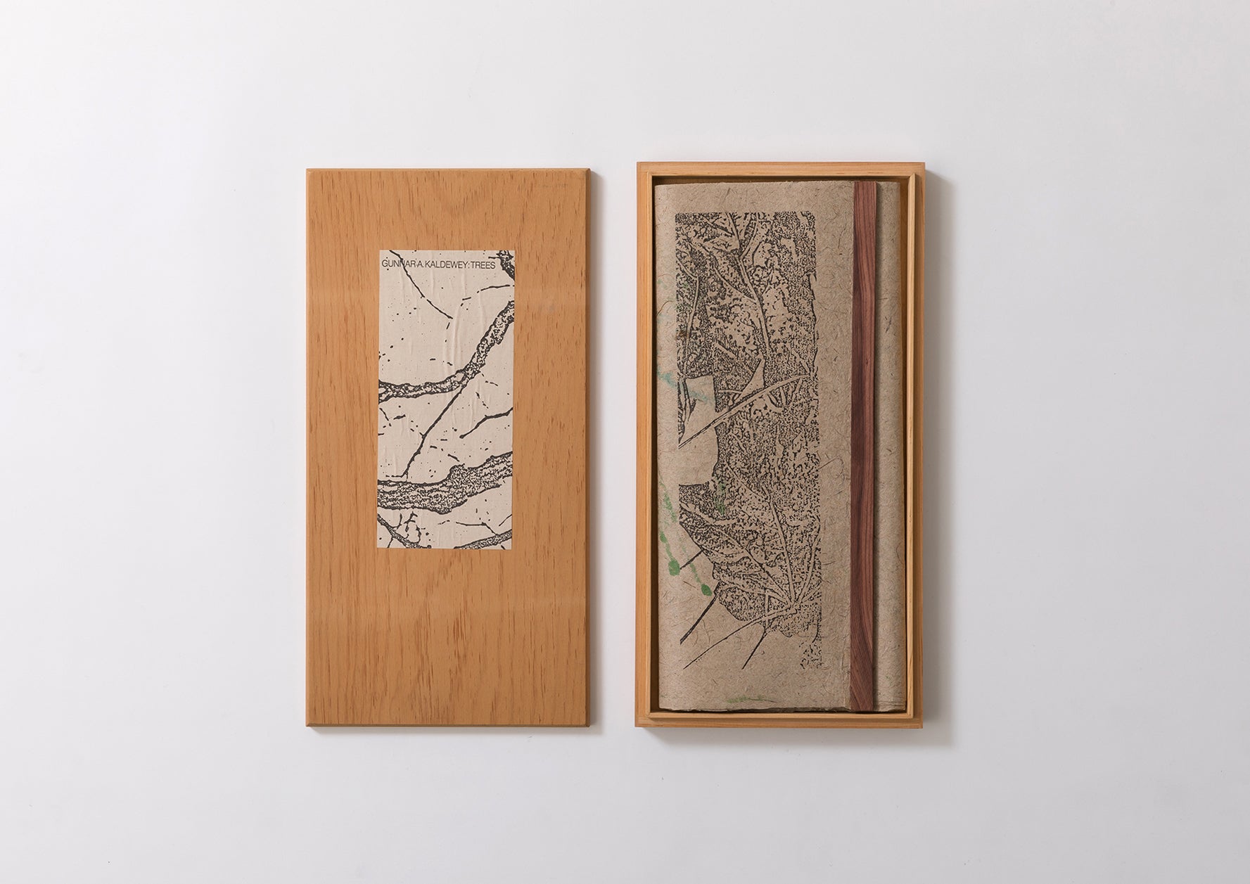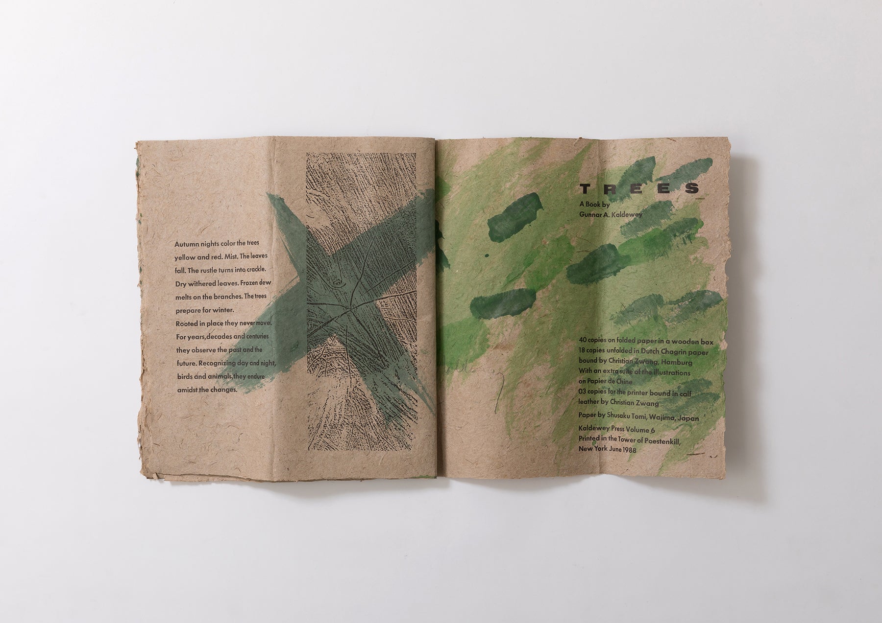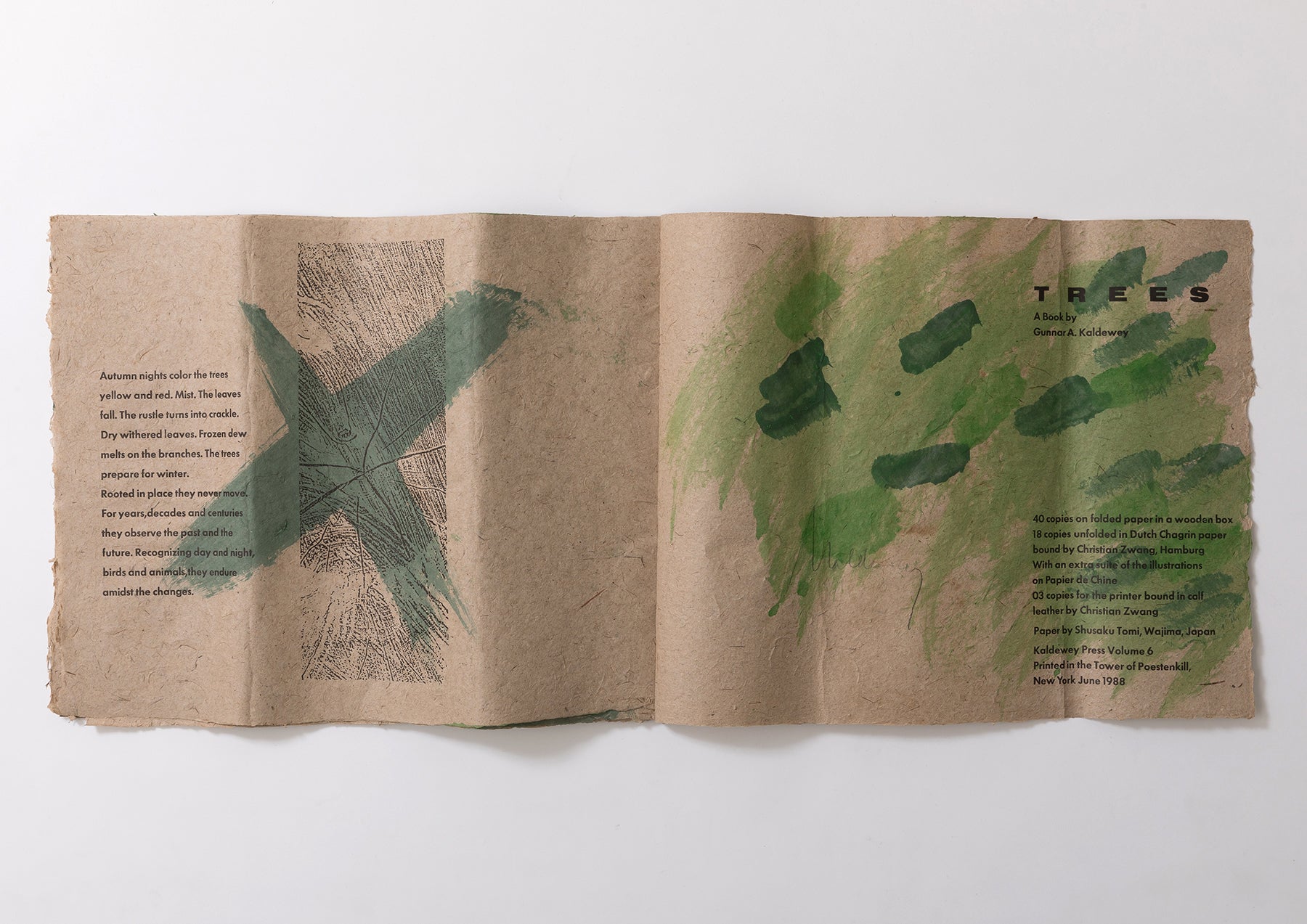 Thus, Gunnar Kaldway chose Shusaku Tonoumi of Wajima, a master of natural art, to complete his concept of "Trees." He ordered cedar bark paper, traveled to Poestenkill to create illustrations from a 200-year-old maple tree, and released a limited number of copies through his private press, Kaldway Press. This is indeed a remarkable work.