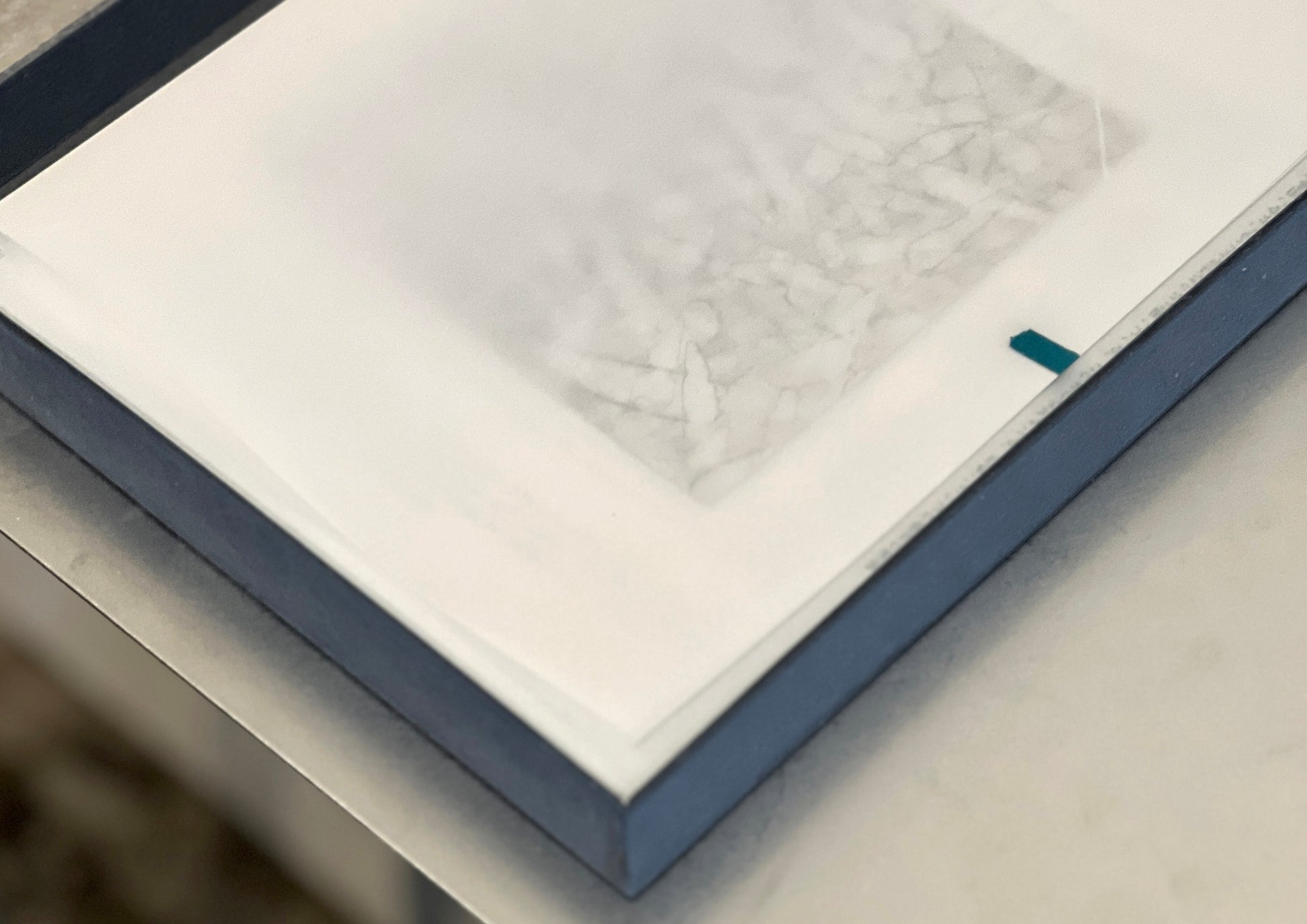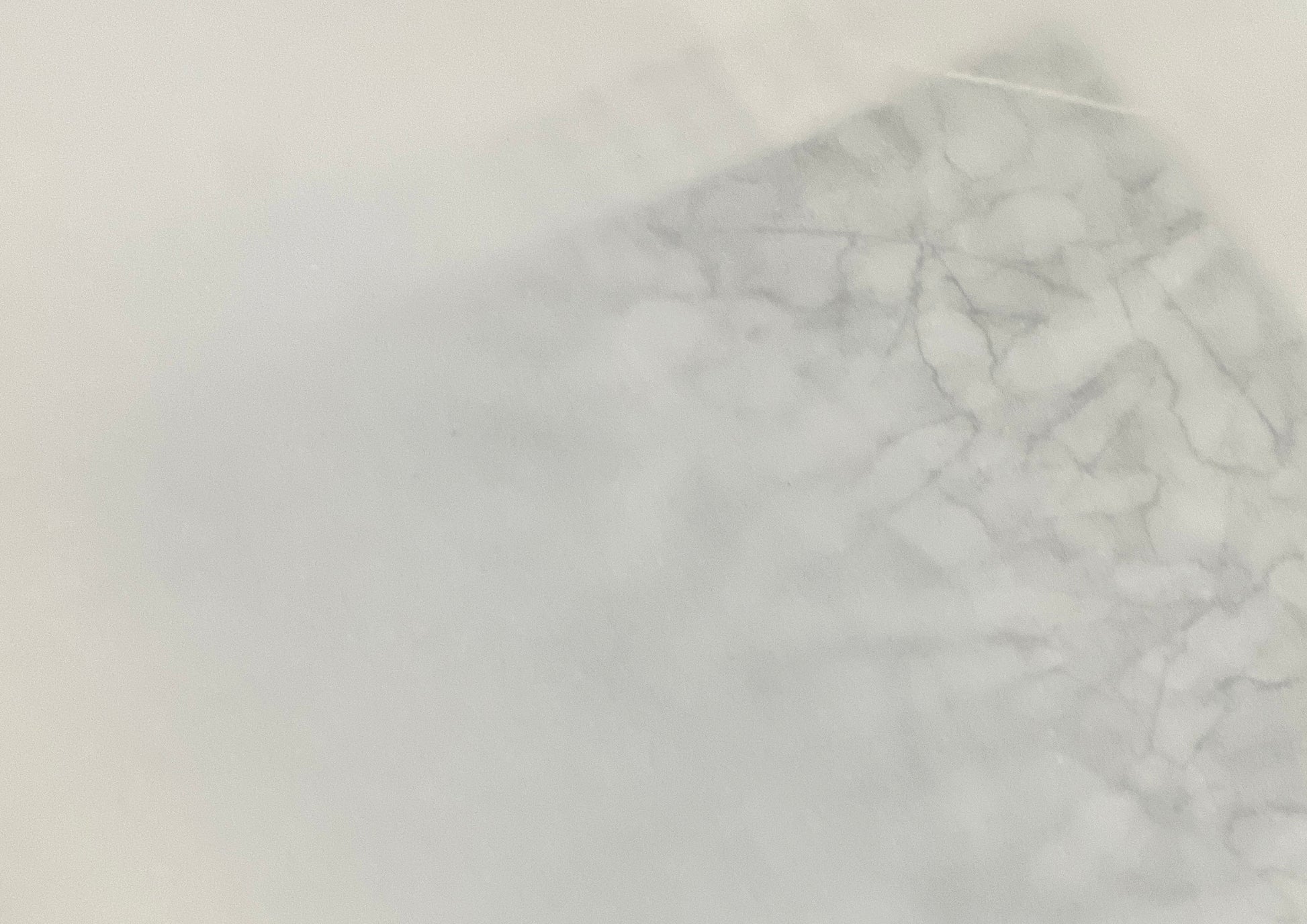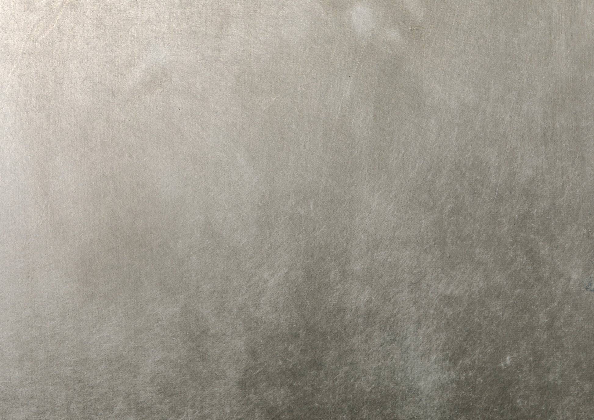 金属の板もむき出しではなく、極薄の雁皮紙が貼られています。色味や表情はそのままに、透けるほどの薄さです。近くでよくみると、糊を伸ばすときの刷毛目や小さな糊の塊、触れた指の痕跡が残っていて、均一な金属の板を一点ずつ異なる表情に変えています。